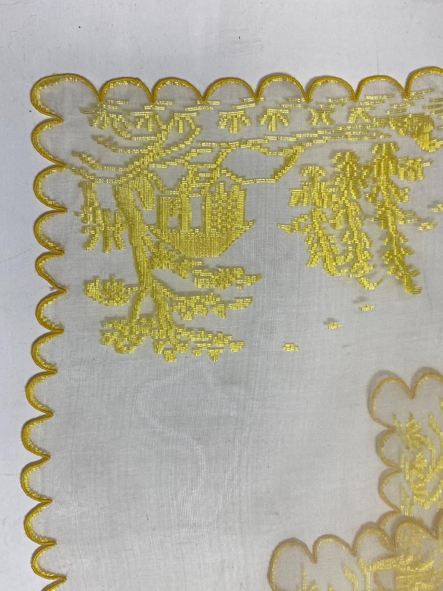 Vintage Sheer Yellow Cabin Scene Embroidered Square Placemats and Coasters. In good condition. Set of 4 each.