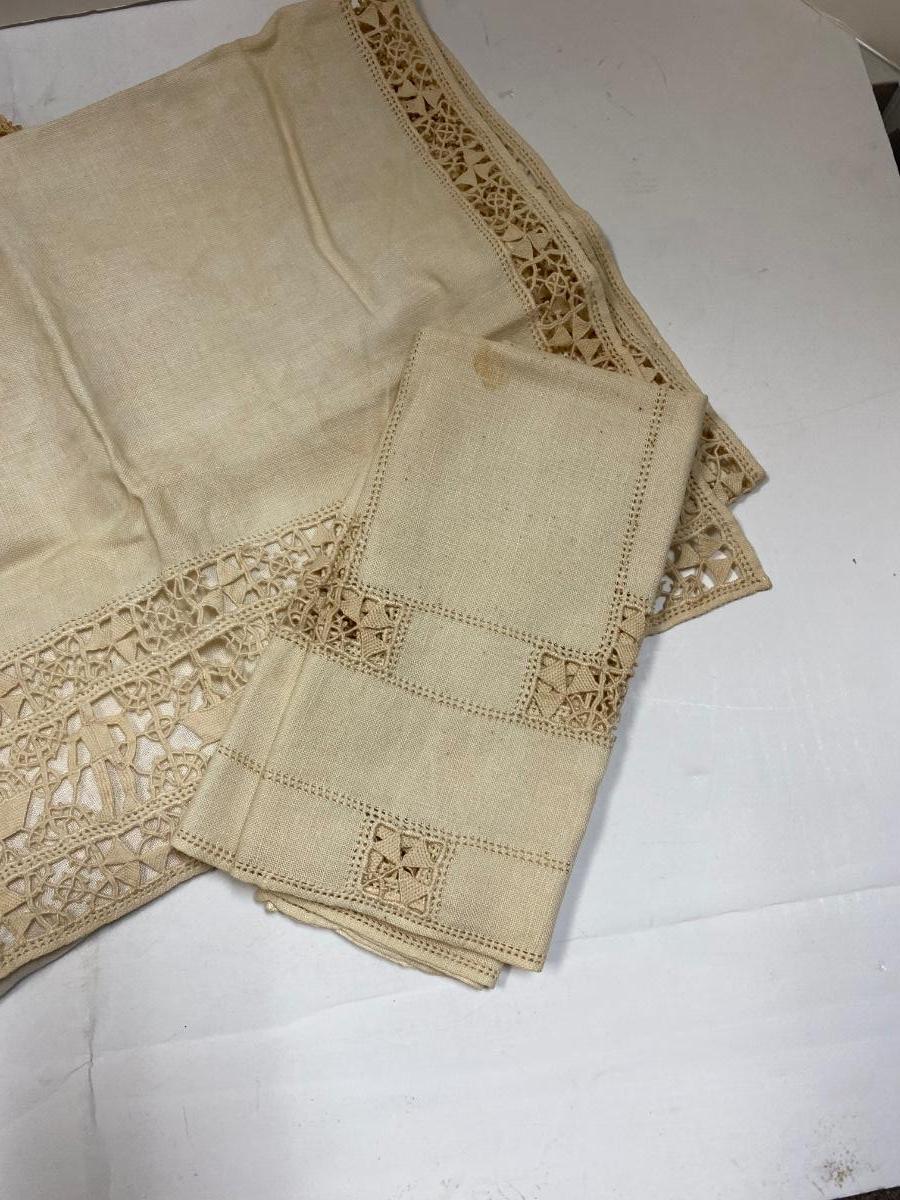 Vintage Antique Pair of Table Runners and Couple of Linen Napkins. They have discolor, may have spotting.