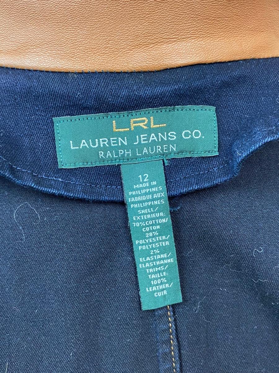 Ralph Lauren Jeans Co Over Dyed Blue Denim Fitted Jacket Size 12. In good condition. Fitted cut, fabric does have light stretch to it. 100% leather collar trim.