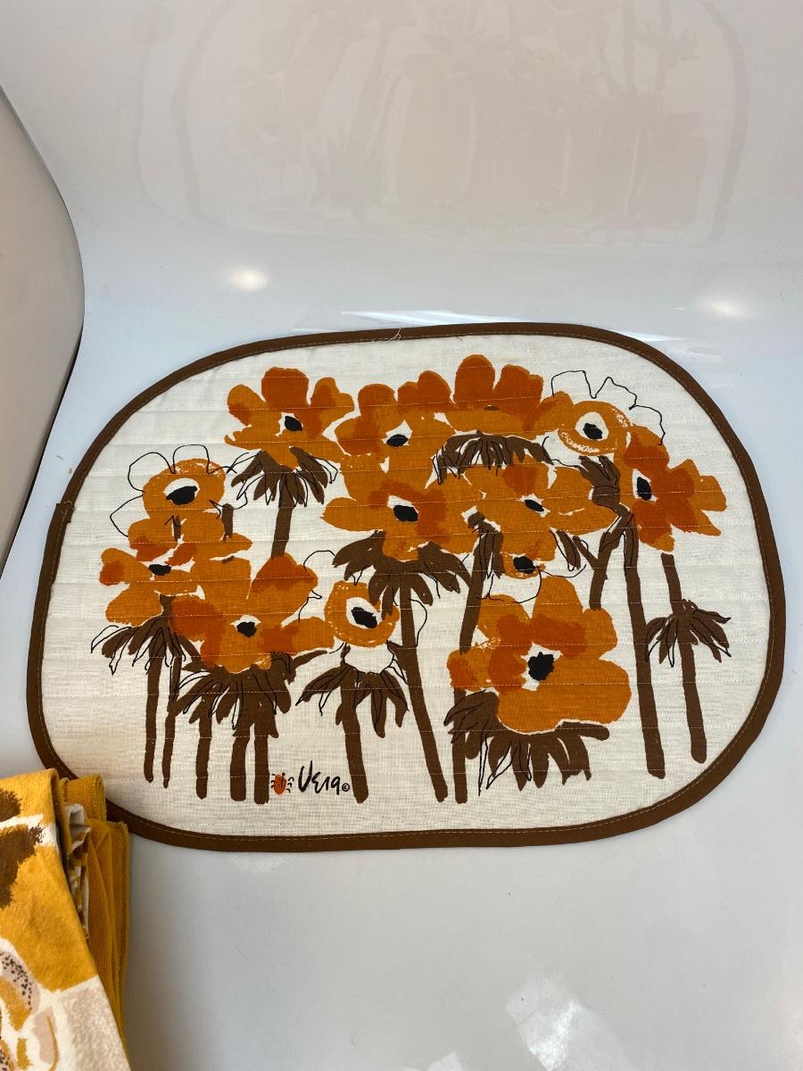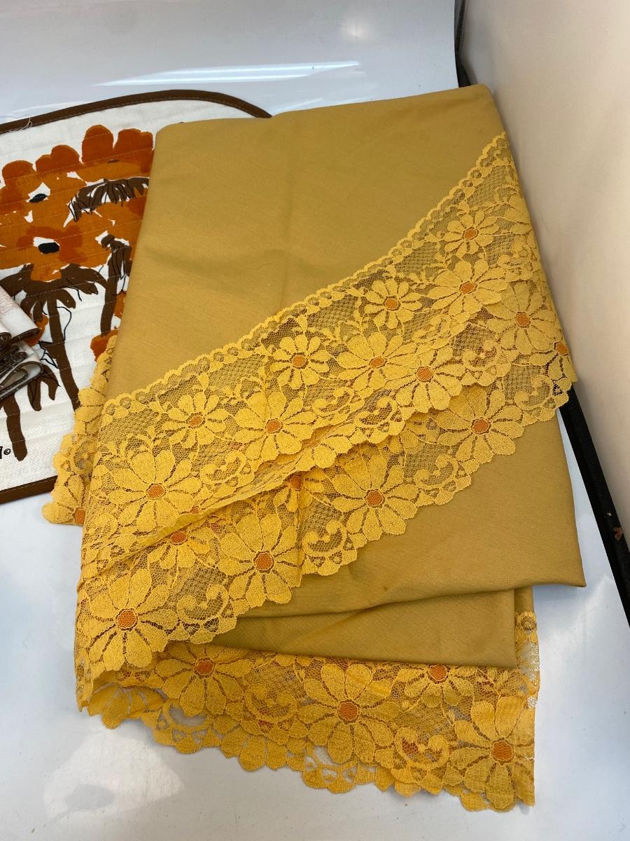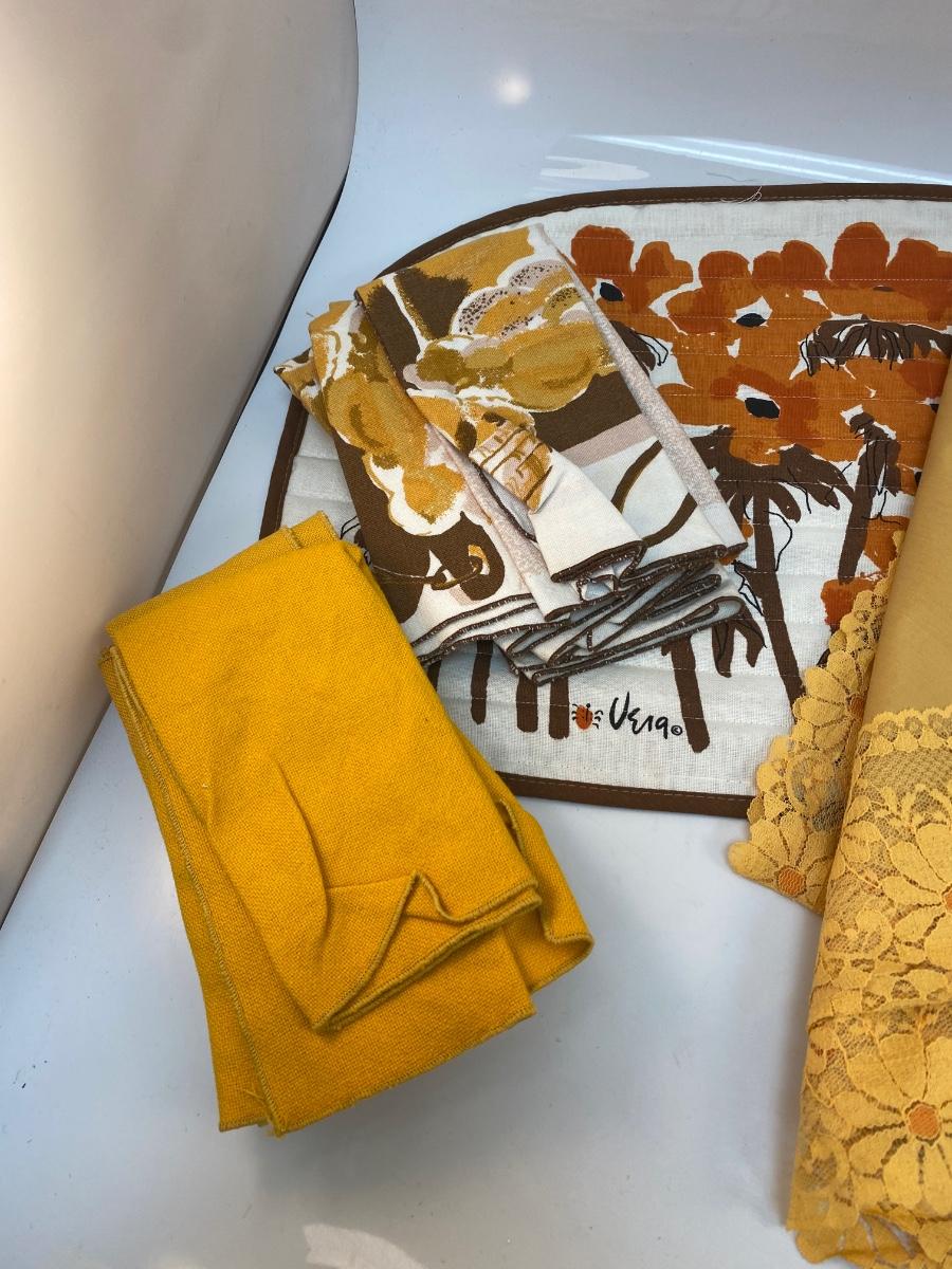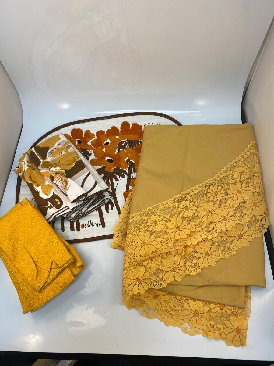 Mixed Lot of Vintage Retro Yellow Orange Brown Table Linens Napkins Tablecloth. Includes a round marigold yellow flower lace edge tablecloth, two different cloth napkin sets, and a placemat. In good vintage condition, May be light spot or discolor here and there. Tablecloth is about 60" size.