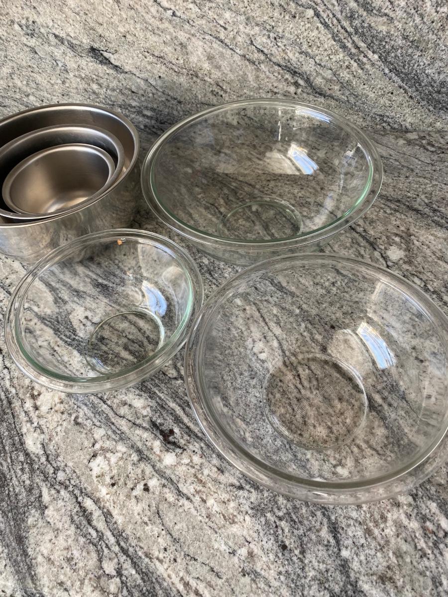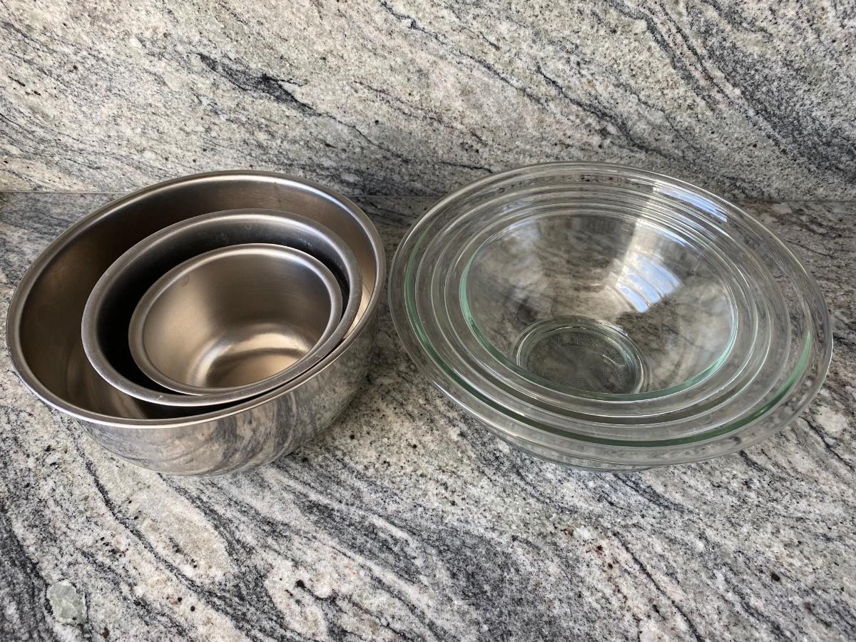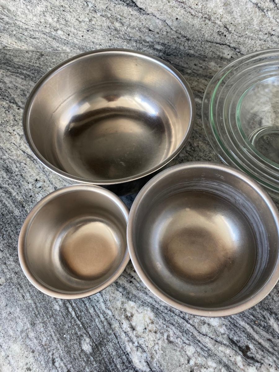 Two Set of Mixing Bowls Stainless Steel & Glass Three Sizes Each. in good condition, one of the stainless bowls has some signs of use.