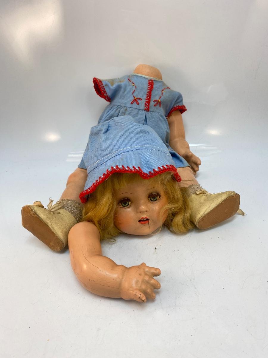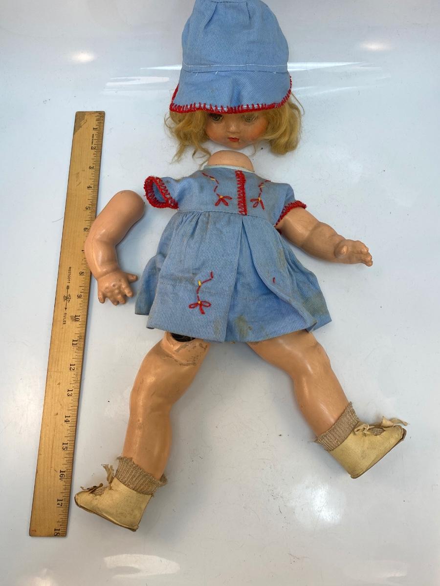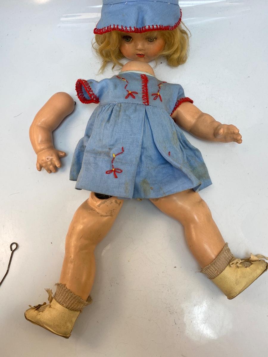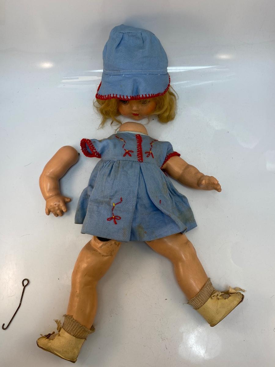 There is wear to the doll and broken pieces, but it's in overall interesting condition. Check pictures for more details and for sizing.