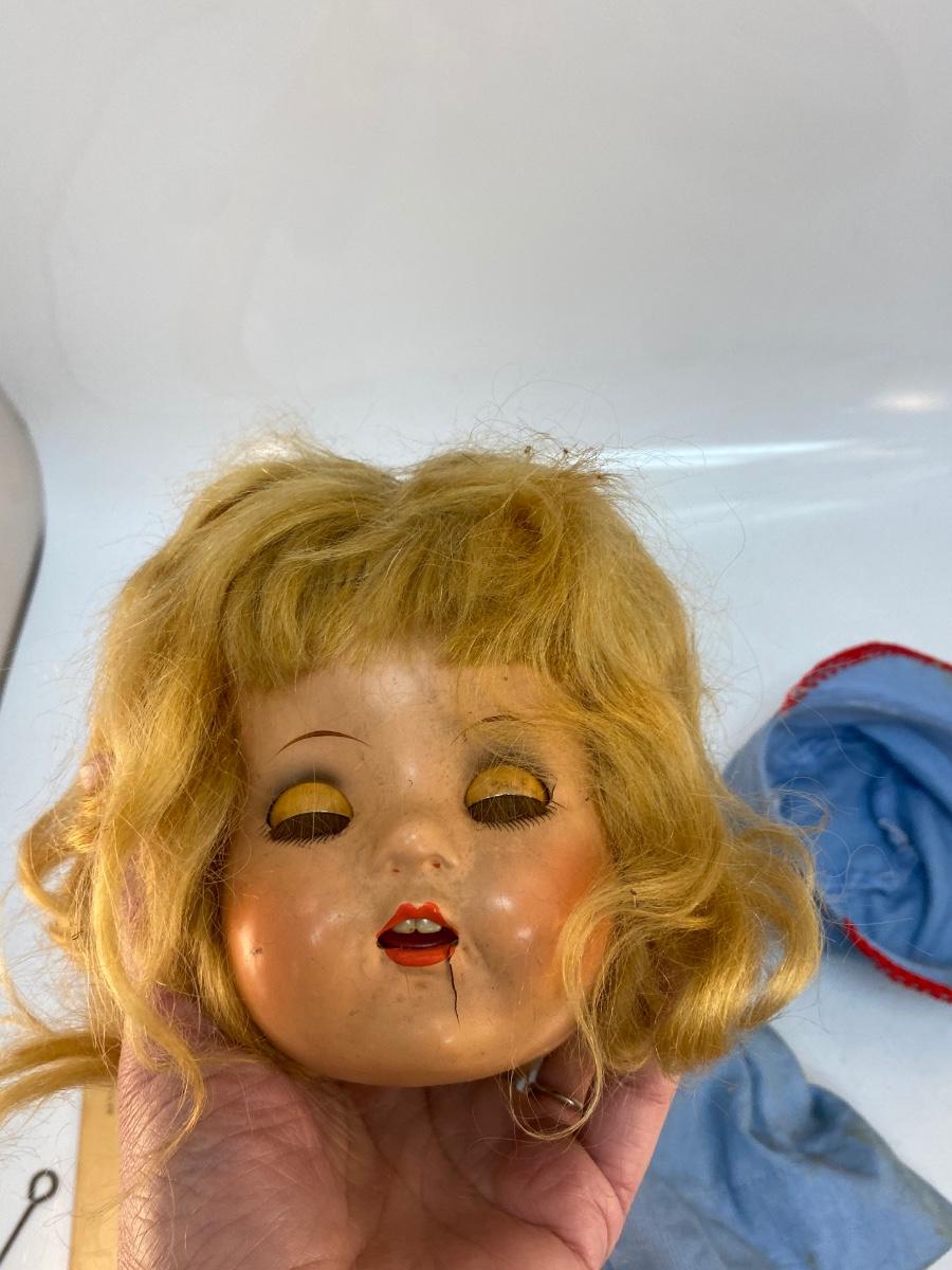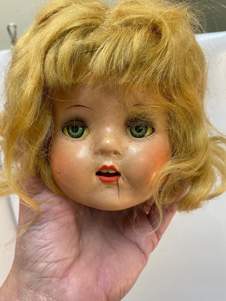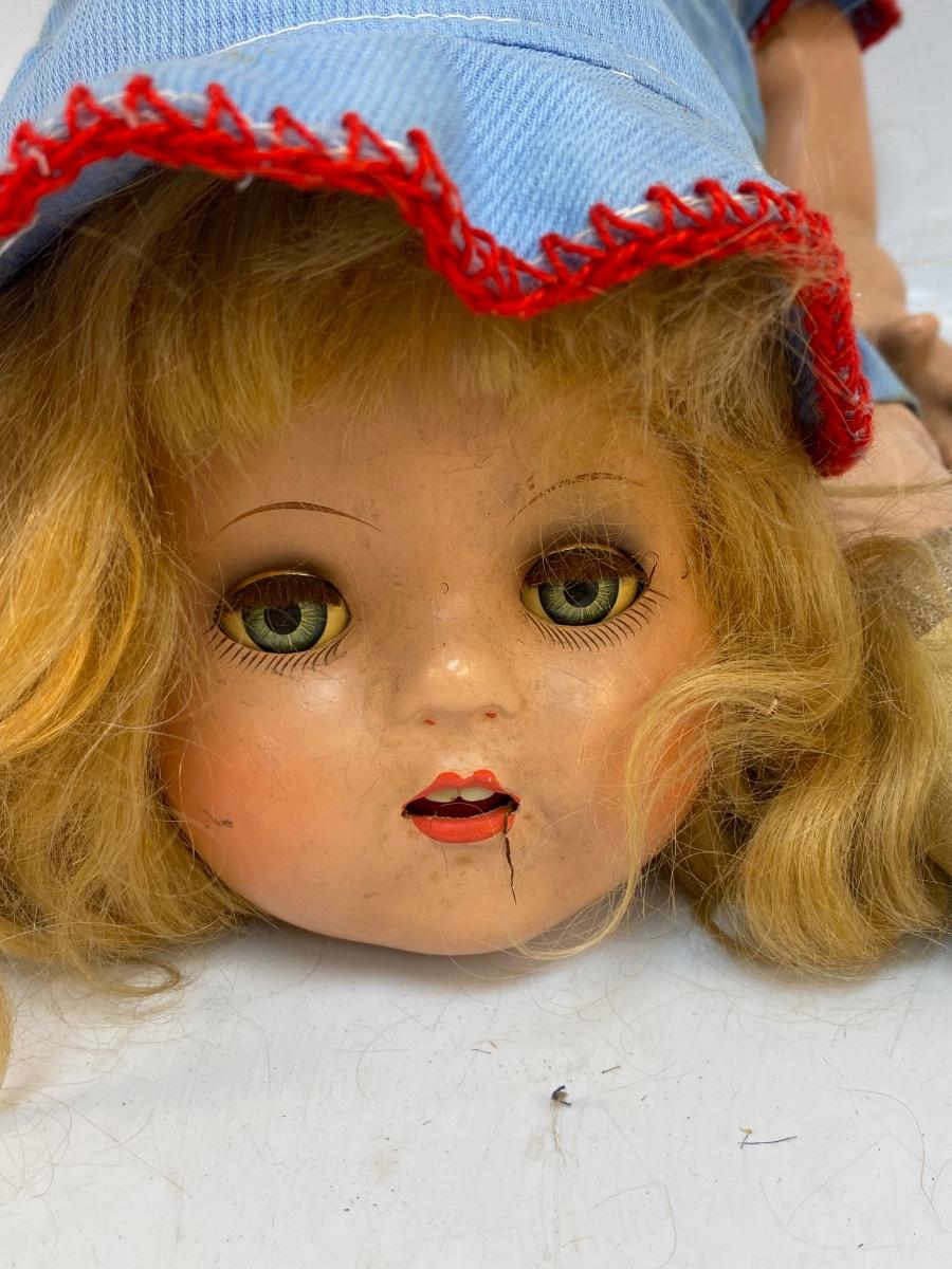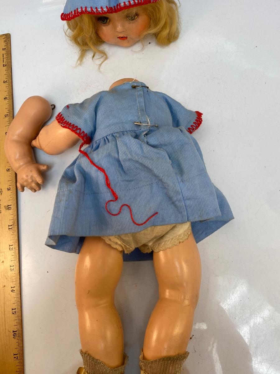 There is wear to the doll and broken pieces, but it's in overall interesting condition. Check pictures for more details and for sizing.