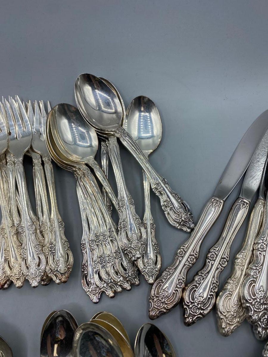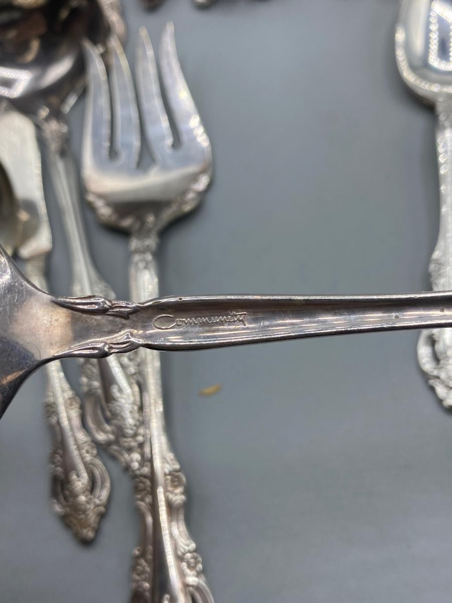 Vintage Community Floral Silverware Flatware set with Hostess Serving Set. Service for 10 with some extras. Includes an 8-piece hostess serving set. In good previously used condition.