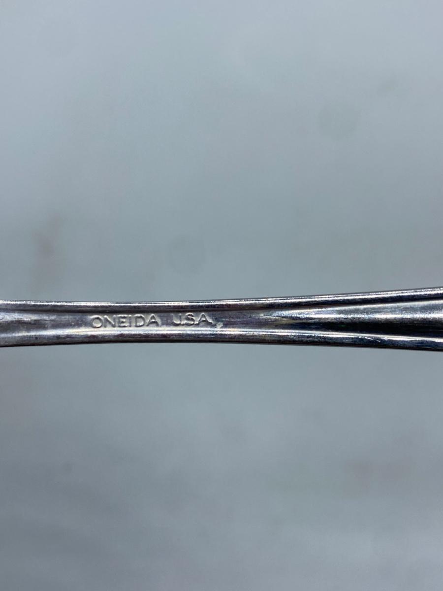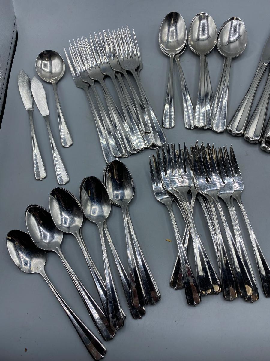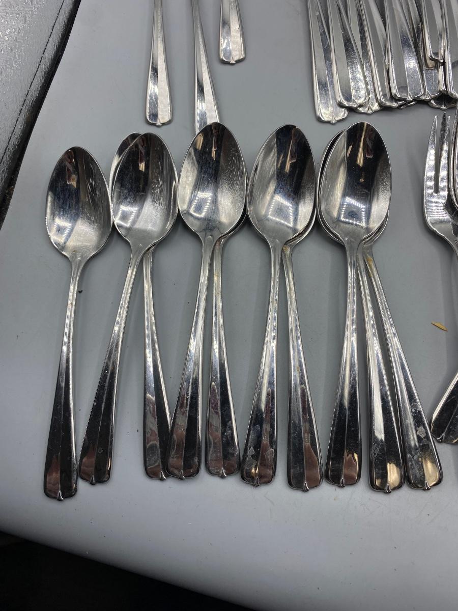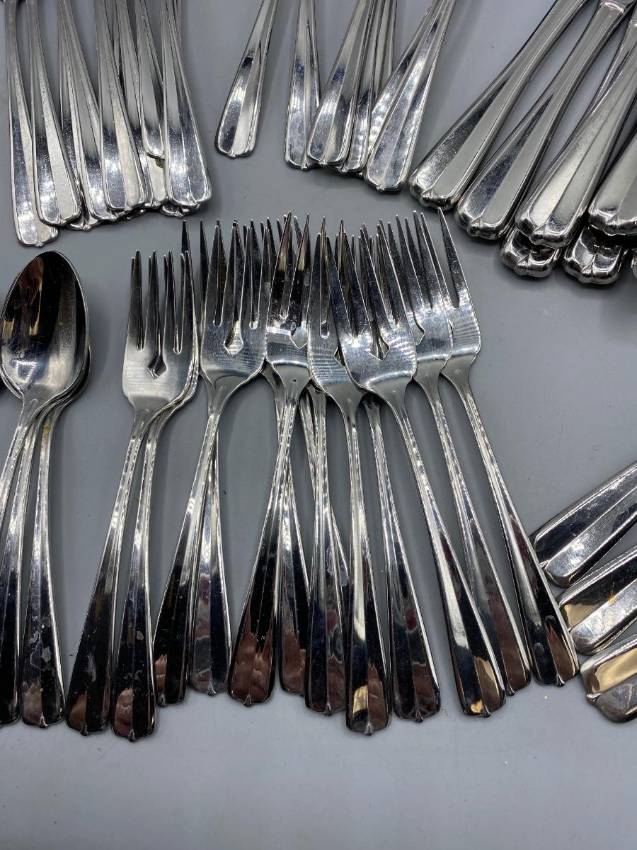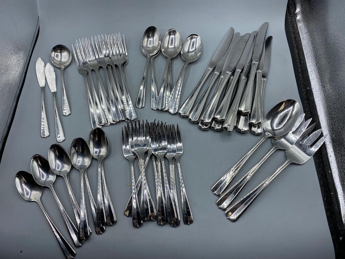 Oneida USA Stainless Steel Flatware Silverware Set. Large set includes service for 6 with extras. Also included is a 6-piece hostess serving set. Simple handle design. In good previously used condition.