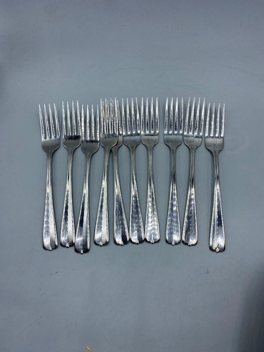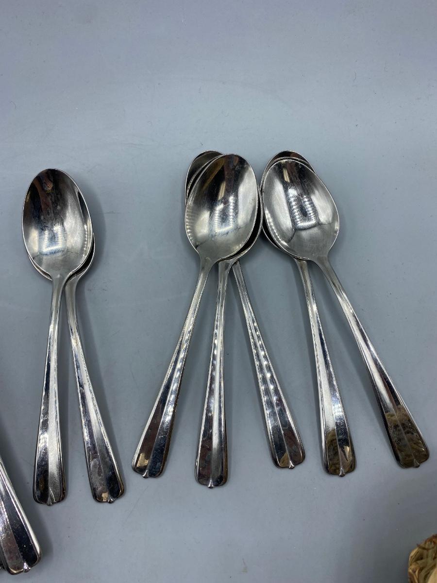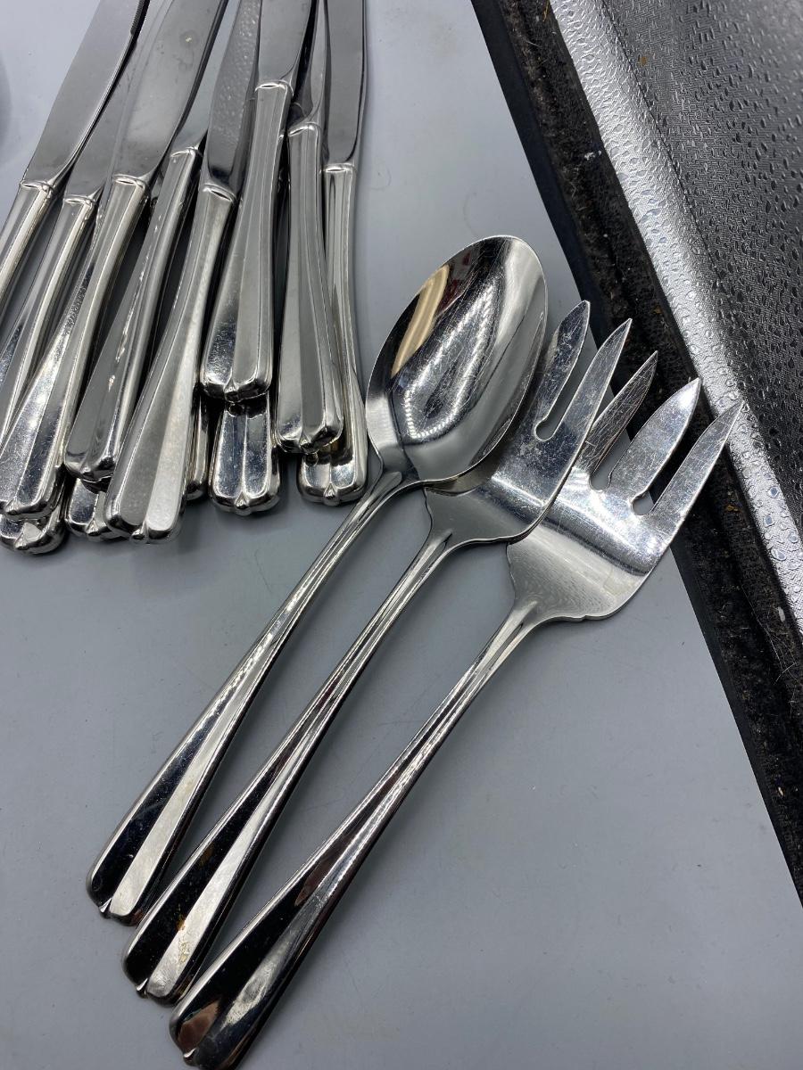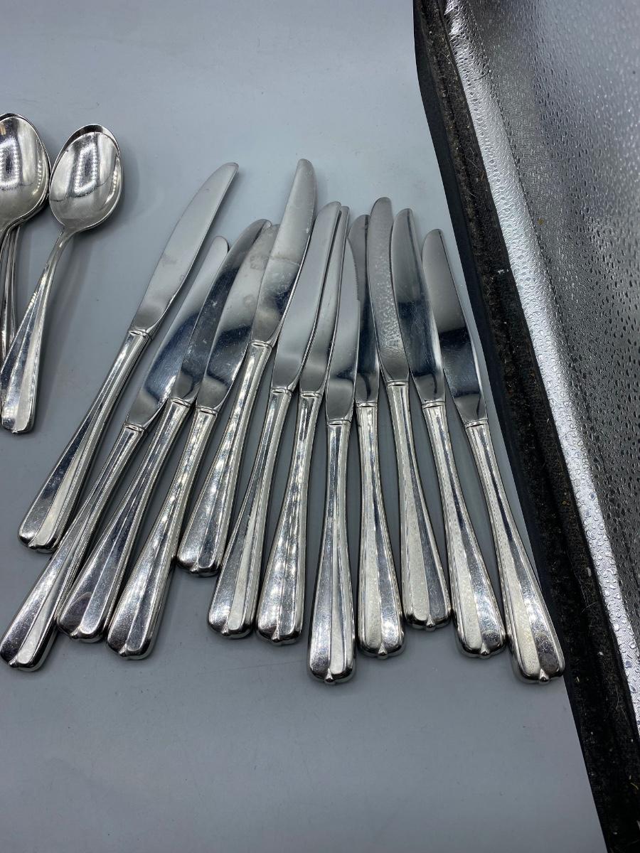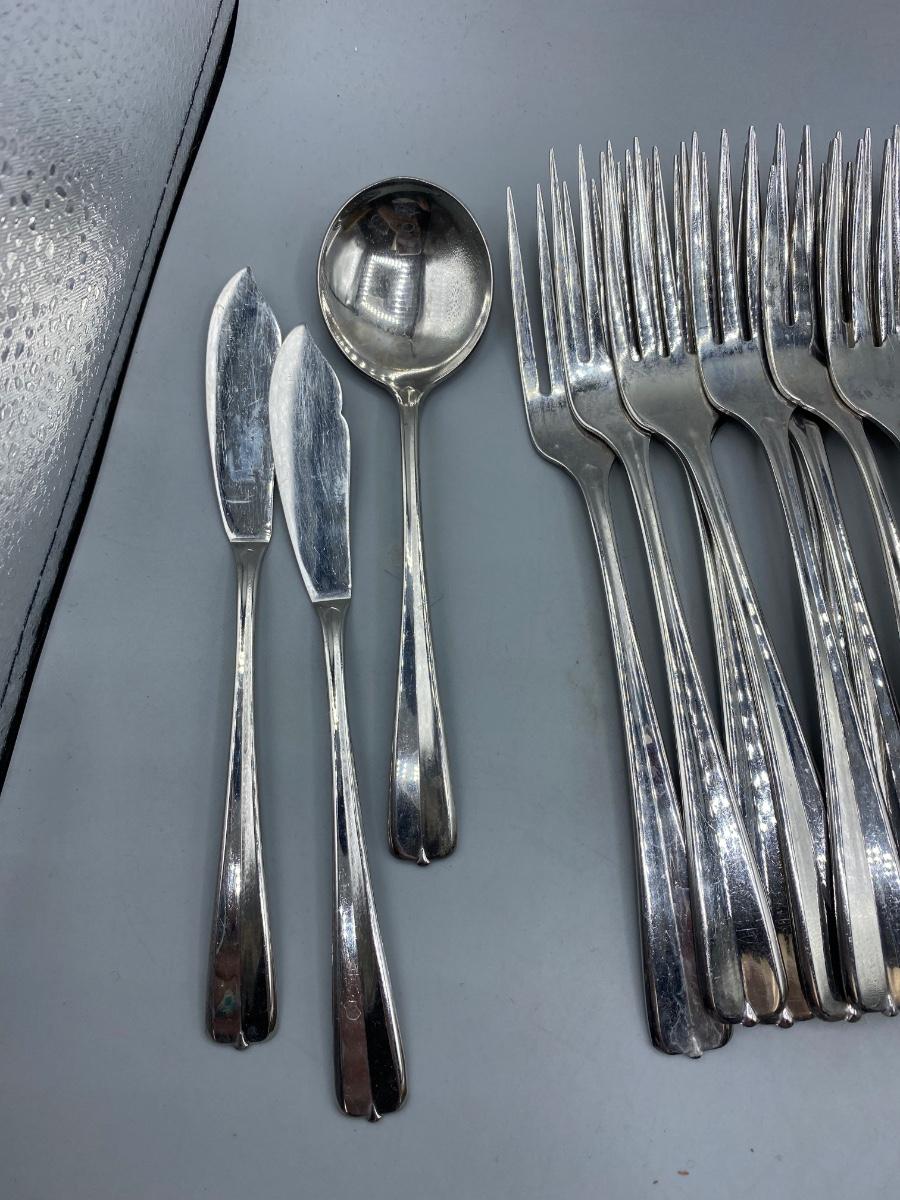 Oneida USA Stainless Steel Flatware Silverware Set. Large set includes service for 6 with extras. Also included is a 6-piece hostess serving set. Simple handle design. In good previously used condition.