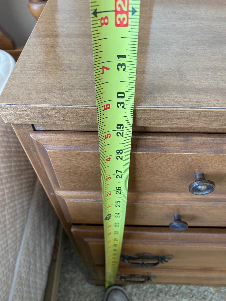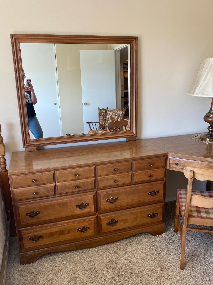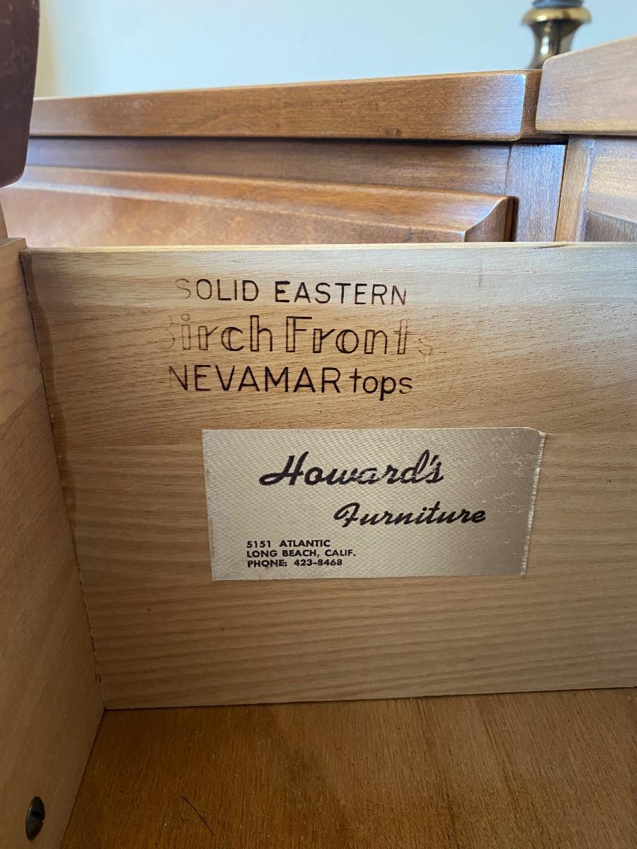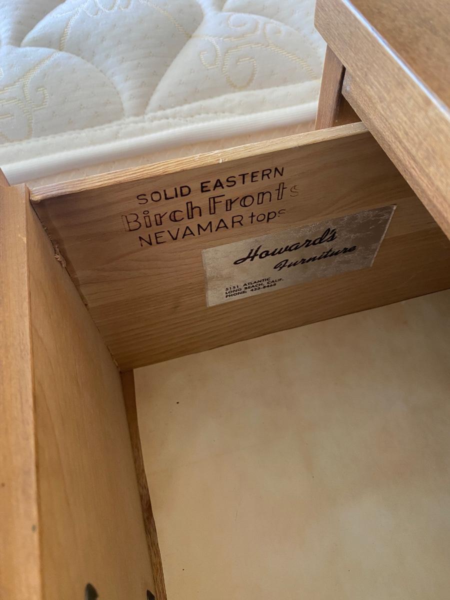 Vintage Birch Front Three Piece Dresser Corner Desk Hutch Children's Bedroom Set. Beautiful birch furniture set. Includes a lowboy dresser with mirror, corner fit desk with chair, and a bookcase hutch with lower drawers and shelves. Nevamar surfaces have no signs of wear or damage. In excellent vintage condition. Pieces are separate, corner desk has legs so it can stand on its own. Hutch stands about 67" tall, 30" wide (62" including desk), and about 18" deep. Dresser is about 48" wide (about 80" with desk) about 18" deep and 30" high. Mirror 36"x41" size. Original sales receipt shows a purchase date of 1965. *Lamp not included, but available in auction.*