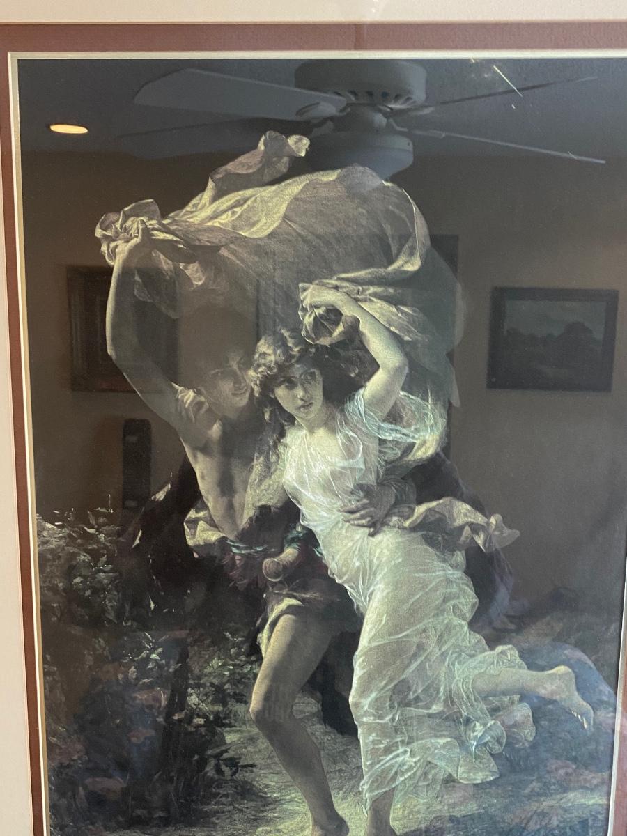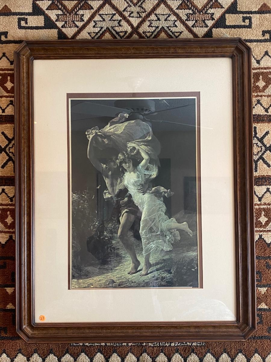 Large Framed Romantic Art Nouveau Victorian Print The Storm Pierre Auguste P A COT 1880. In good condition. Black and white print may have light fade from sunlight. Displays wonderfully. About 28"x38" framed.