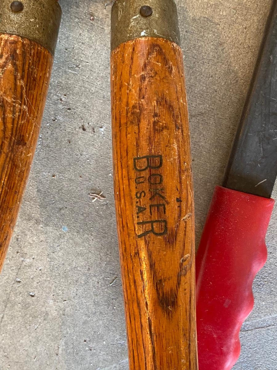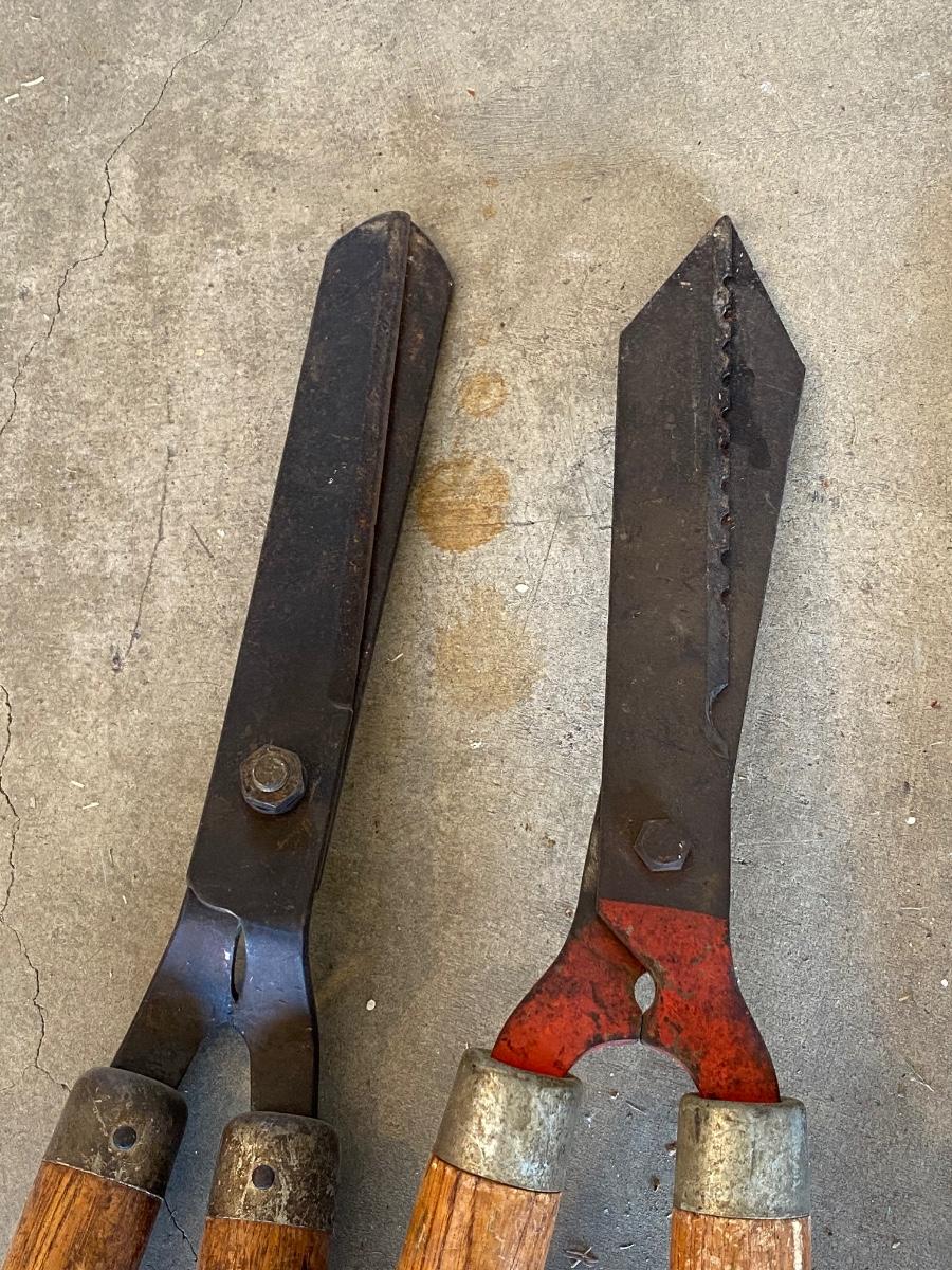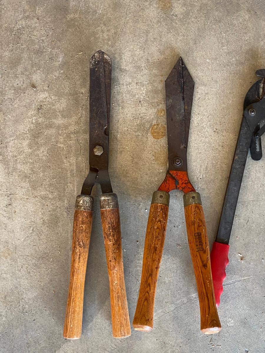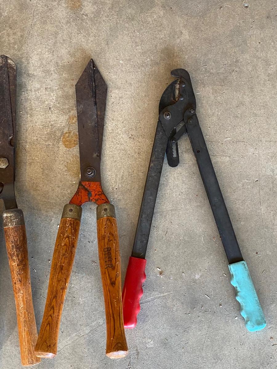 Three Pairs of Short Handle Hedge Shears Cutters & Ratcheting Branch Lopper. All in good, maintained condition.
