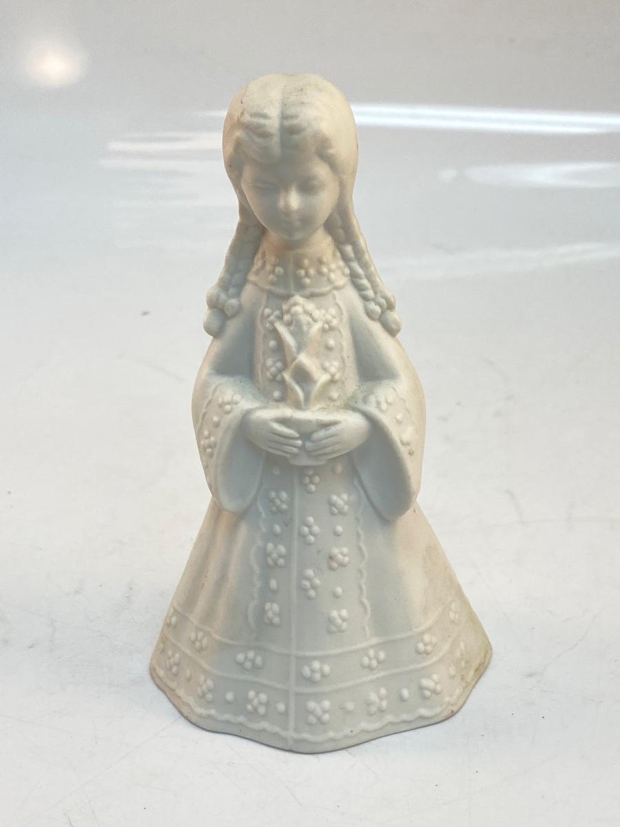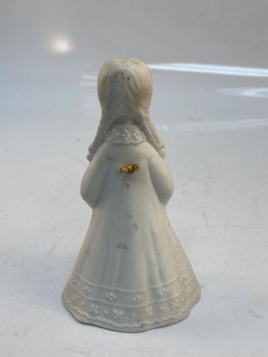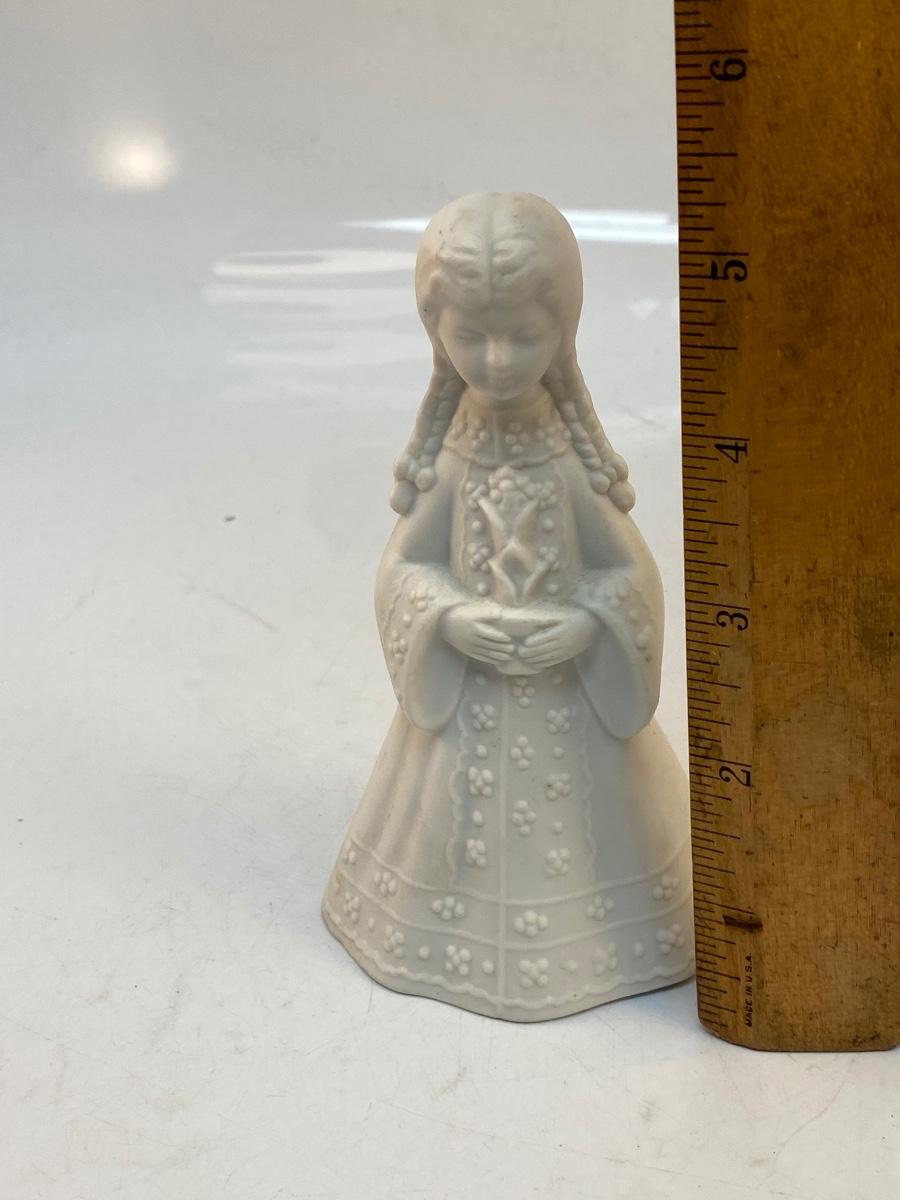 White Bisque Porcelain Choir Girl Bell Japan. in displayed condition. A little over 5" size.