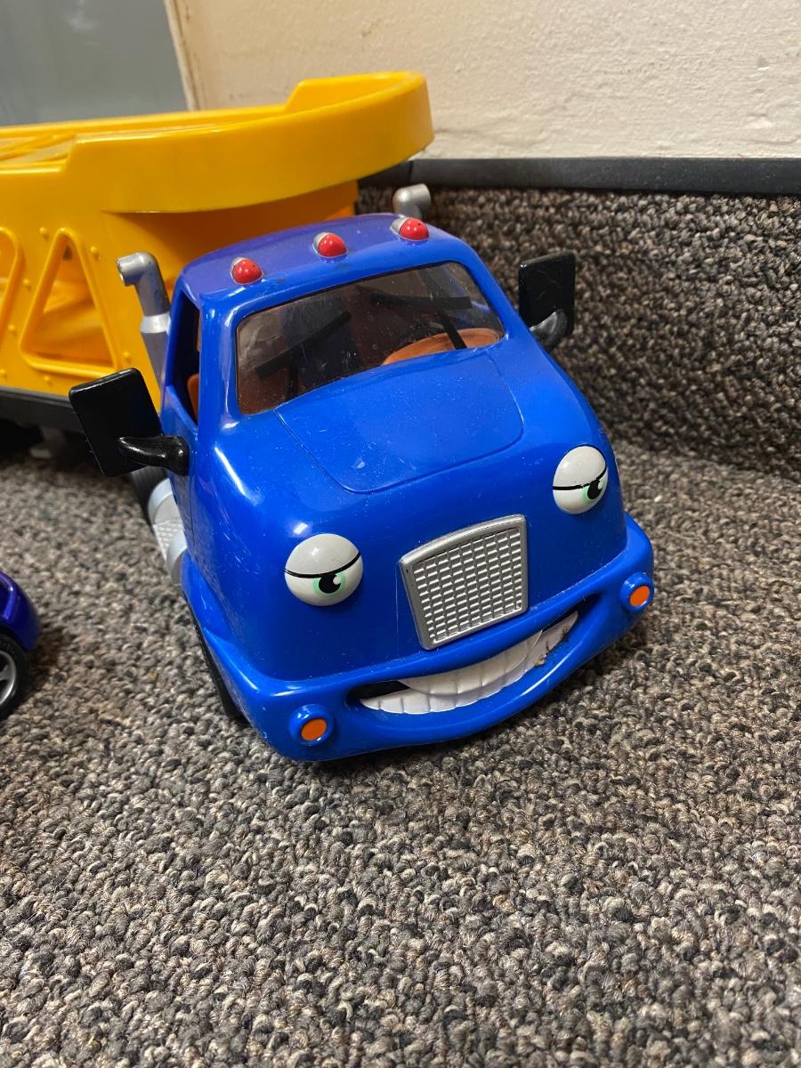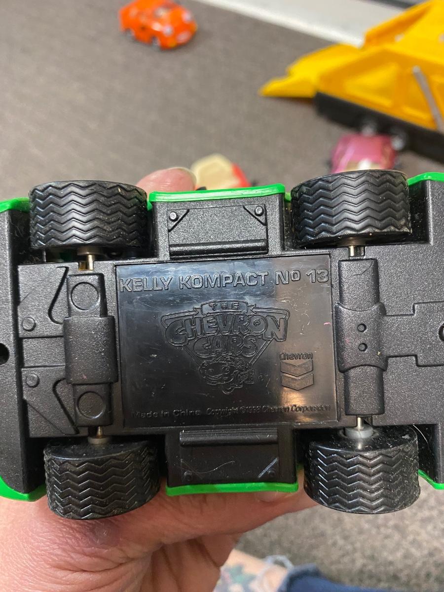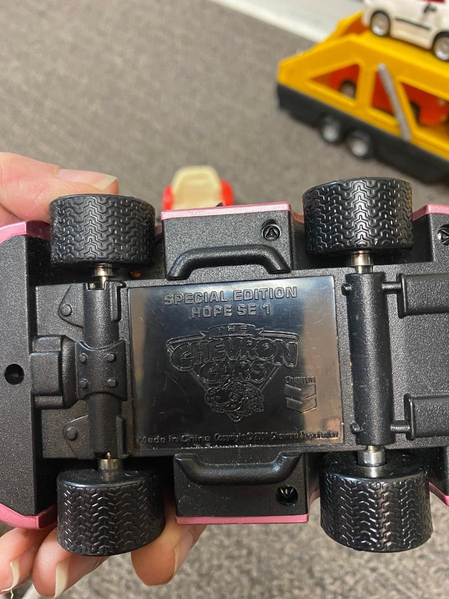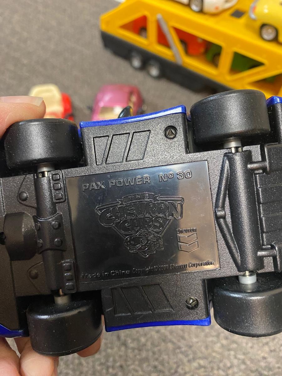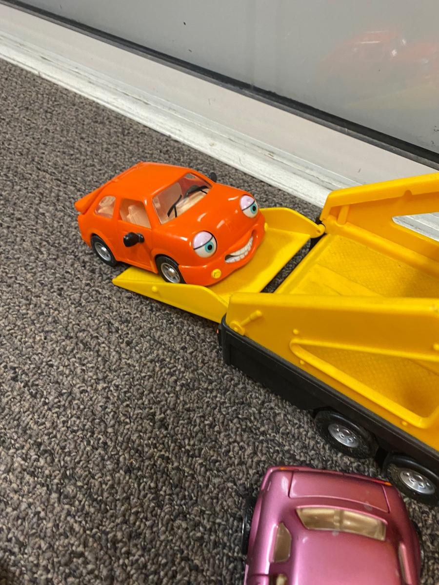 Chevron Cars Semi Truck Hauler & 7 Googly Eyed Cars. In good played with condition. Some of the cars have eyes that move when pushed.