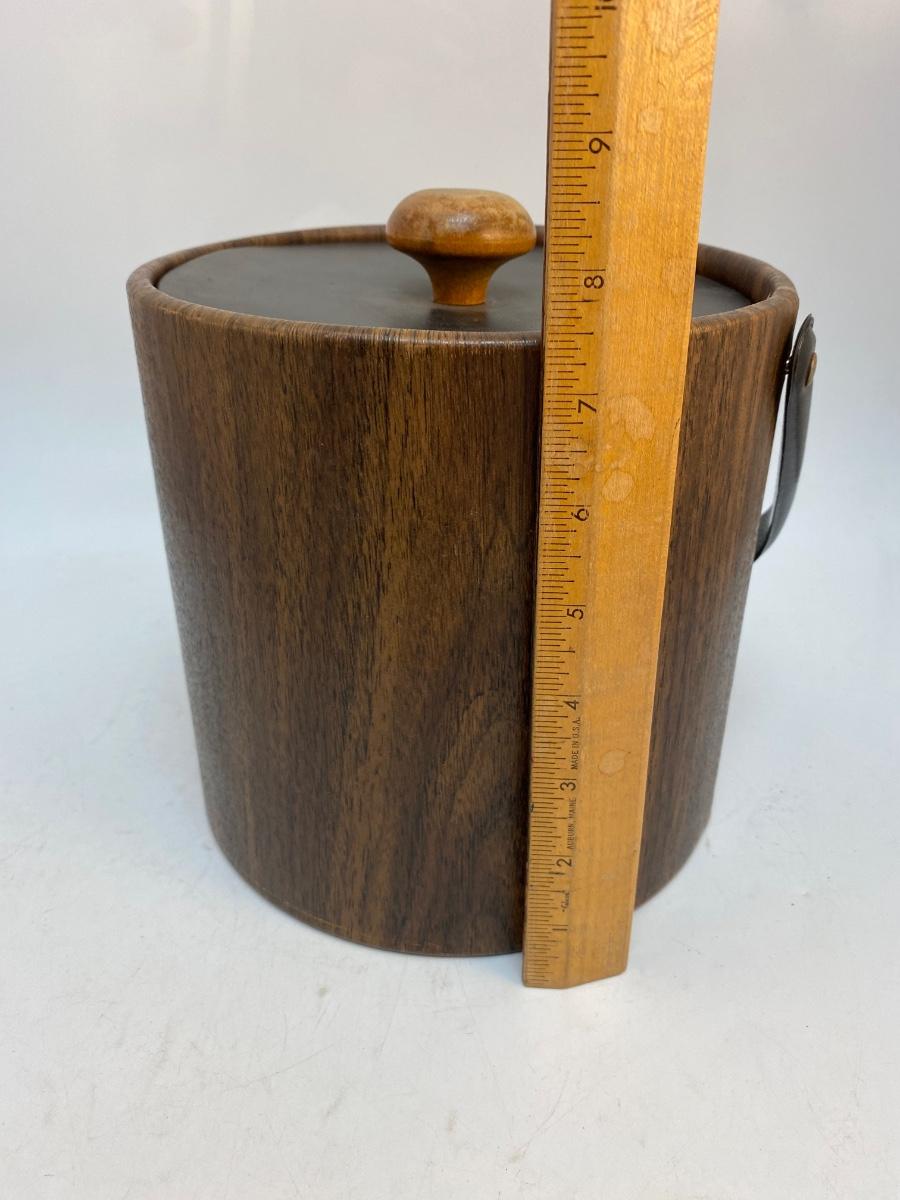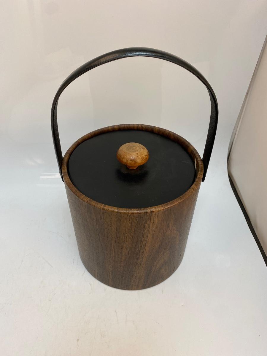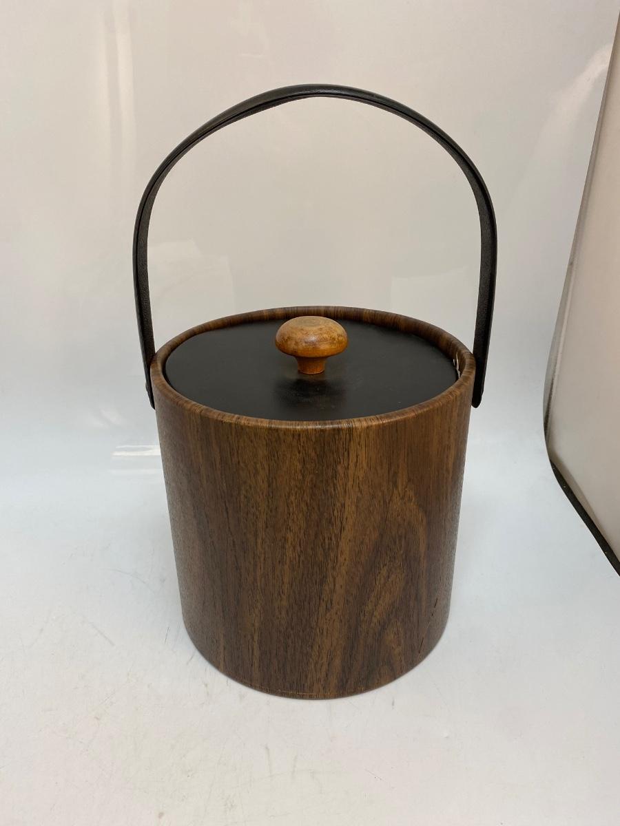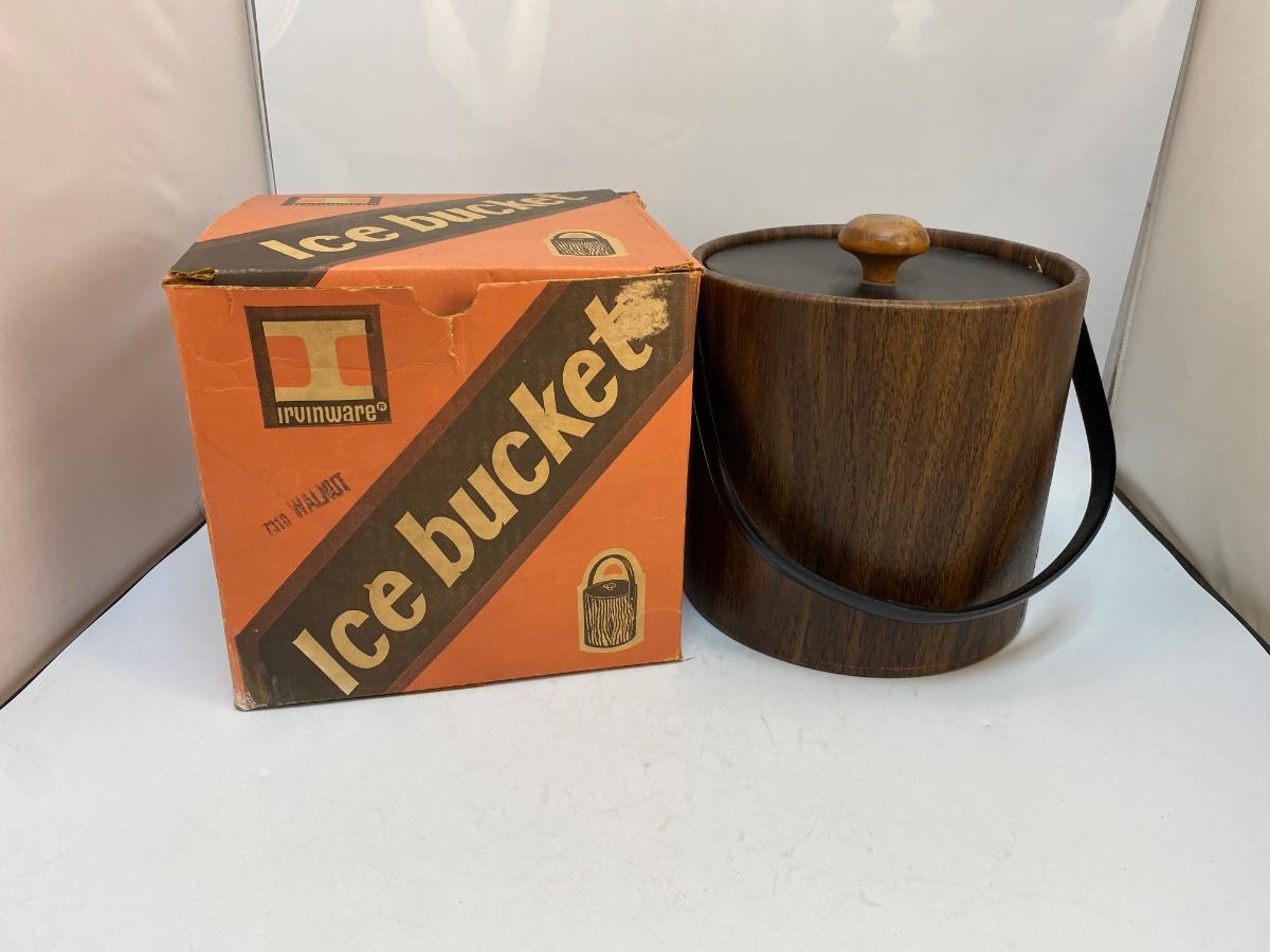 Vintage Faux Wood Vinyl Ice Bucket from Irvinware with Box. In good used vintage condition. Lid sits a little crooked. Did find one scratch in vinyl, but it doesn't go all the way through.
