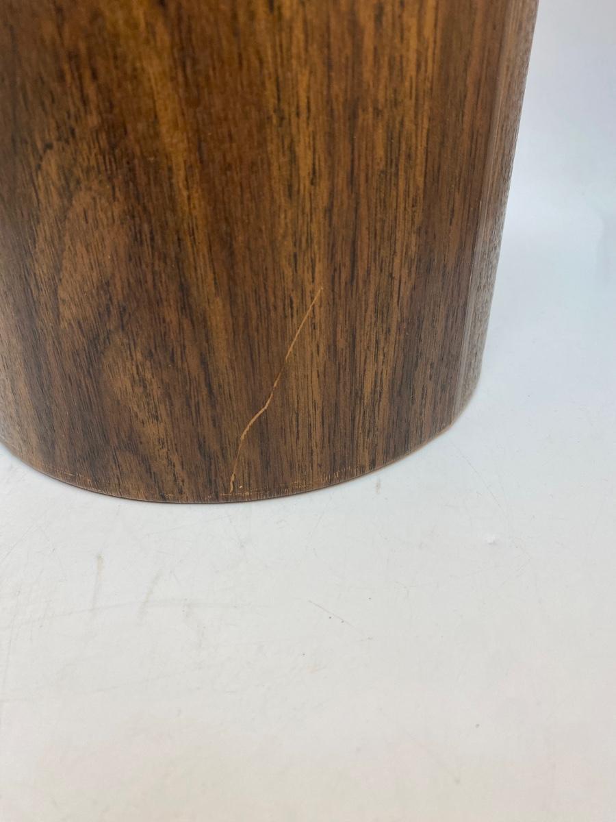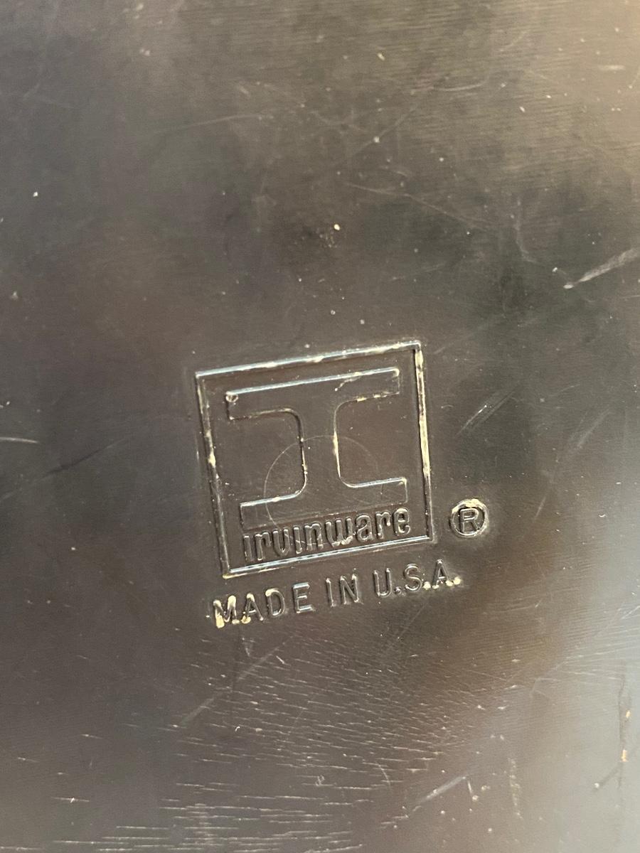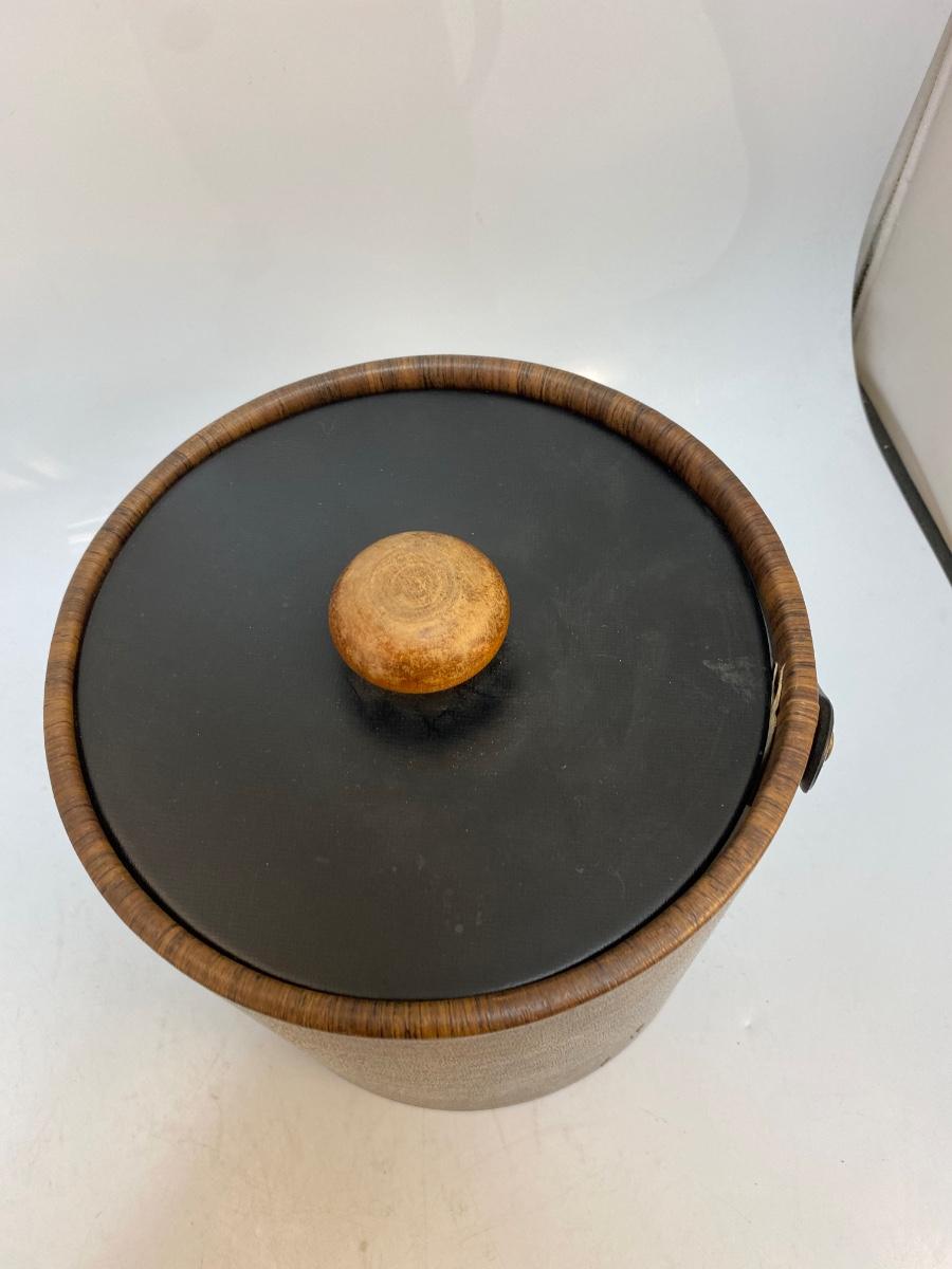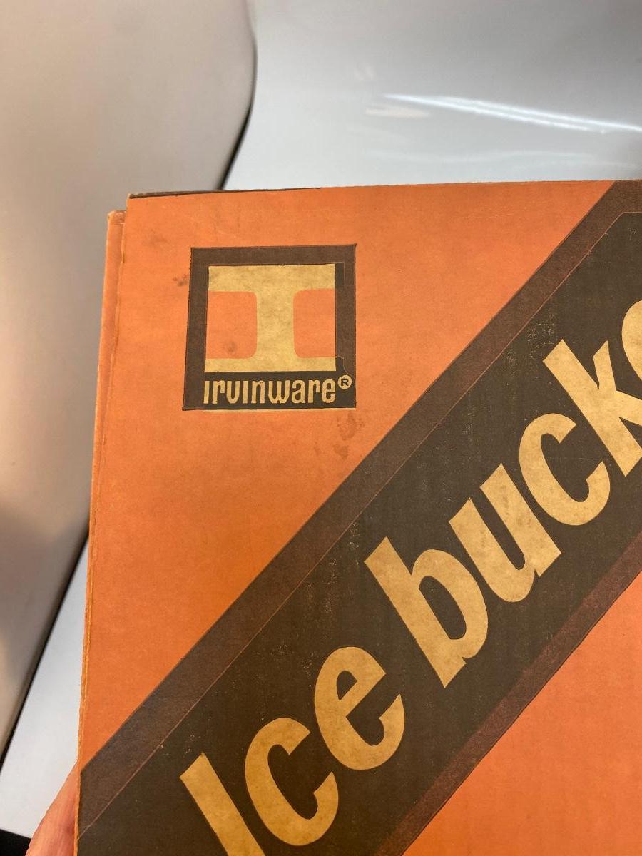 Vintage Faux Wood Vinyl Ice Bucket from Irvinware with Box. In good used vintage condition. Lid sits a little crooked. Did find one scratch in vinyl, but it doesn't go all the way through.