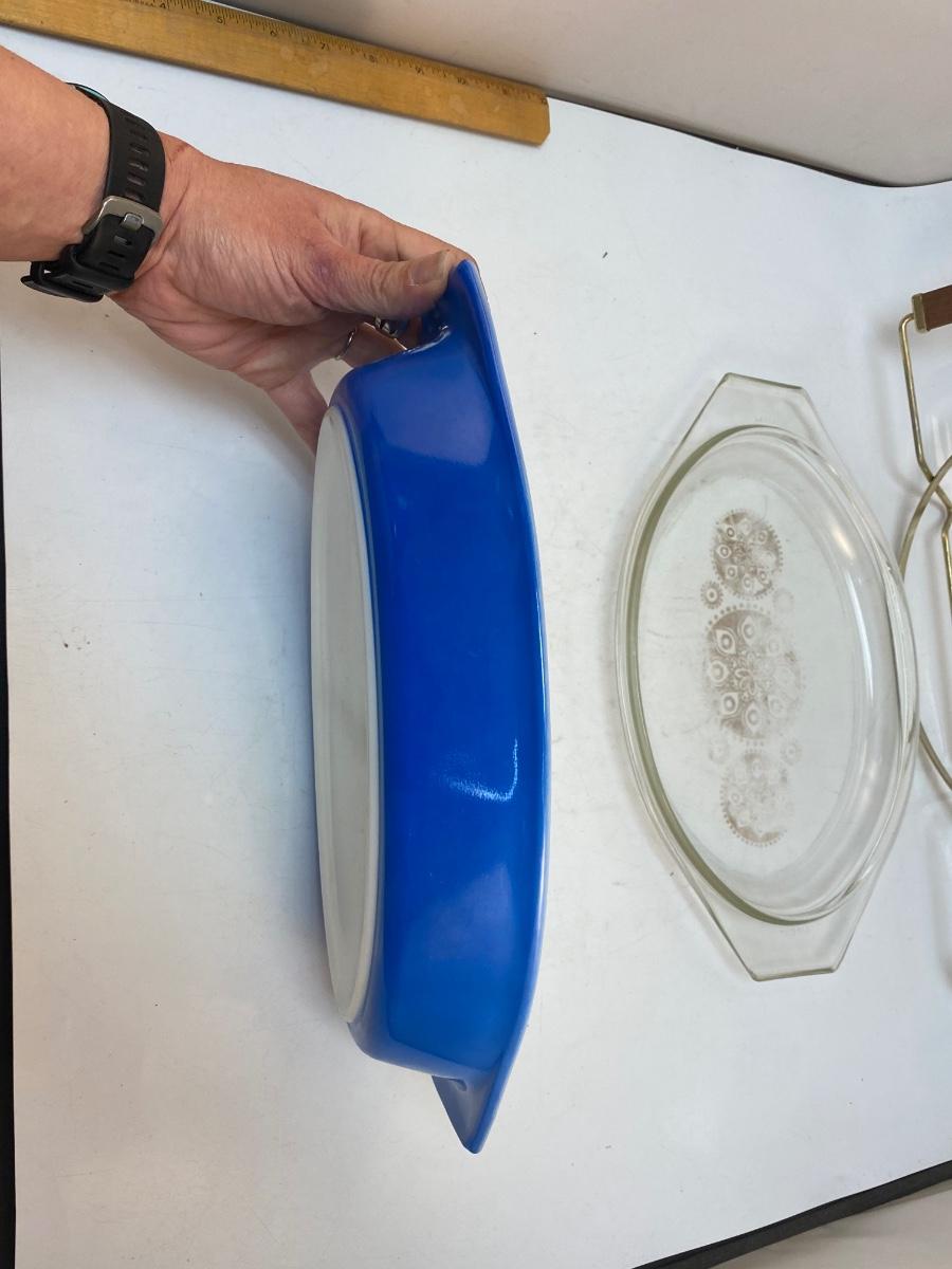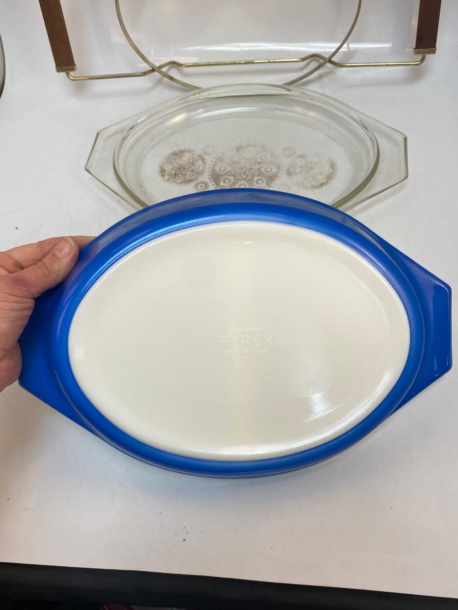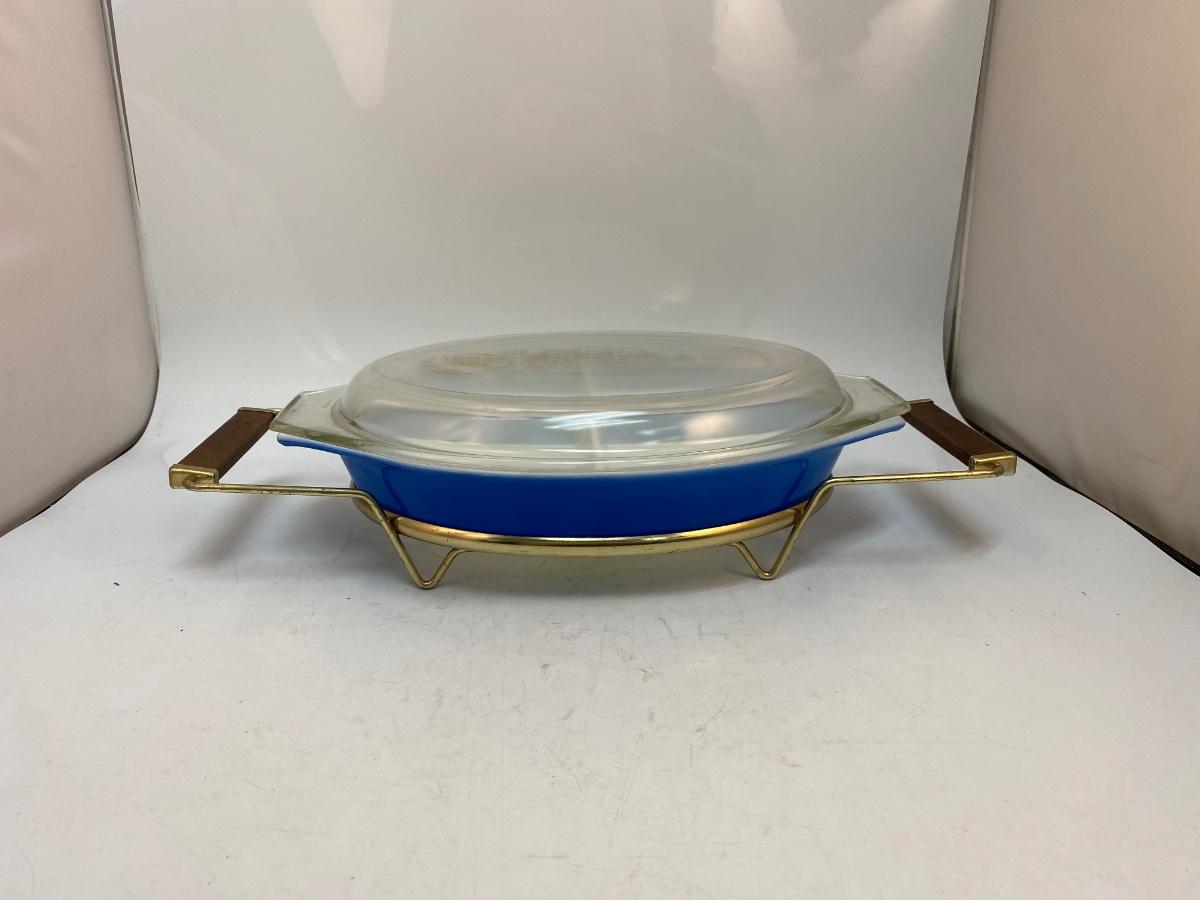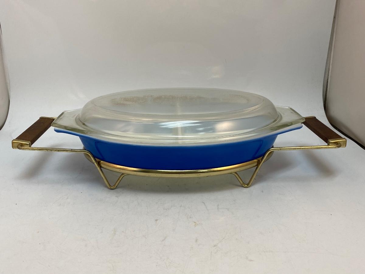 Vintage Primary Blue Divided Oval Pyrex Casserole Dish with Lid and Serving Rack. In good vintage condition. The lid did have a gold pattern to it but it has almost all worn away. Blue outside color is vibrant. A few flea bite chips along inside lip of lid, more like a rough spot than a chip. Rack is shiny with light signs of age. 1.5qt size casserole dish.