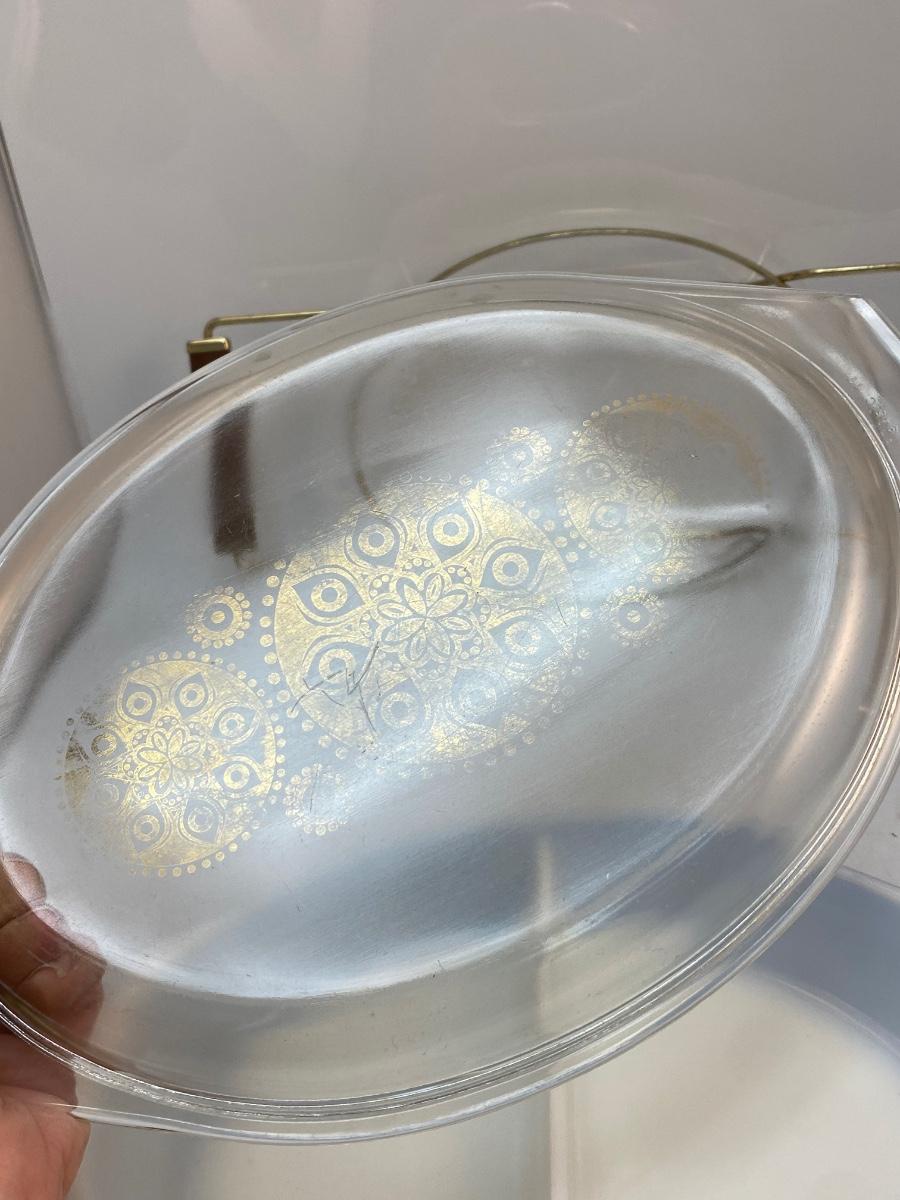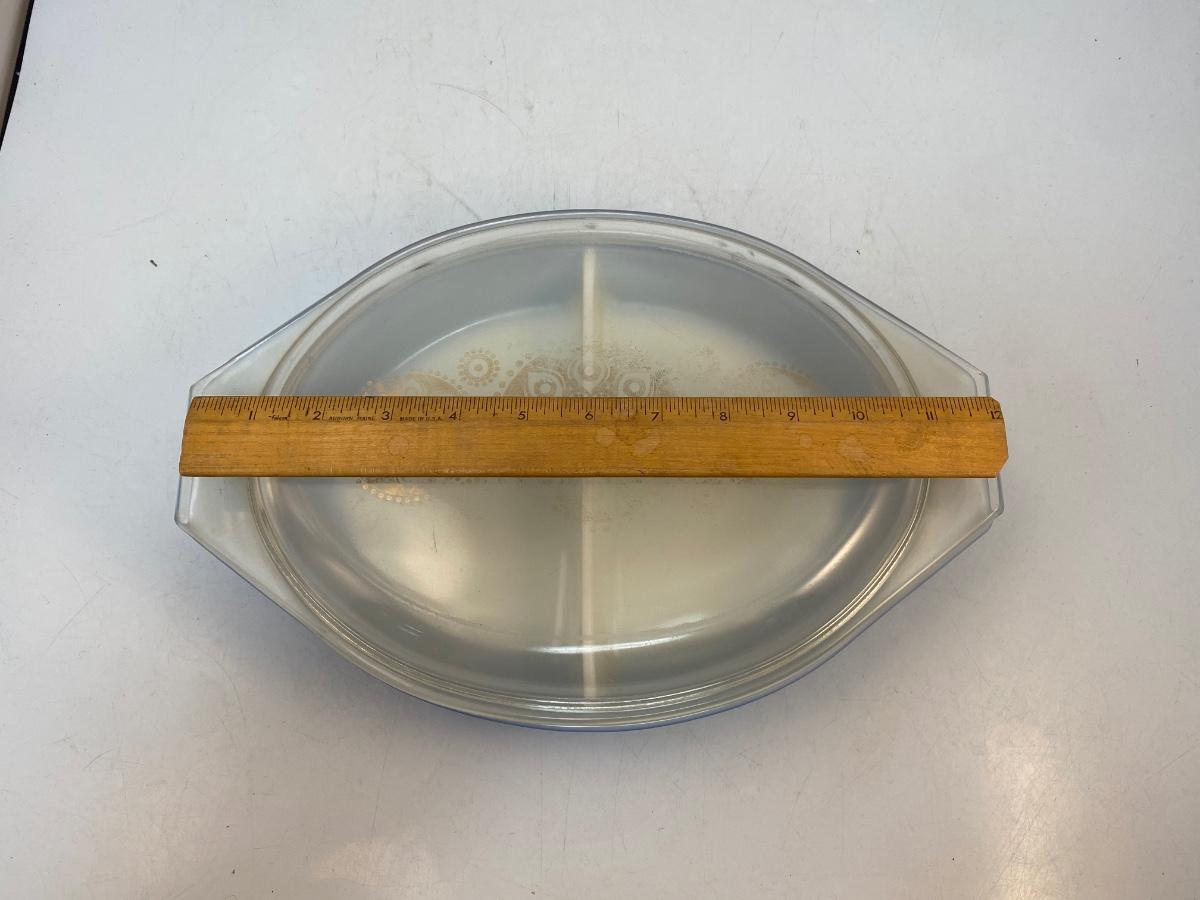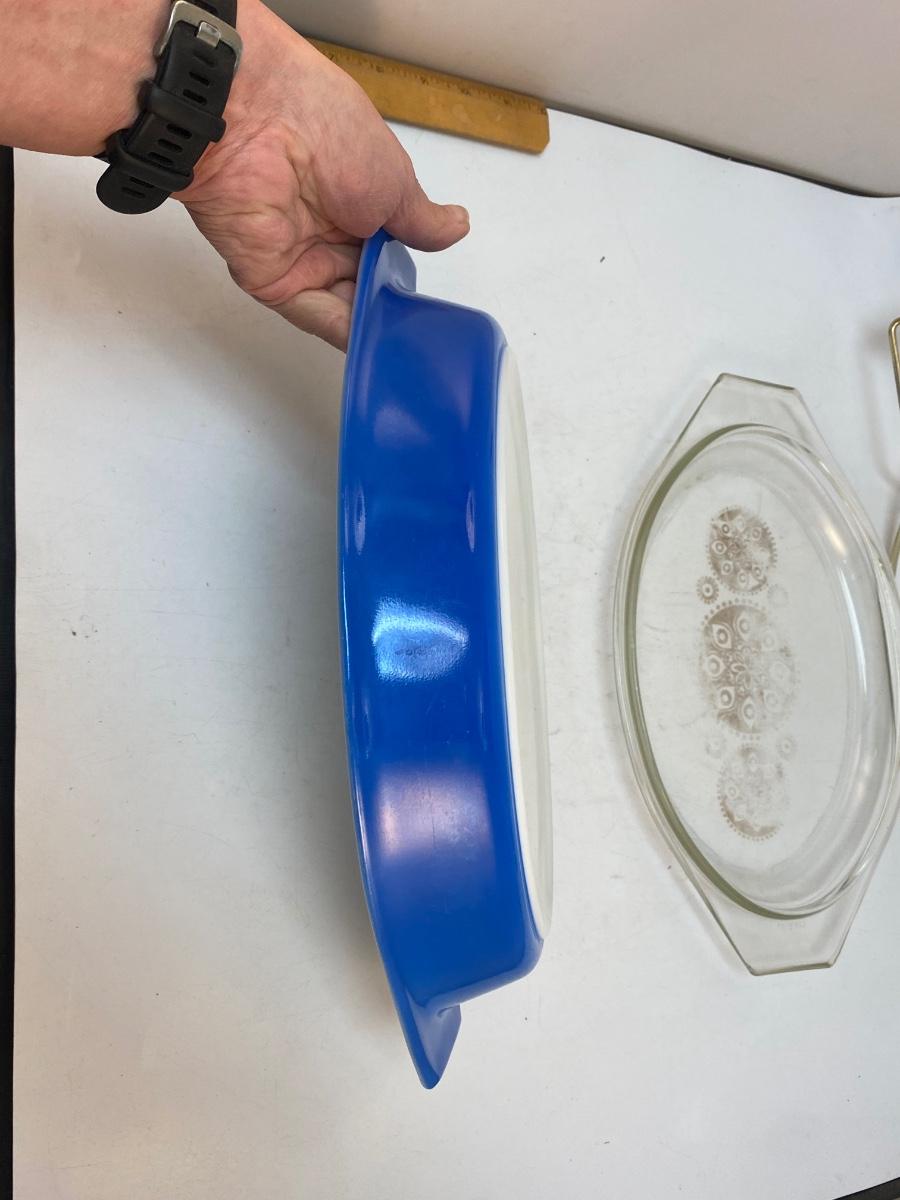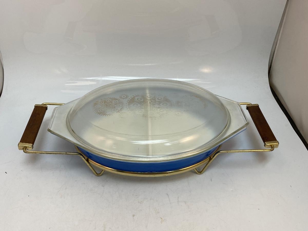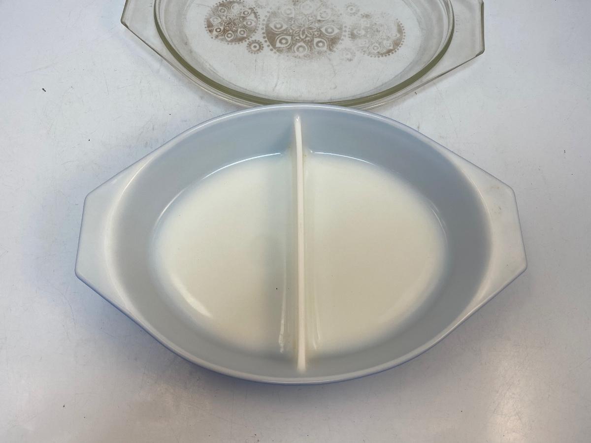 Vintage Primary Blue Divided Oval Pyrex Casserole Dish with Lid and Serving Rack. In good vintage condition. The lid did have a gold pattern to it but it has almost all worn away. Blue outside color is vibrant. A few flea bite chips along inside lip of lid, more like a rough spot than a chip. Rack is shiny with light signs of age. 1.5qt size casserole dish.