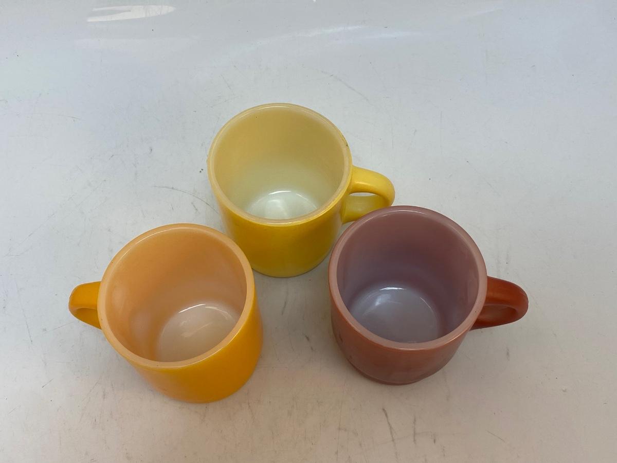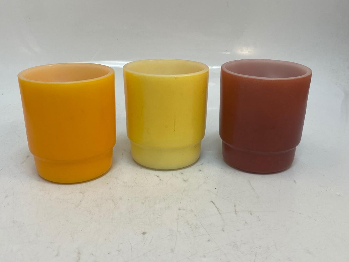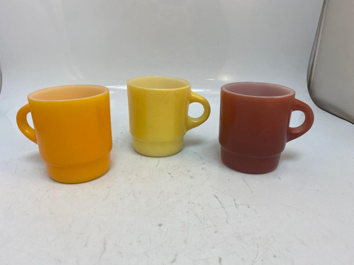 Set of 3 Warm Tone Fire King Anchor Hocking Yellow Orange Red Coffee Cups White Glass. Vintage cups in good condition. Have a matte like finish, may be from use and age. No chips.