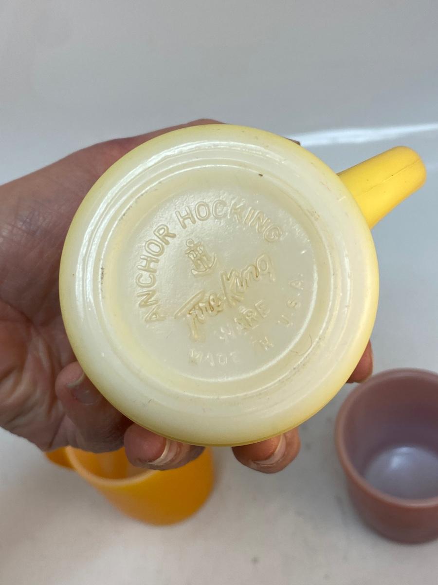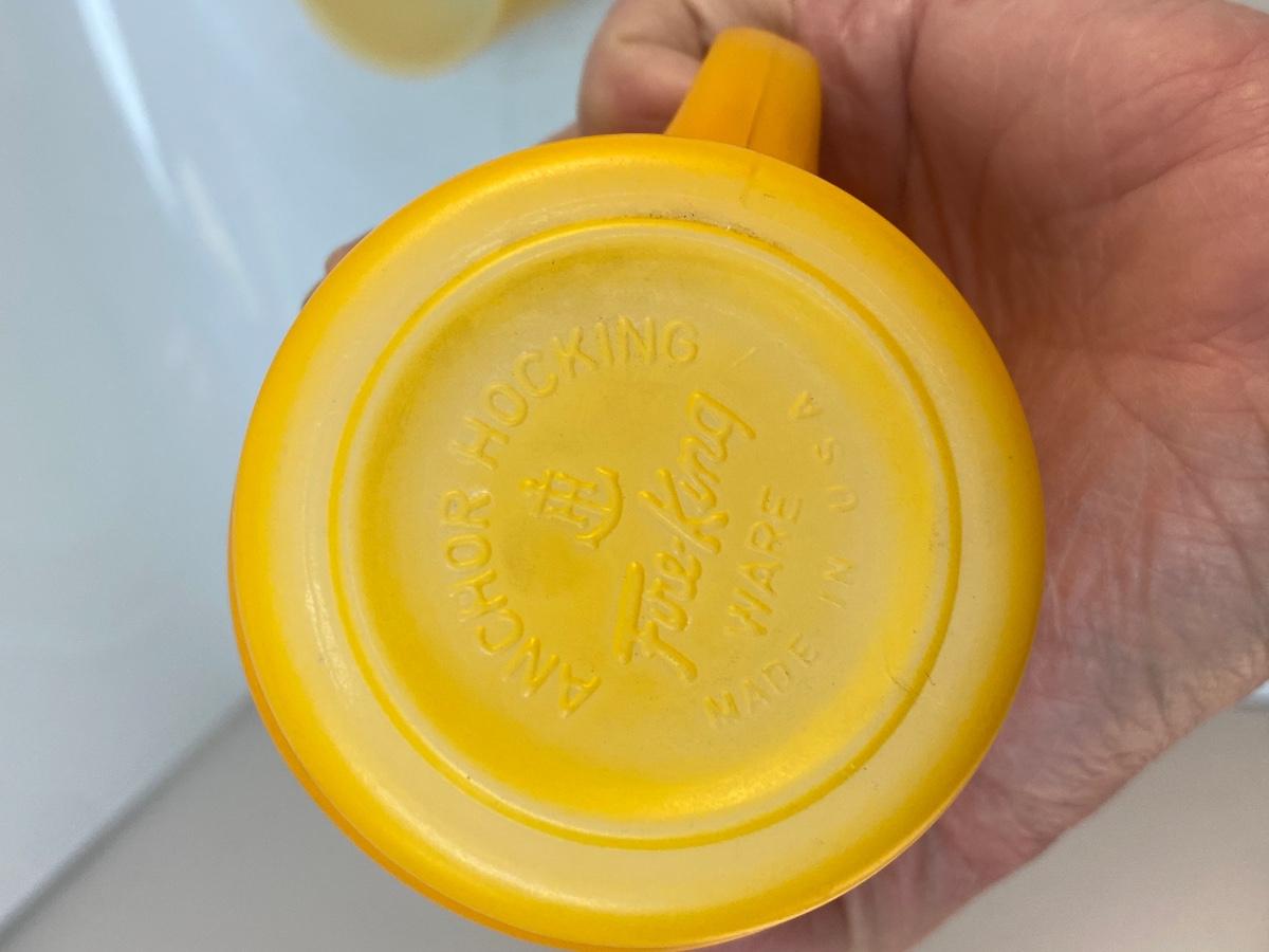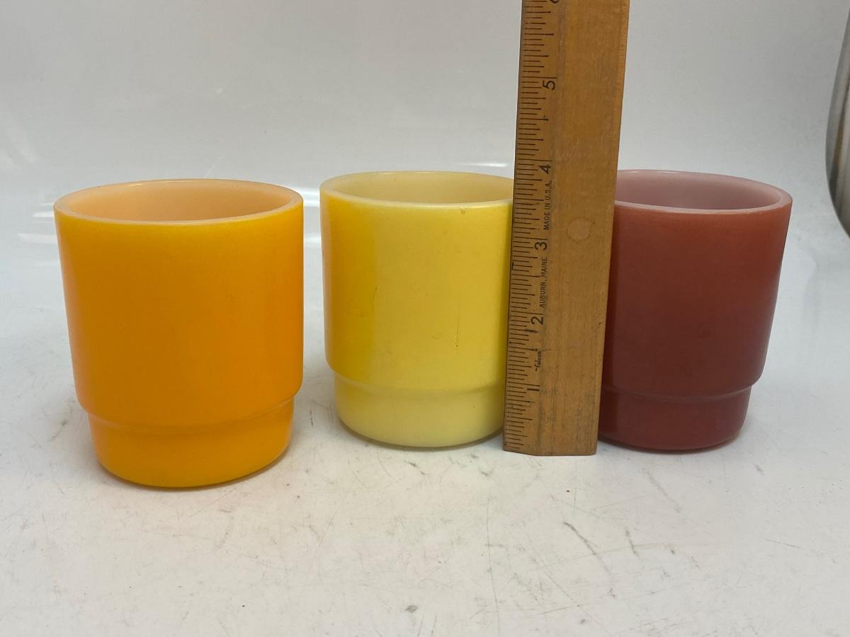 Set of 3 Warm Tone Fire King Anchor Hocking Yellow Orange Red Coffee Cups White Glass. Vintage cups in good condition. Have a matte like finish, may be from use and age. No chips.