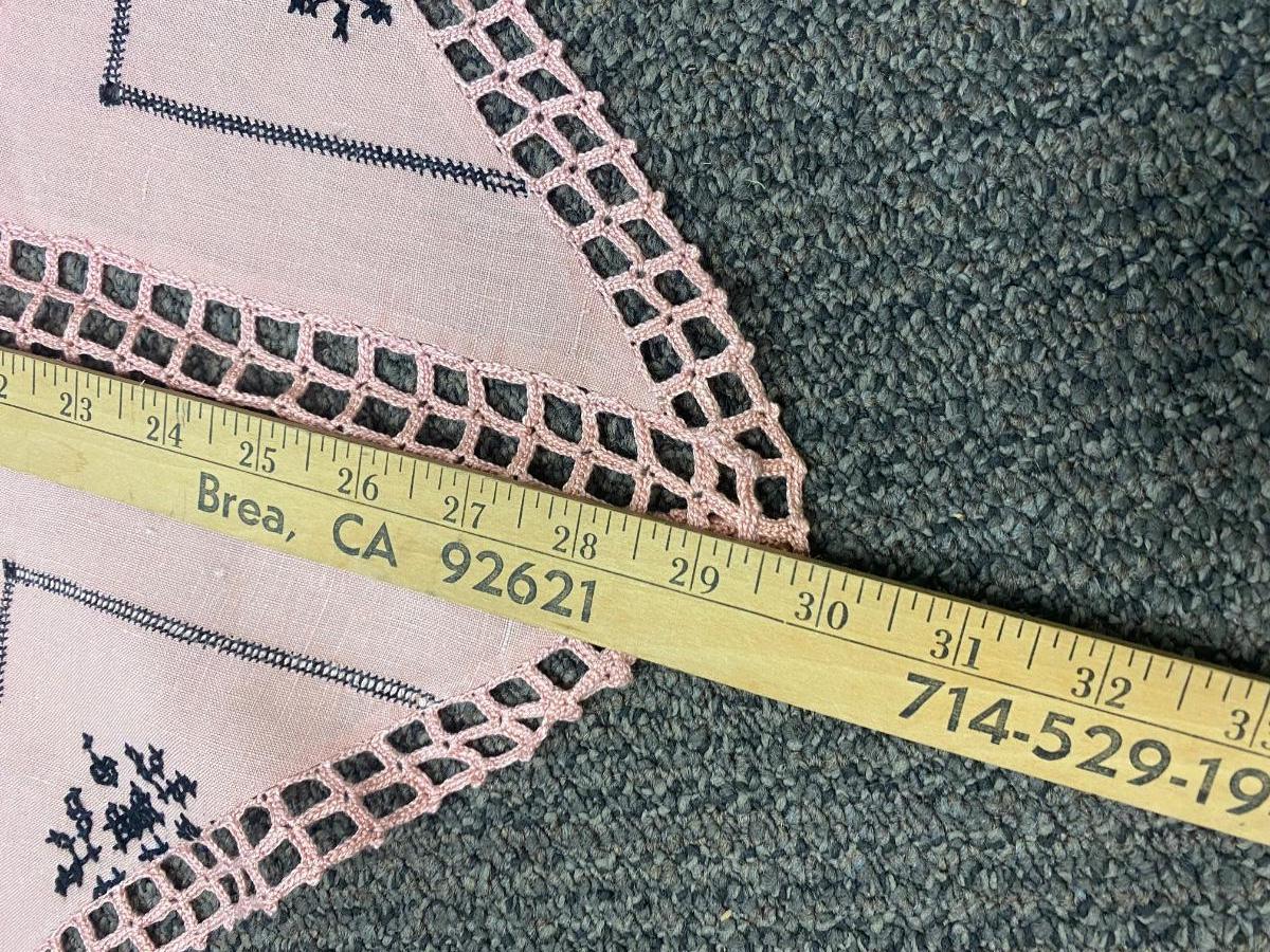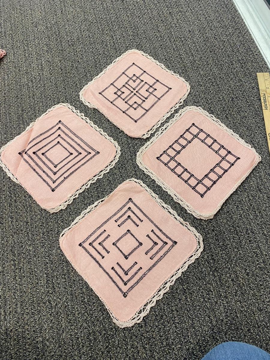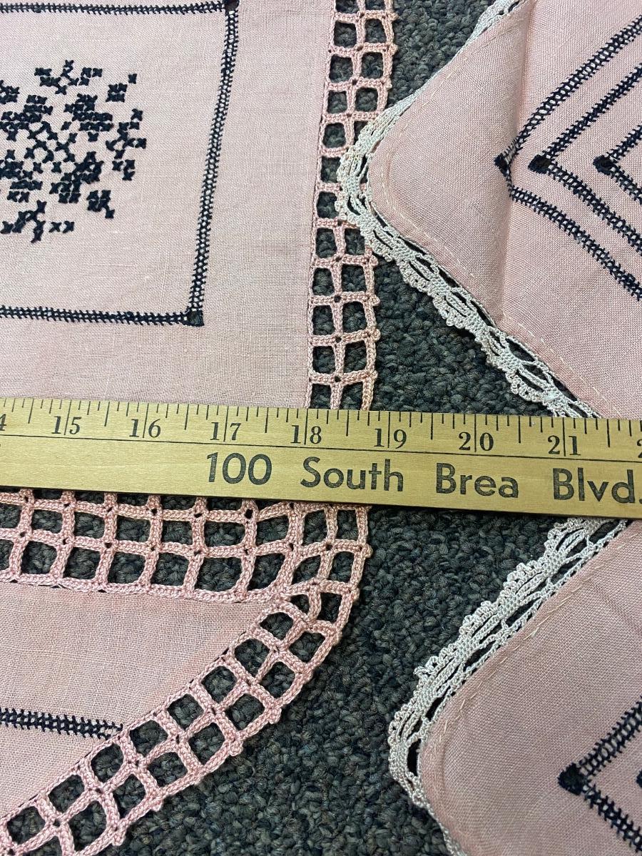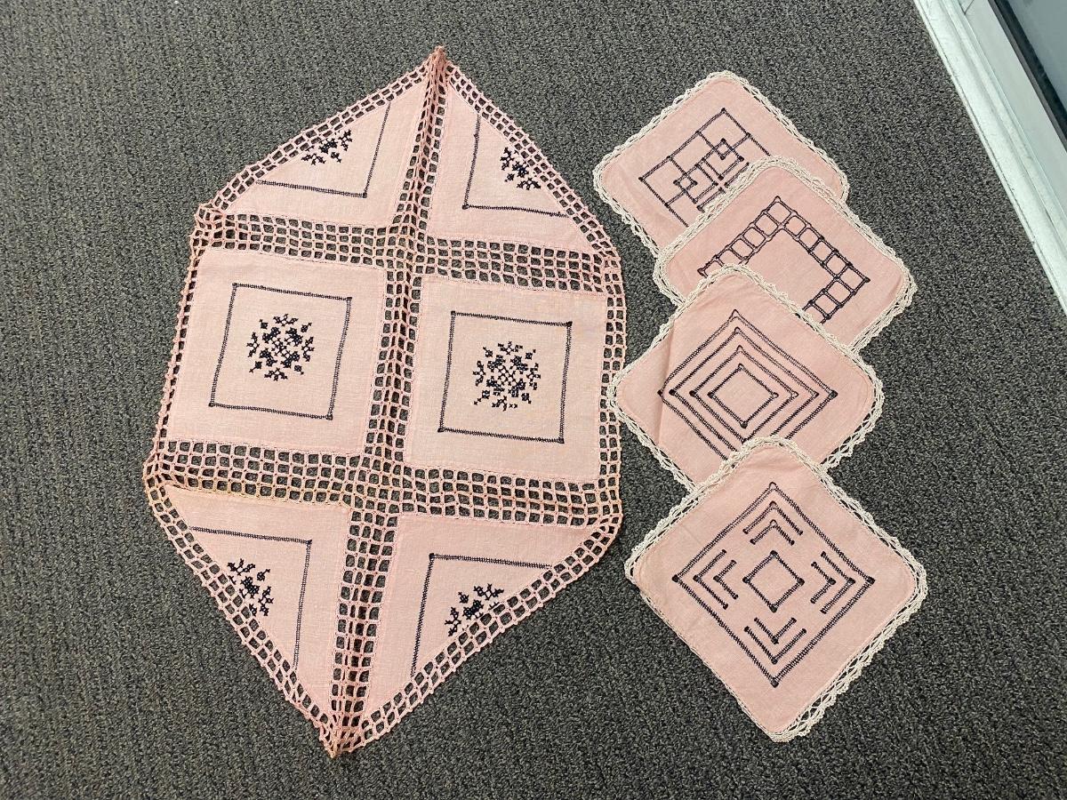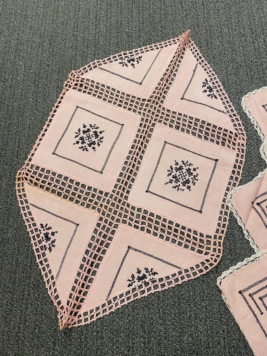 Vintage Pink Open Work Table Runner Hanky Napkin Doily Lot. Some light discolor but otherwise good condition.