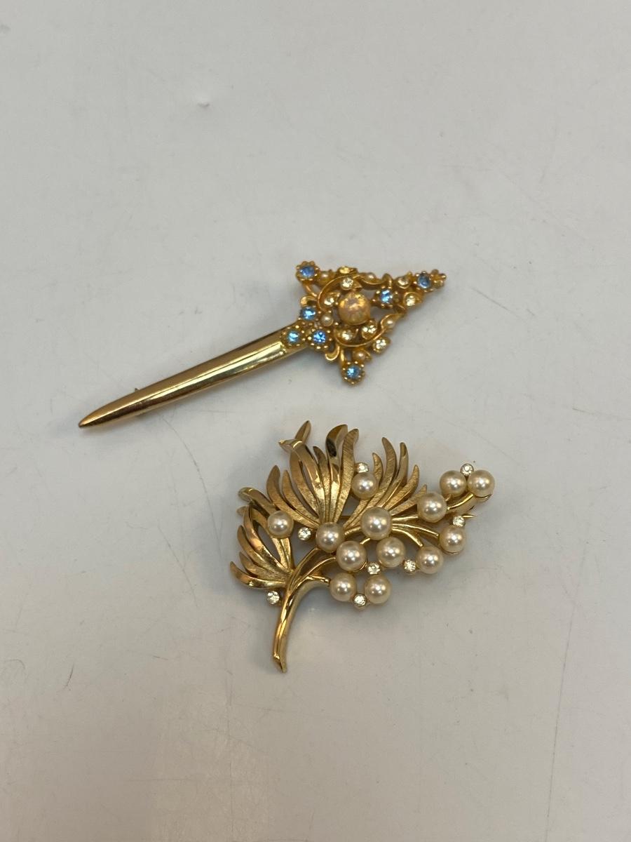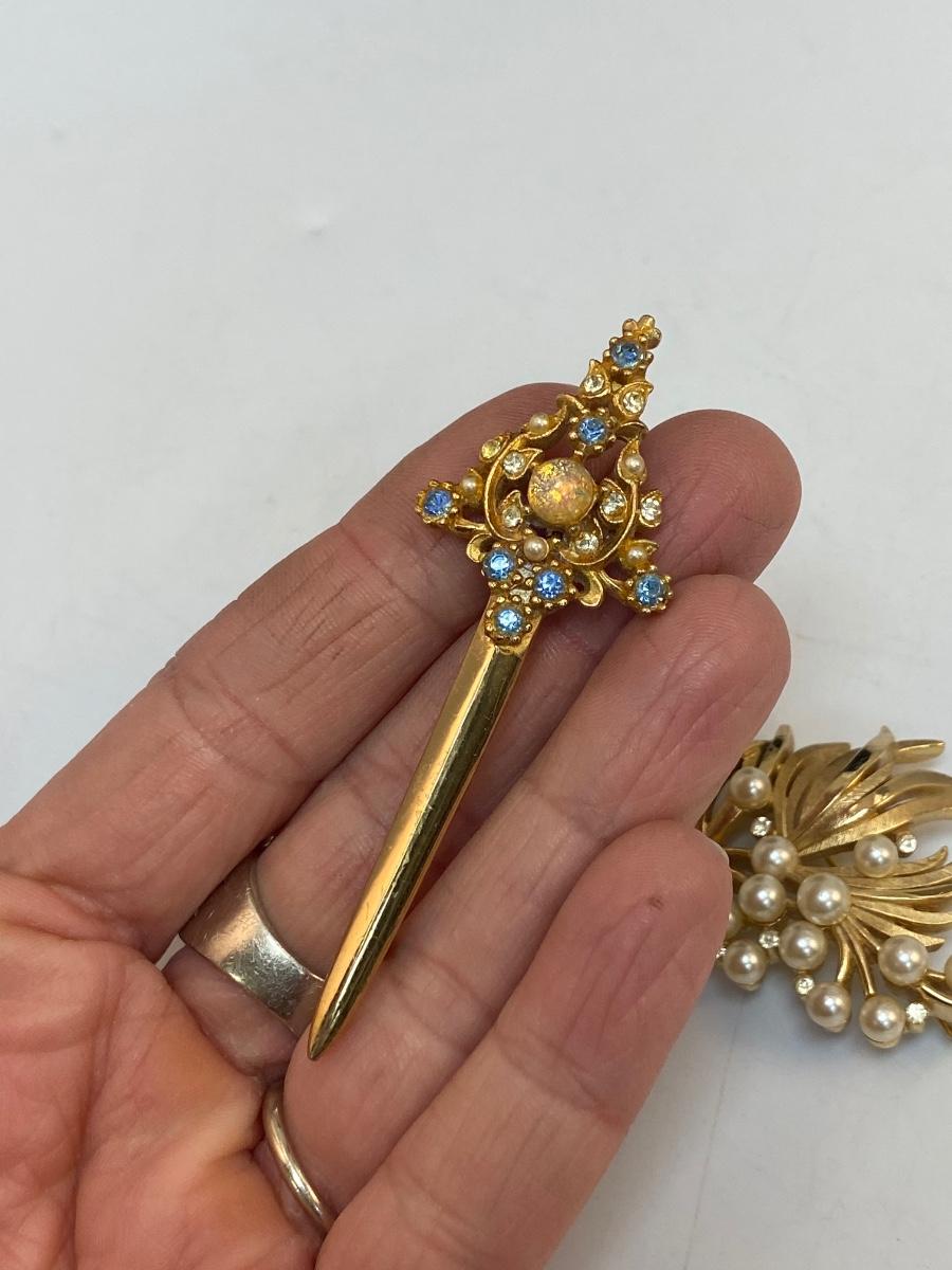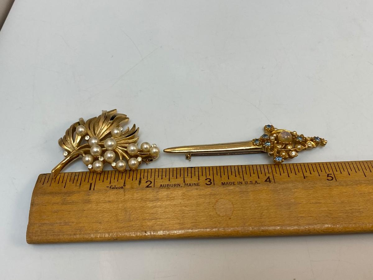 Vintage Gold Tone Pin Brooch Lot. The faux pearl and rhinestone pin is Trifari, the sword is unbranded.