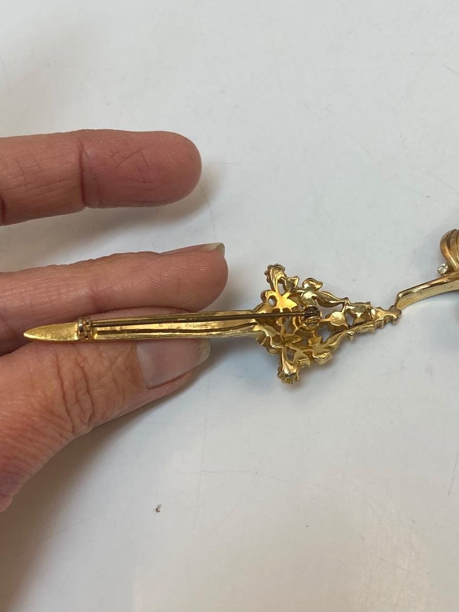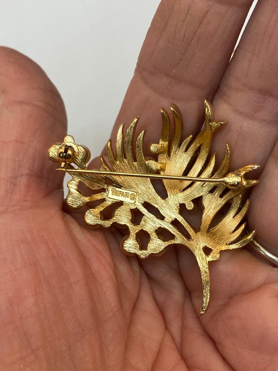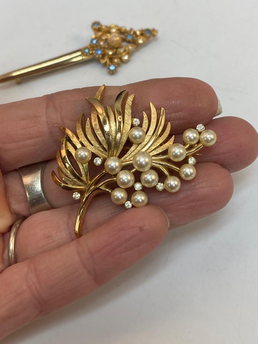 Vintage Gold Tone Pin Brooch Lot. The faux pearl and rhinestone pin is Trifari, the sword is unbranded.