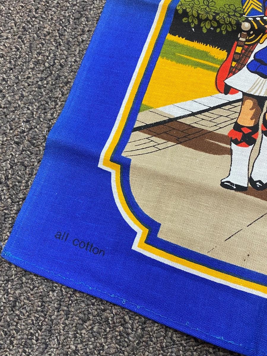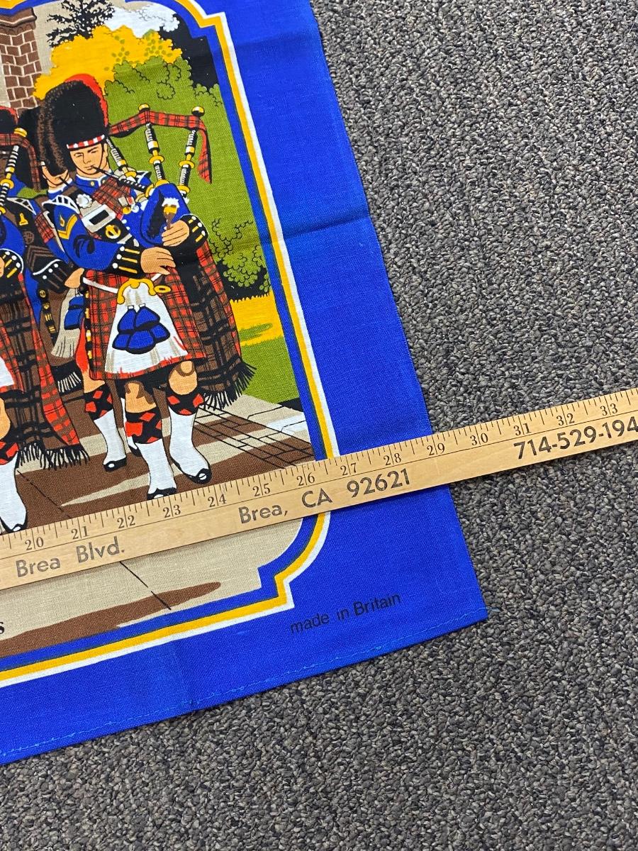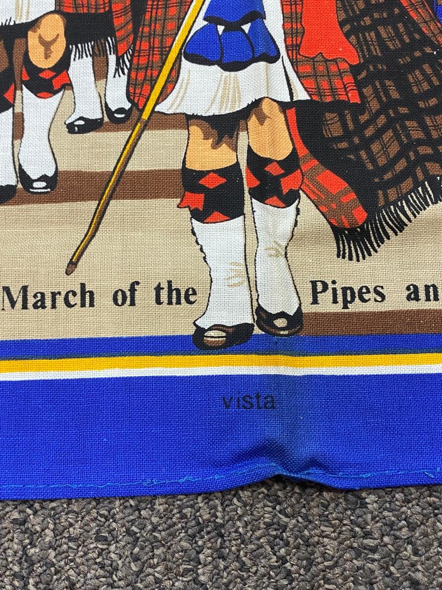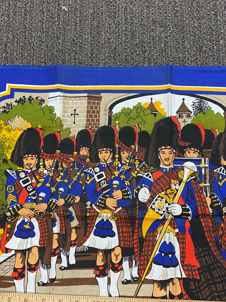 Vintage Frameable The March of the Pipes and Drums British Guard Tea Towel. In good condition. Does have light discoloration along a fold from storage, may come clean if washed. About 29" length.