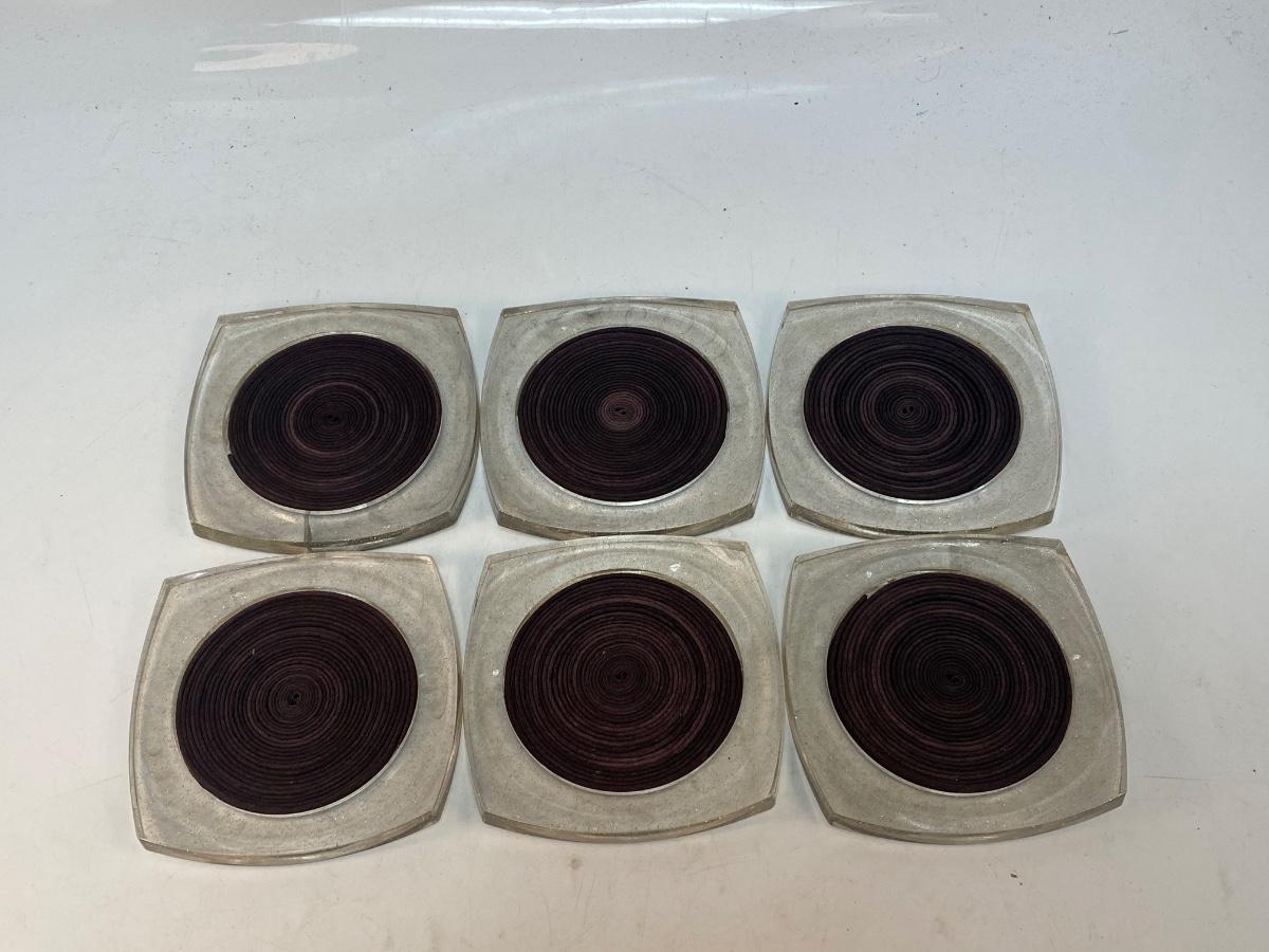 Set of 6 Retro Glitter Lucite Square Drink Coasters. In good condition. One does have a short internal crack from age more than likely. The center is a swirled cord or material for condensation.