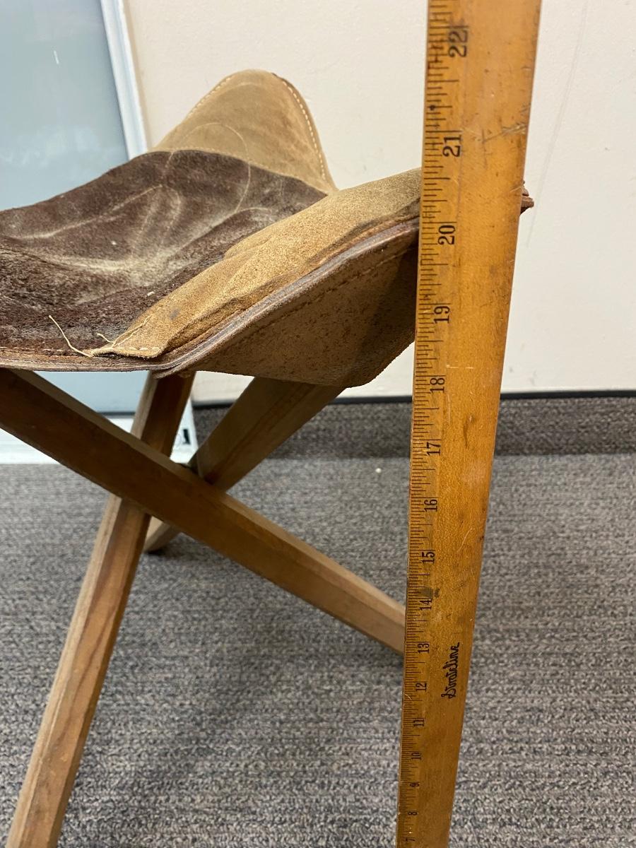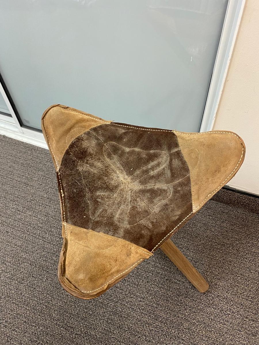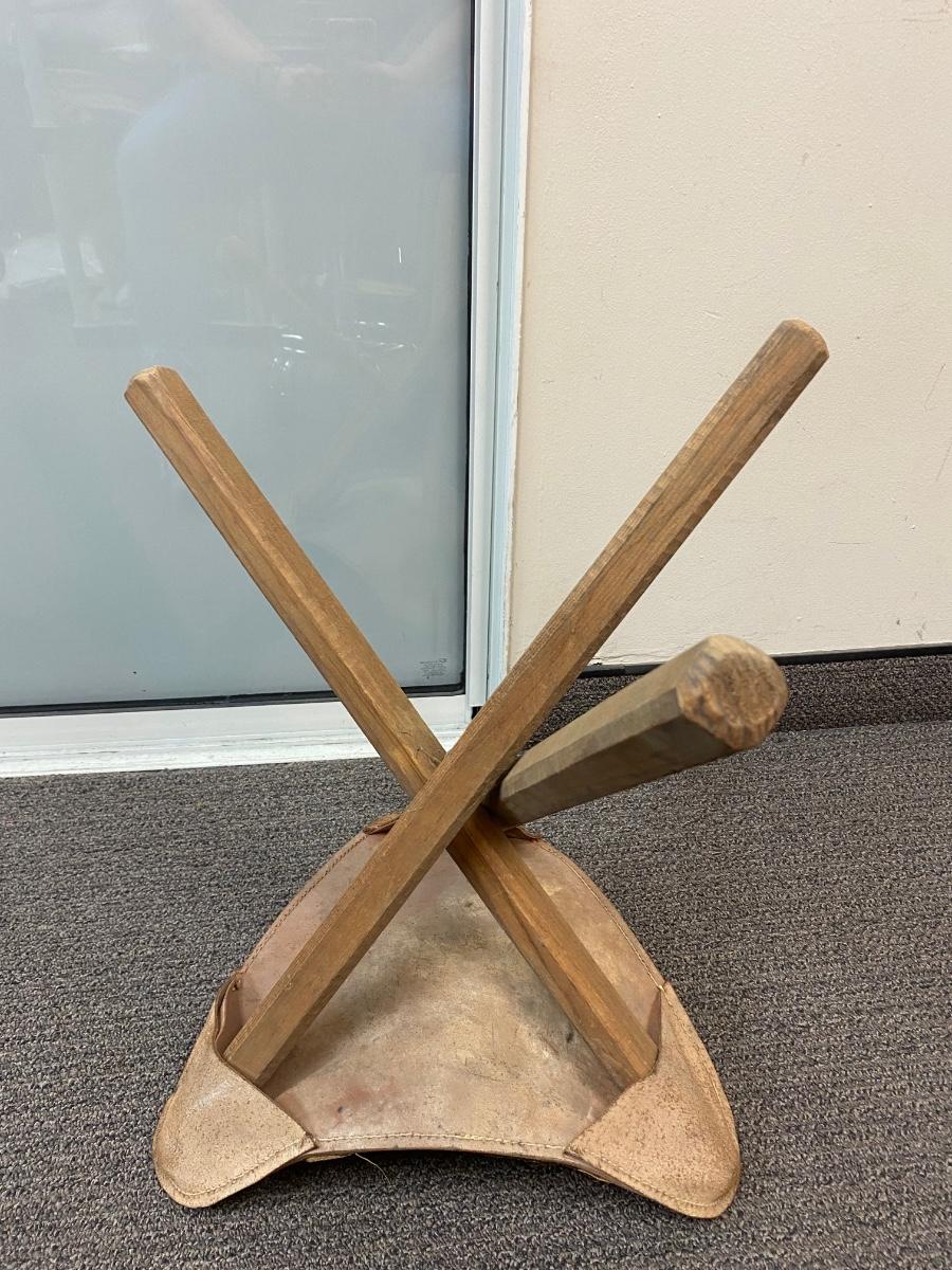 Vintage Tooled Leather Seat Tripod Folding Camp Stool Saddle Seat Chair Mid-Century