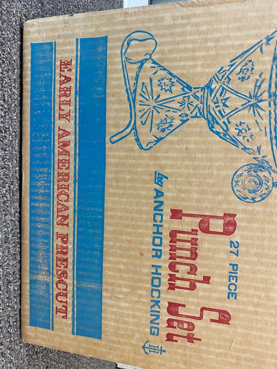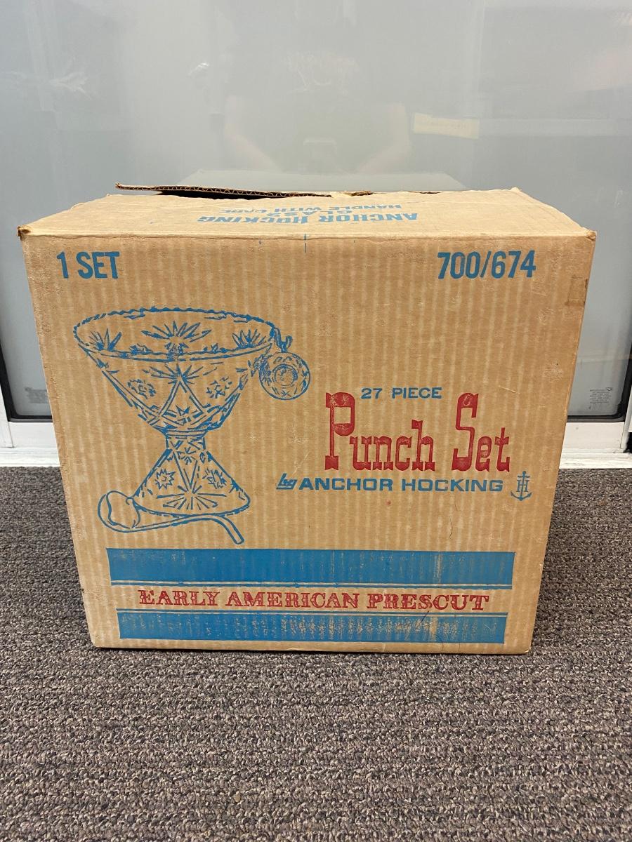 Vintage Anchor Hocking Punch Bowl Set in Original Box Early American Prescut. In good vintage condition. Two-piece footed punch bowl, plastic ladle, cups, and side hooks.