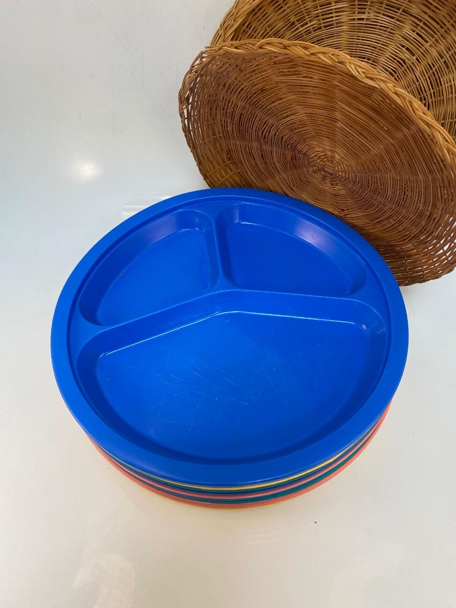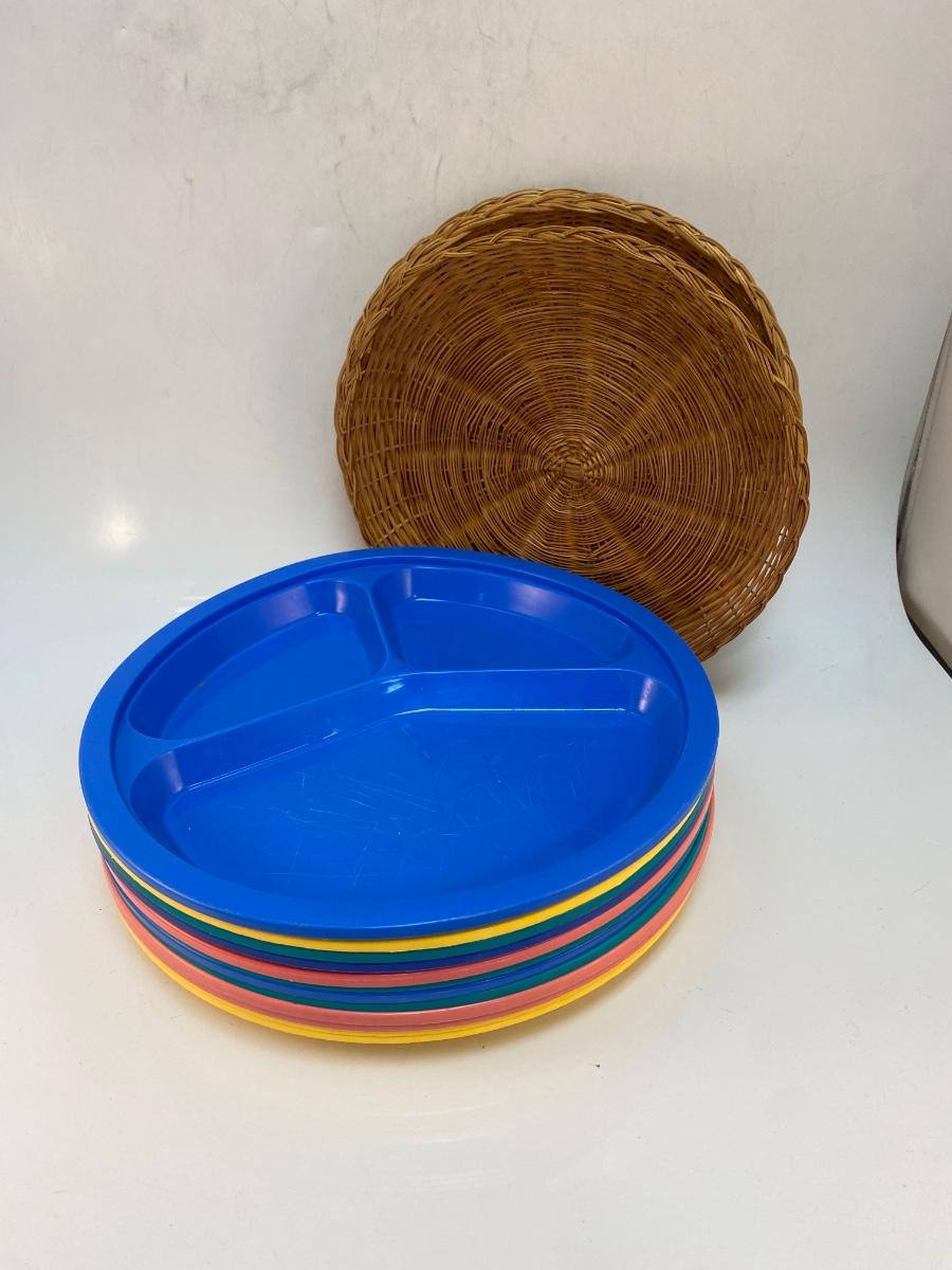 Set of Plastic Divided Picnic BBQ Childrens Kids Plates & Woven Wicker Rattan Paper Plate Holders. In good previously used condition.