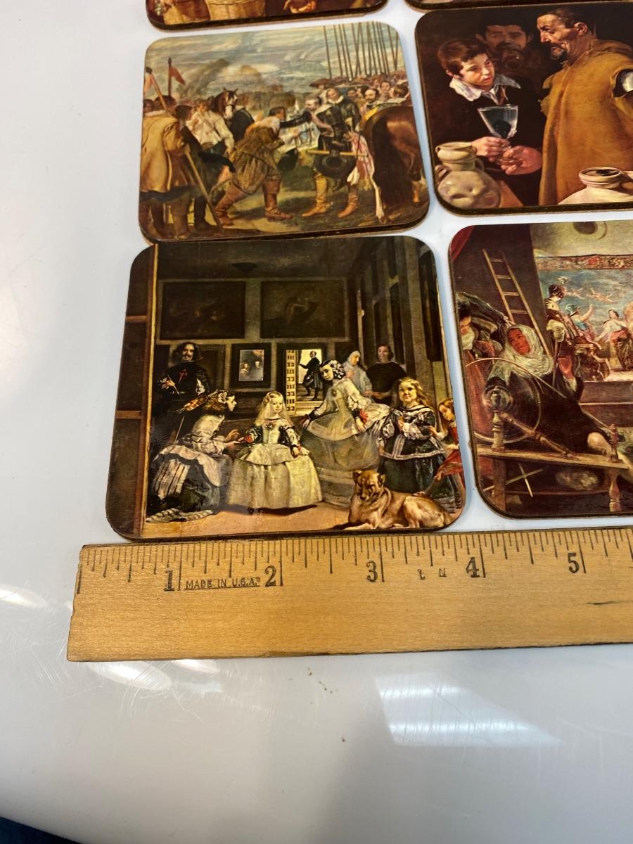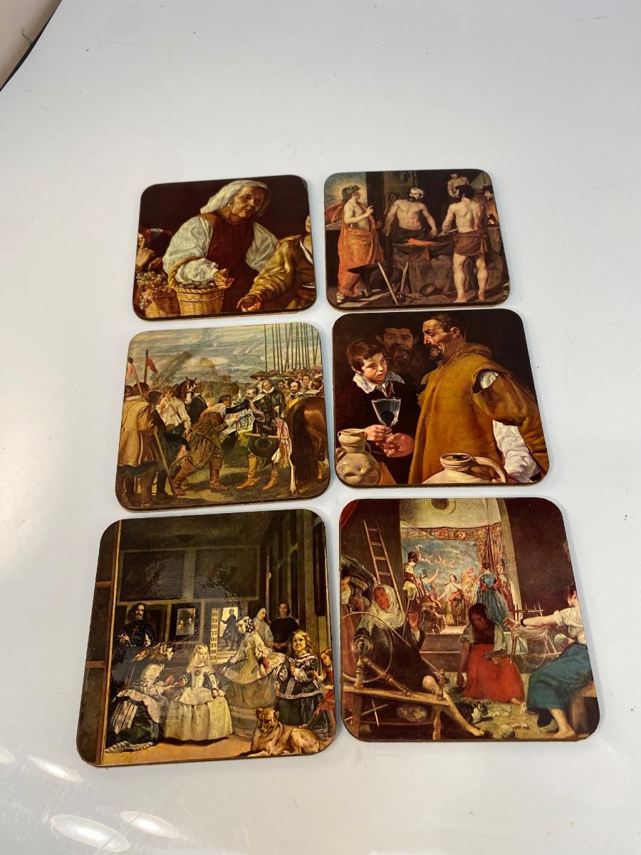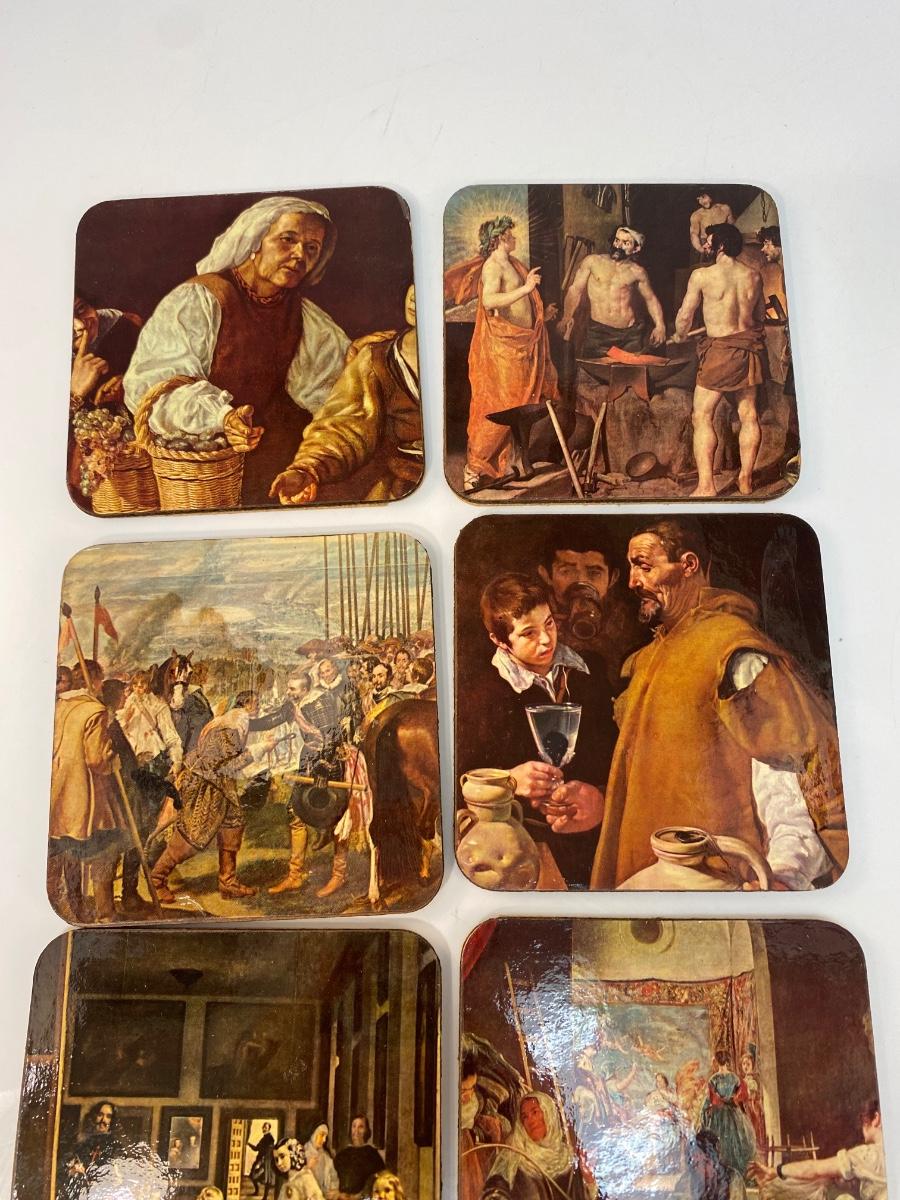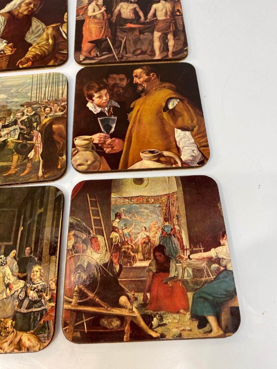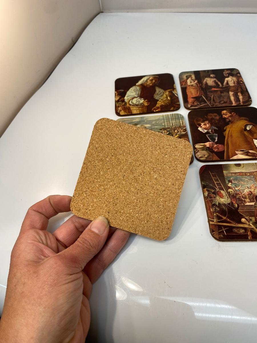 Set of 6 Cork Backed Drink Coasters Featuring the Art of Diego Velaquez. In good condition, do not look like they were used for drink coasters. 4" size.
