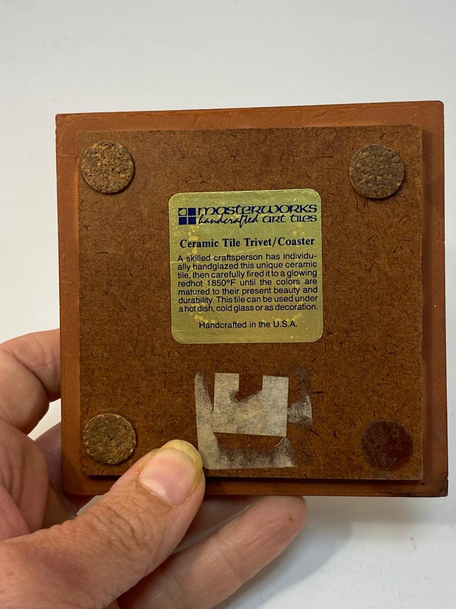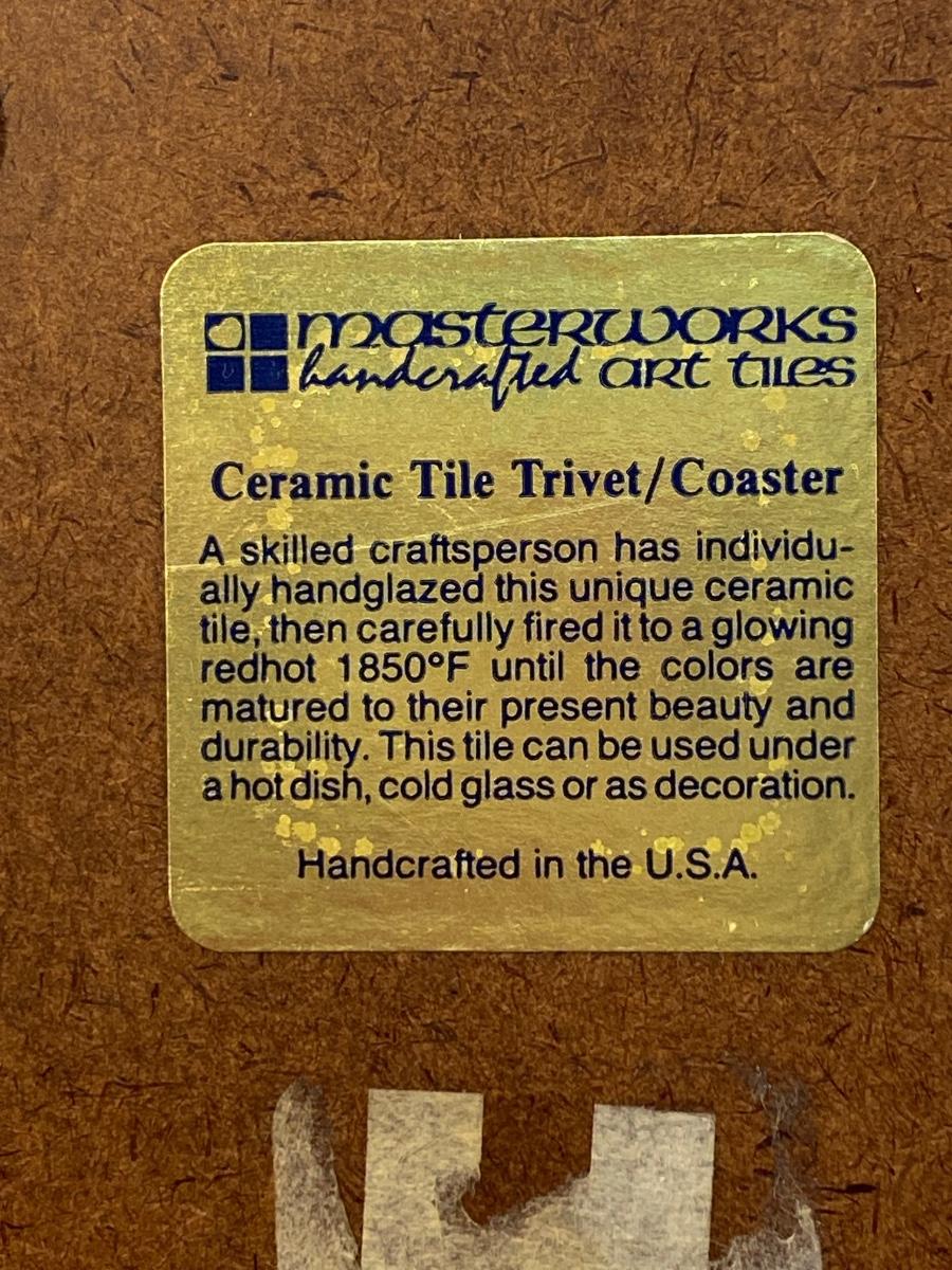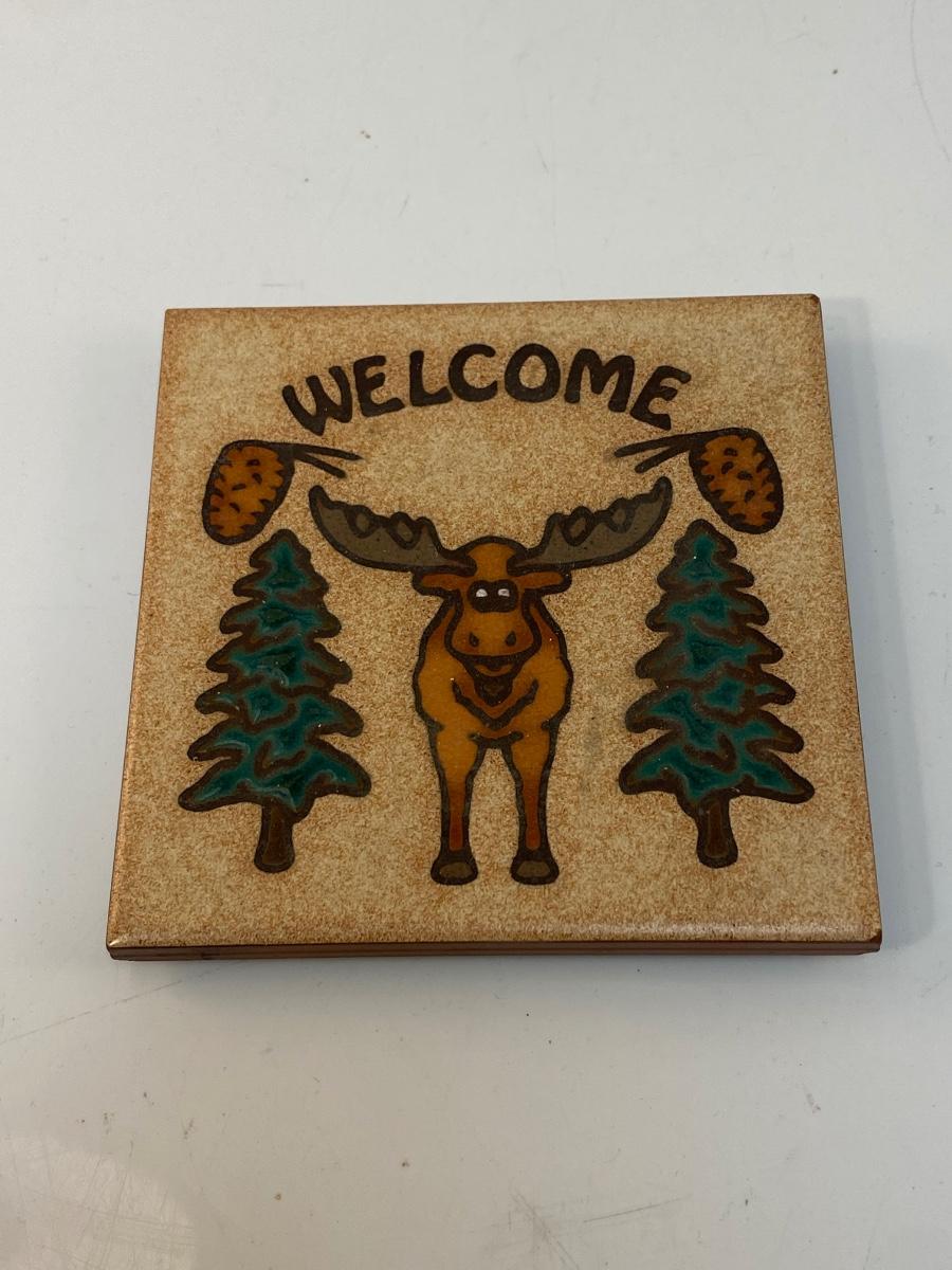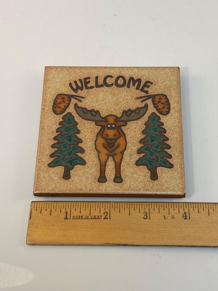 Rustic Moose with Pine Trees Welcome Tile Trivet Coaster Masterworks Handcrafted Art Tiles. 4" size. Good condition.