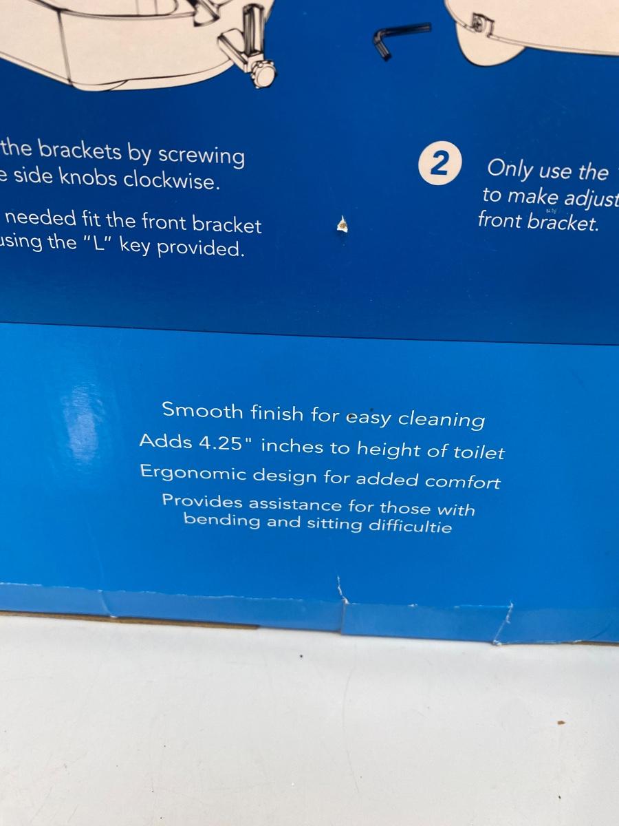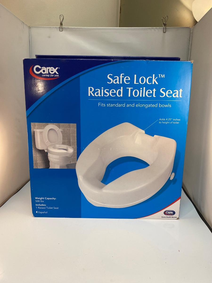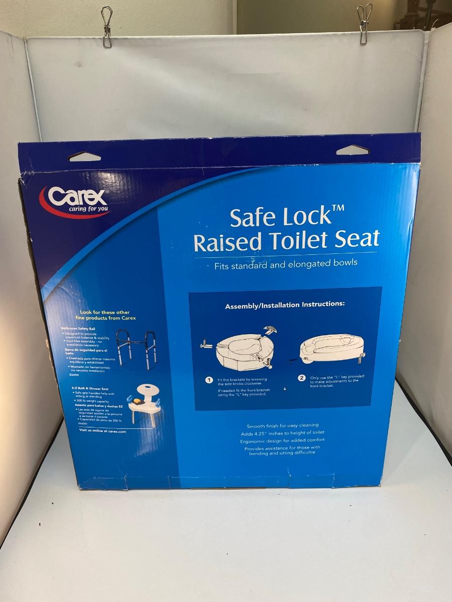 NEW Unused Safe Lock Raised Toilet Seat from Carex in Original Box. In original plastic with hardware and instructions.