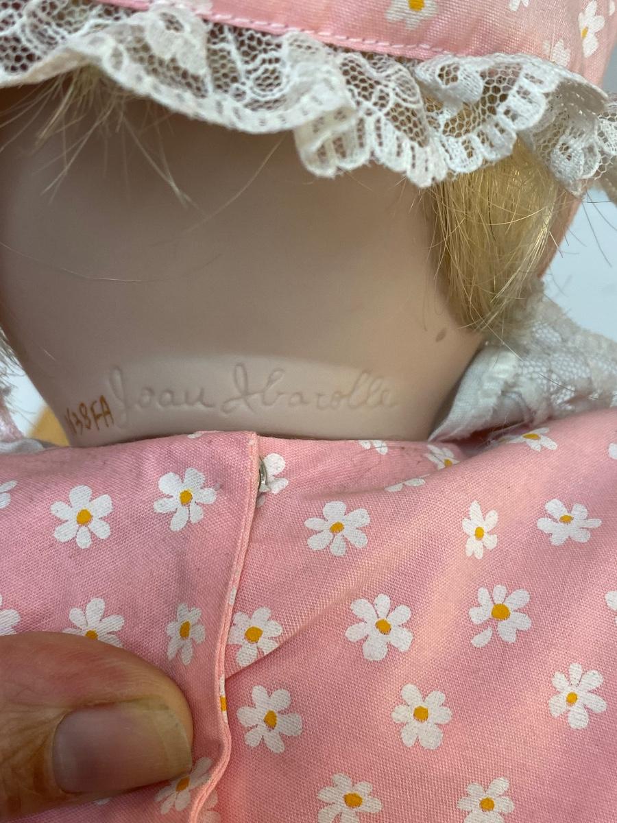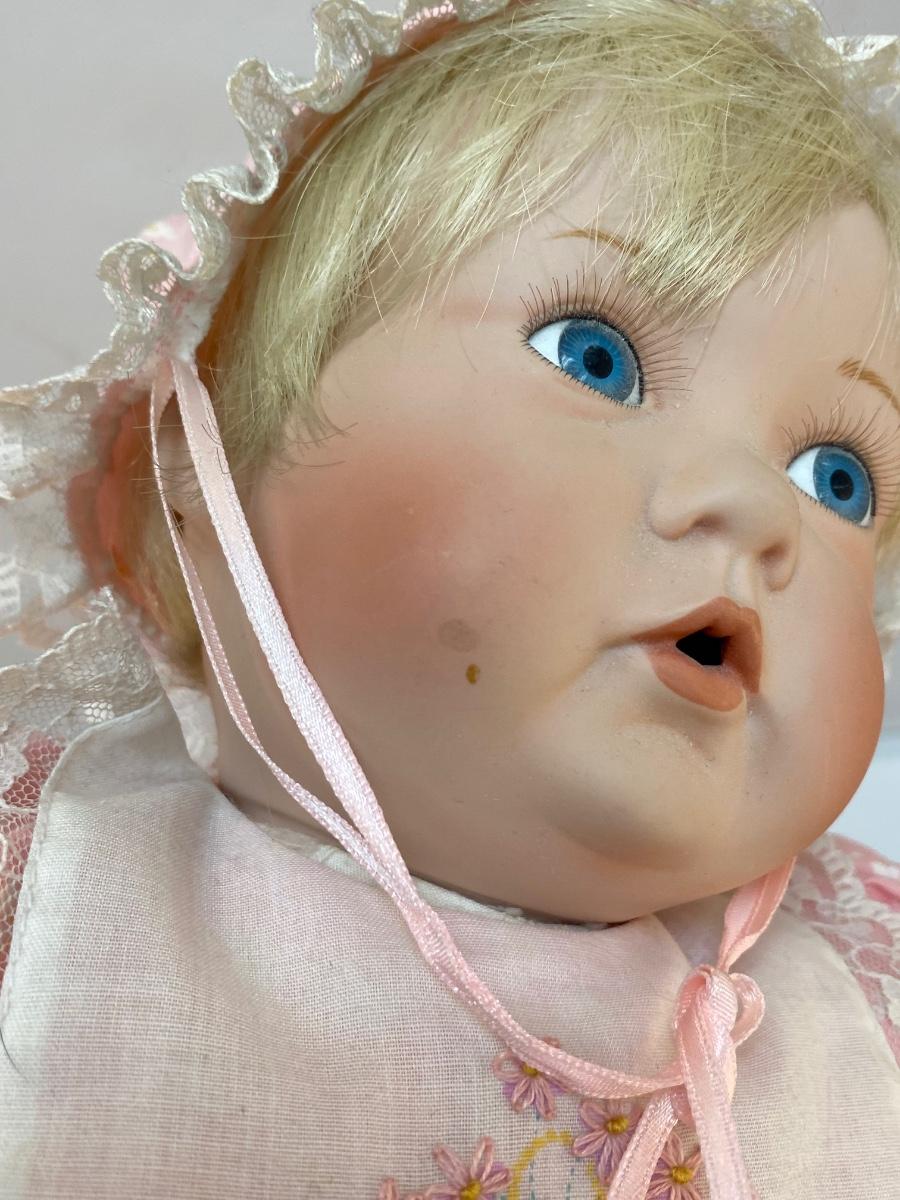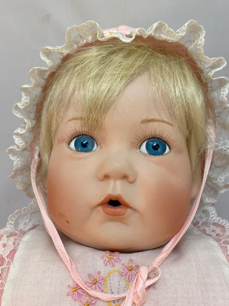 Porcelain Bisque Baby Doll Blond Hair Blue Eyed Girl in Pink Outfit. In good condition. Signed on neck. Has a small smudge on cheek, may be dusty from previous display.