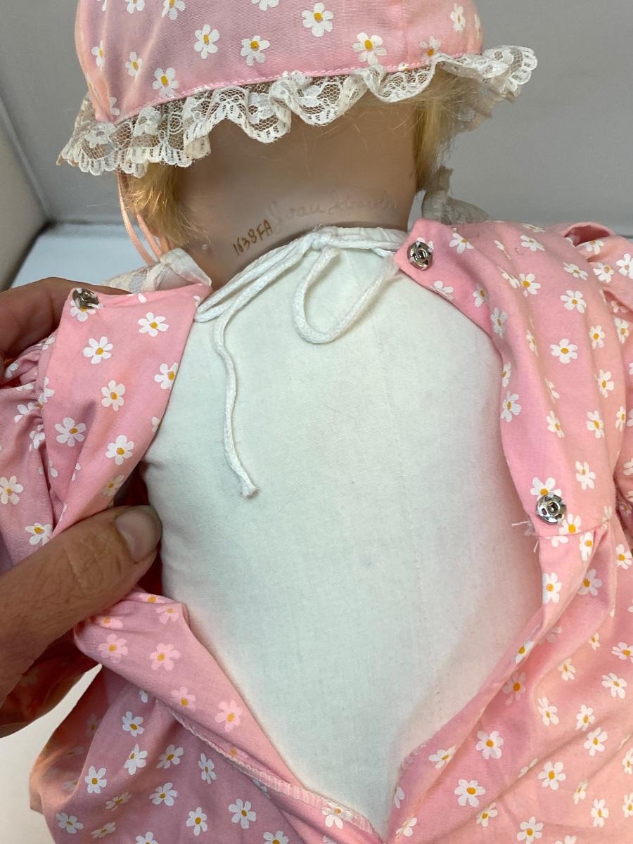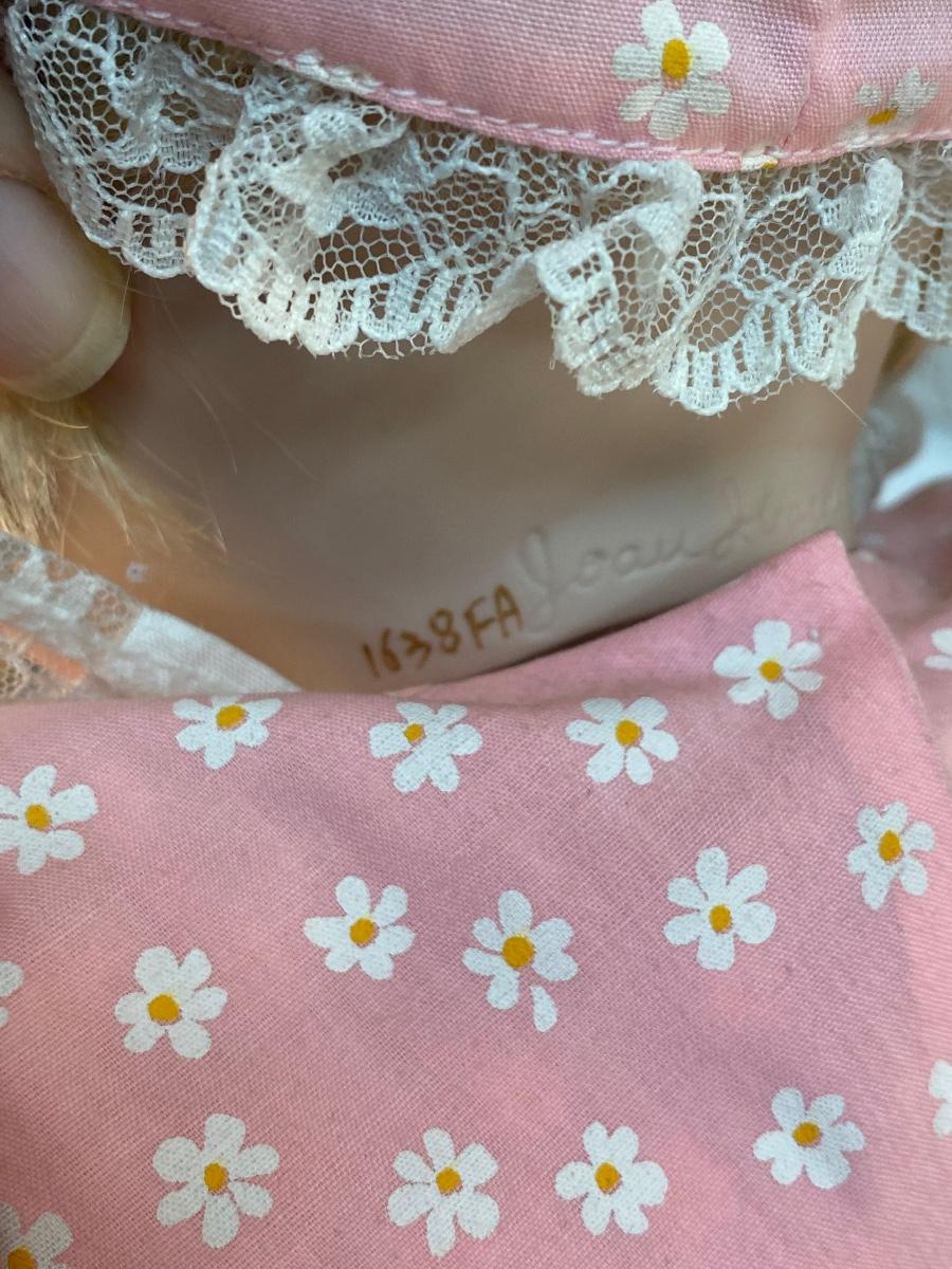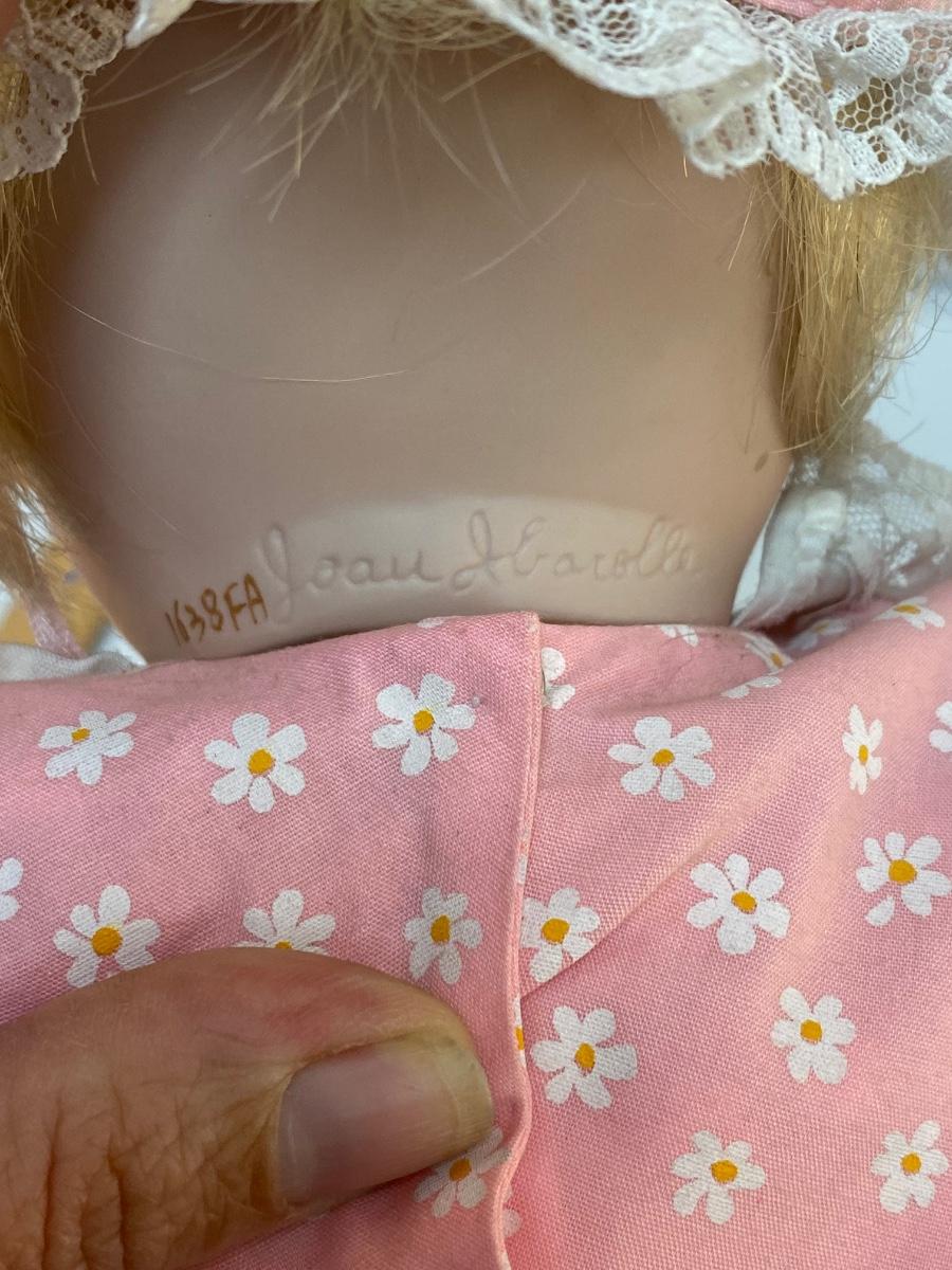 Porcelain Bisque Baby Doll Blond Hair Blue Eyed Girl in Pink Outfit. In good condition. Signed on neck. Has a small smudge on cheek, may be dusty from previous display.