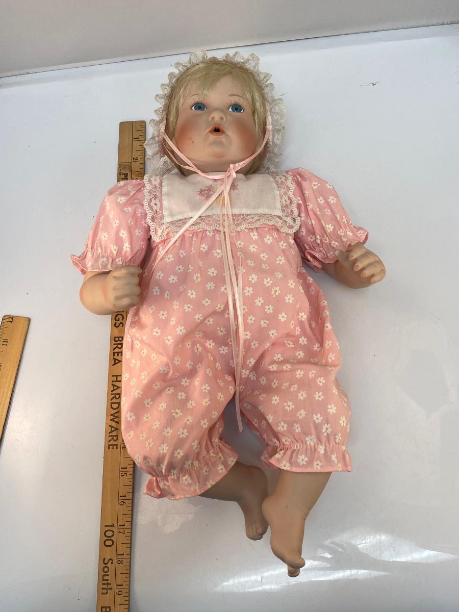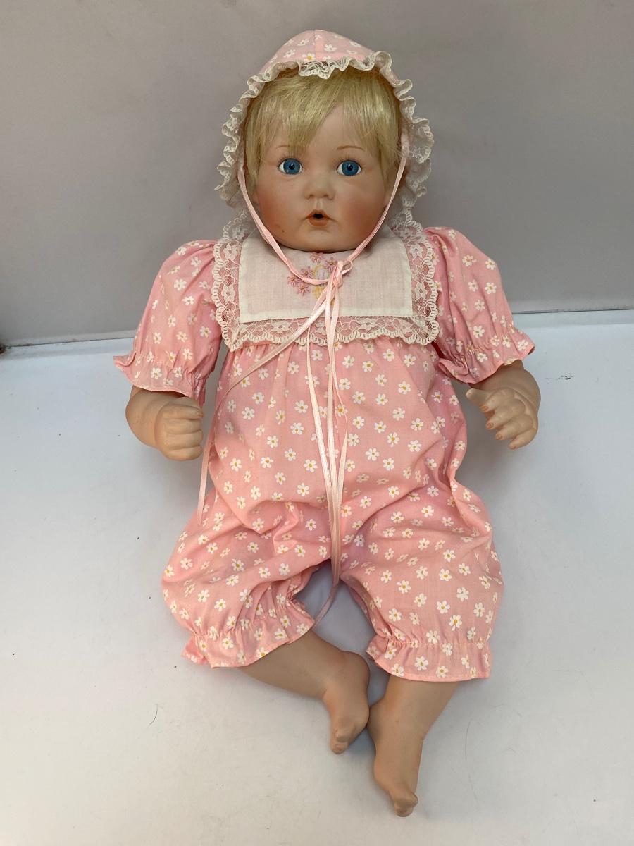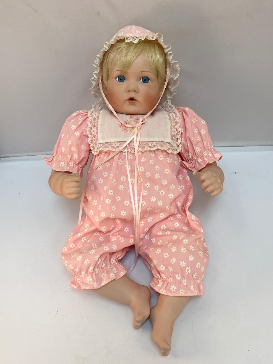 Porcelain Bisque Soft Body Baby Doll Blond Hair Blue Eyed Girl in Pink Outfit