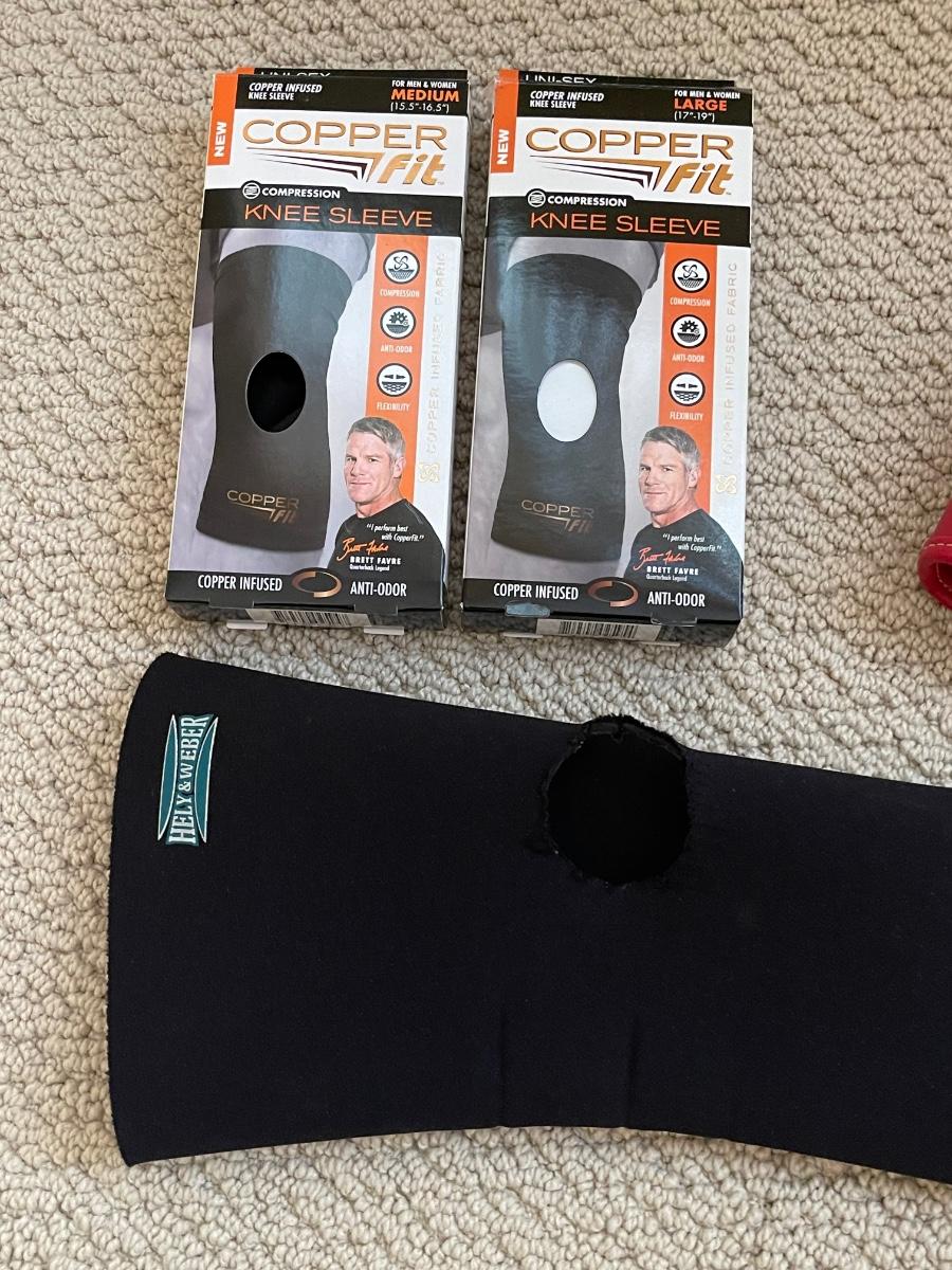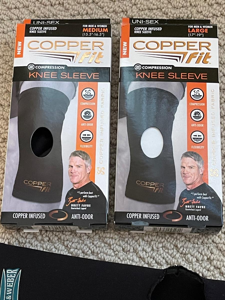 This lot includes two NEW copper fit Knee Sleeves - Size medium and large. It also includes a stretch Hely & Weber knee sleeve size large.