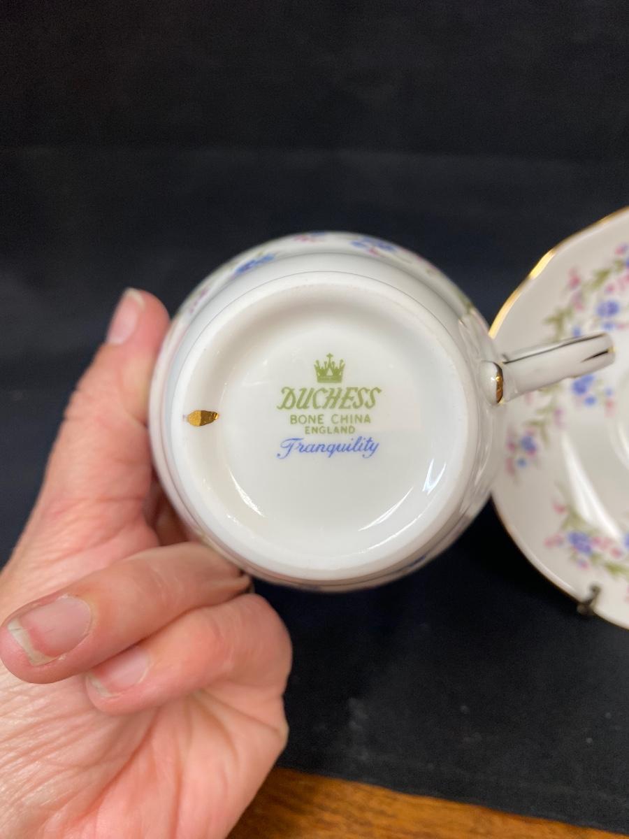 Vintage Duchess Bone China Tranquility Pattern Small Blue Floral Teacup and Saucer. In good condition.