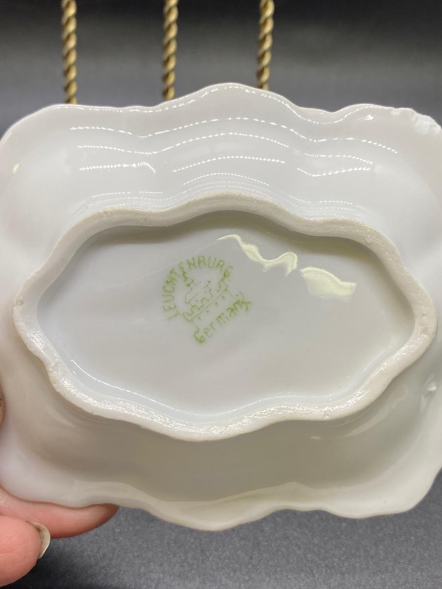 Antique Leuchtenburg Germany Floral Small Trinket Bowl Dish. Scalloped edge with maple leaf and rose pattern. Very small chip in the underside edge. Marked on the bottom. Under 5" size.