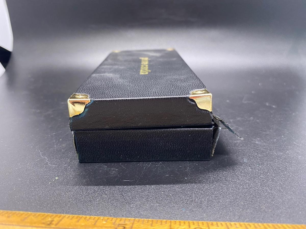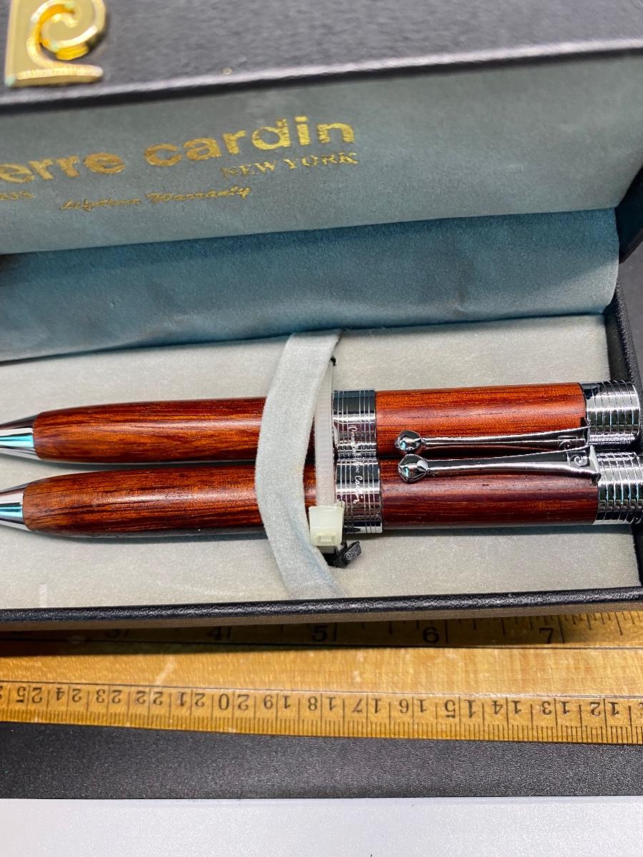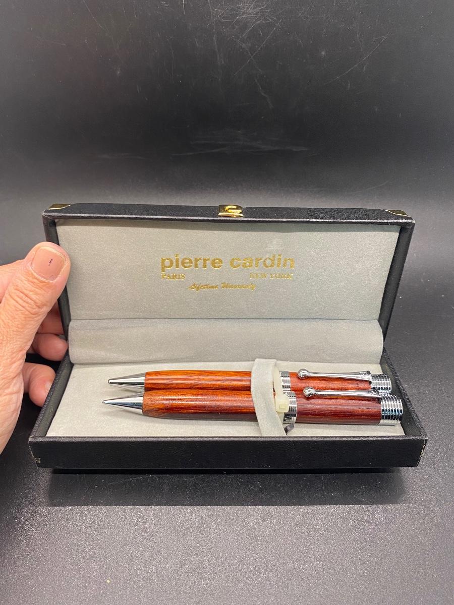 Wood grain Pierre Cardin pen & pencil set. Comes in original box, but there is wear to hinge side of box. Pencil has lead, pen tries to write. Looks like pen may have been used and just replaced in the box.