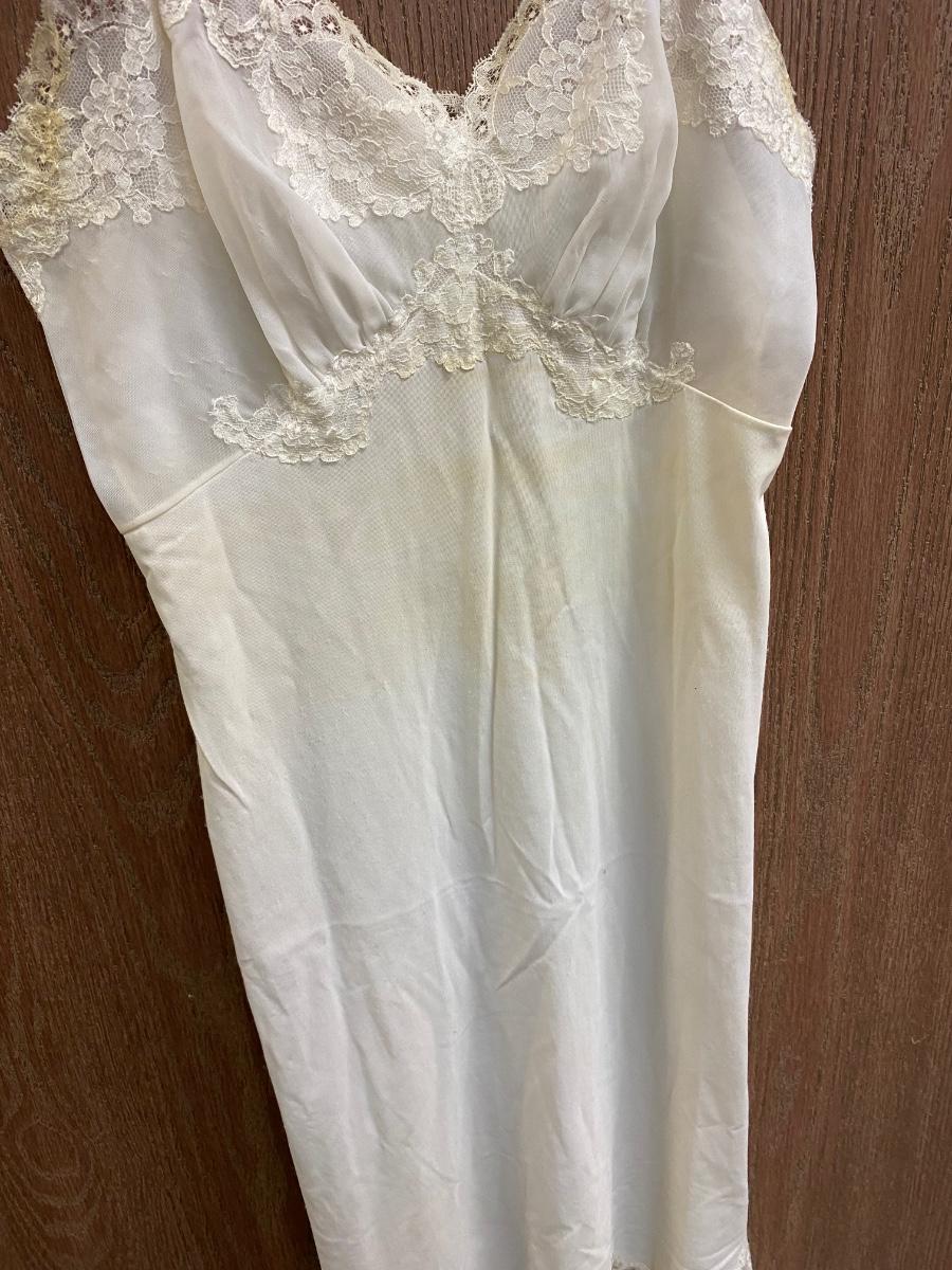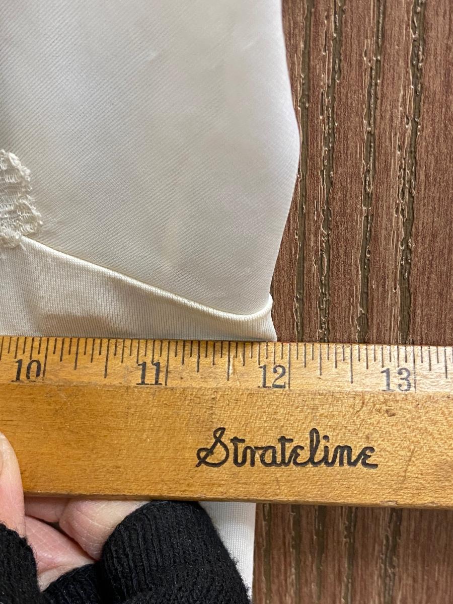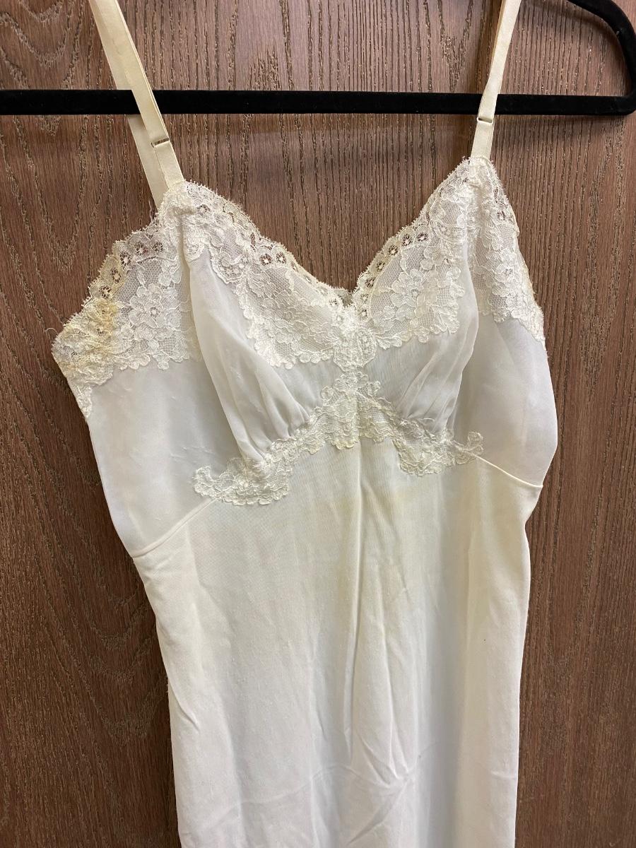 Vintage White Ivory Lace Trim Slip with Adjustable Straps. In vintage worn condition. Has some very light discolor and spots. One strap has been repaired. Armpit measures about 12".