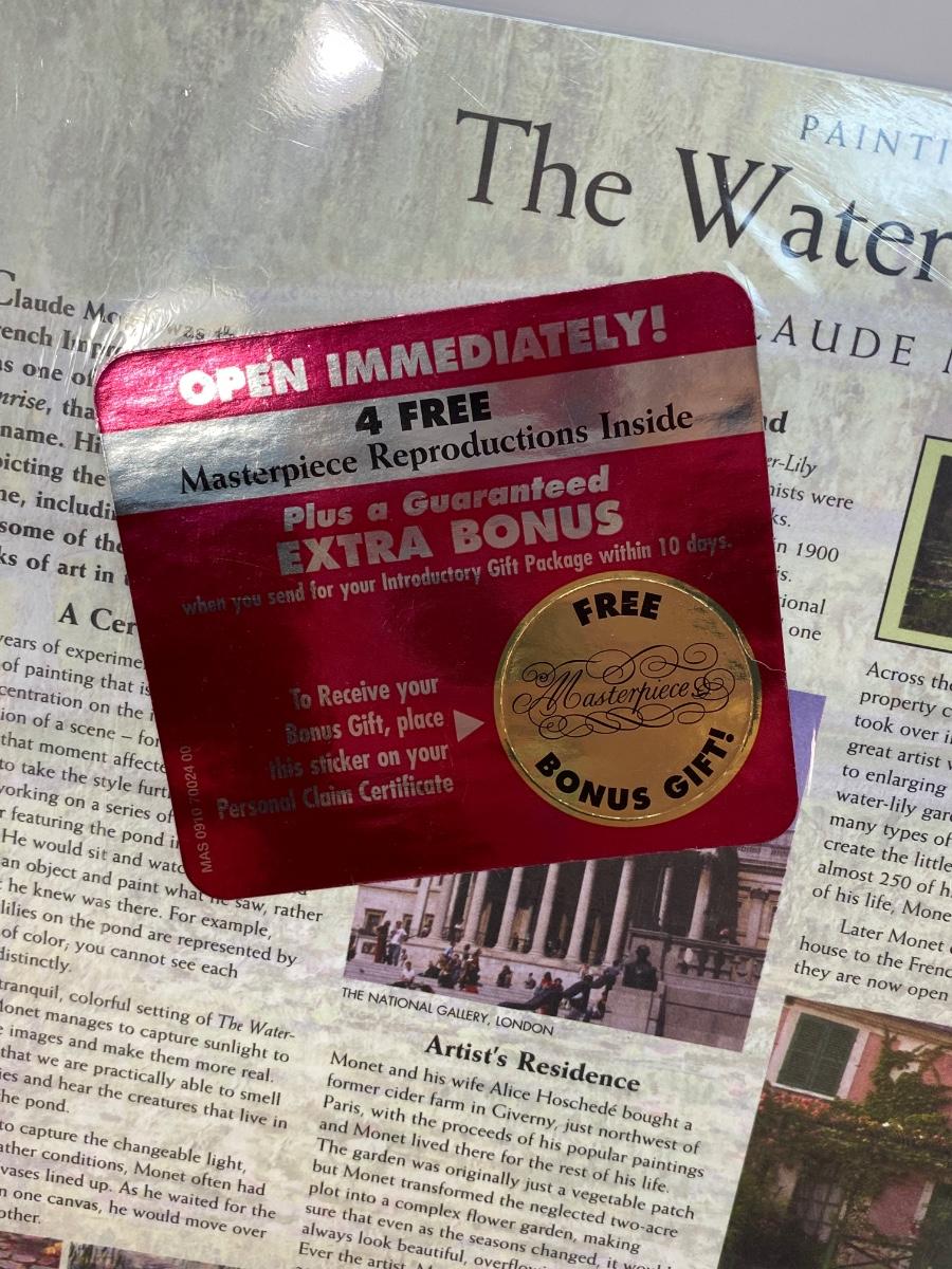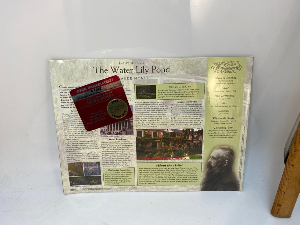 Unopened Set of 4 Painting Masterpieces Reproduction Prints Mona Lisa The Water Lily Pond. Sealed package, only the front and back art pieces known so the two others are a mystery. Good condition, ready to frame.