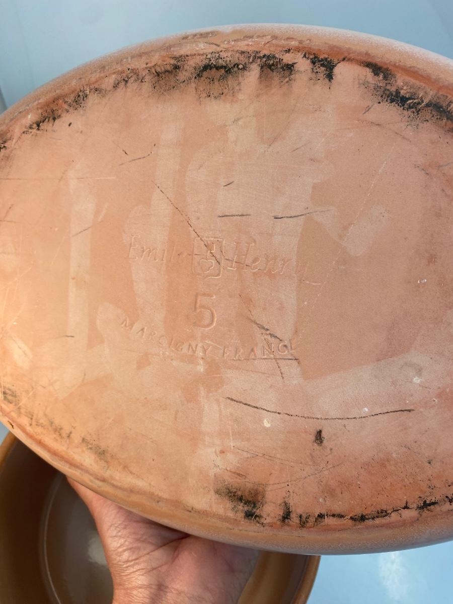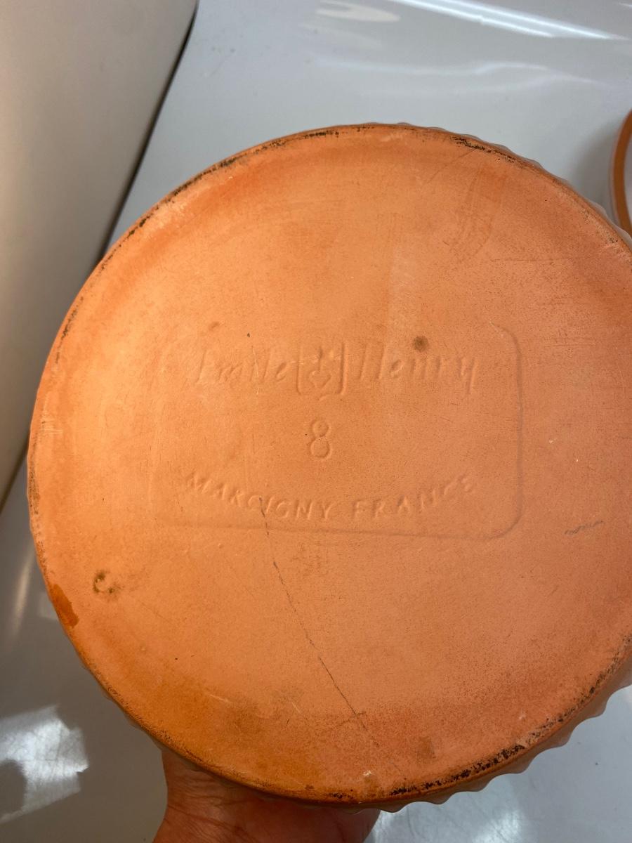 Pair of Emile Henry Glazed Terra Cotta Casserole Baking Dishes Made in France. One oval and one deep round. In good condition. There is a small chip in glaze on the oval dish, does not affect use.