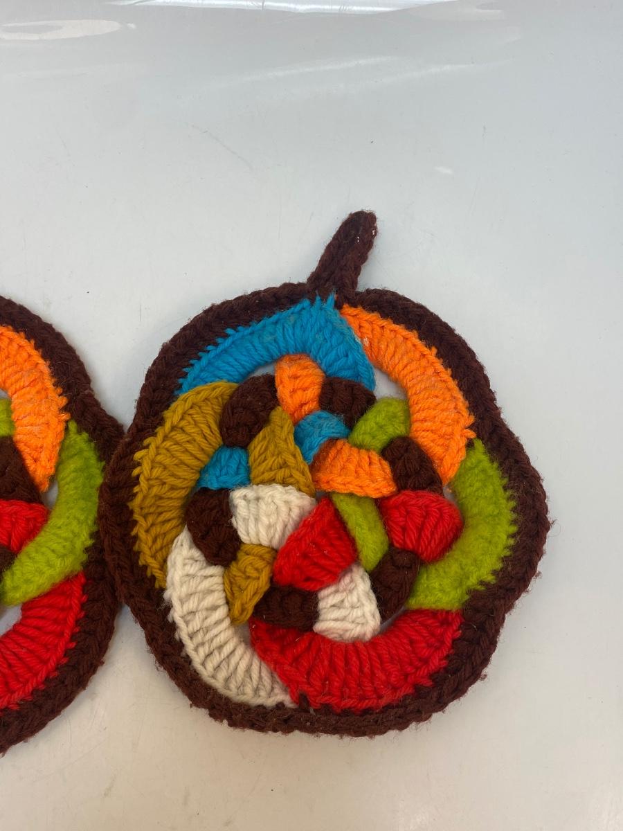 Pair of Vintage Colorful Knot Crochet Potholder Trivets. In good vintage condition, light signs of use.
