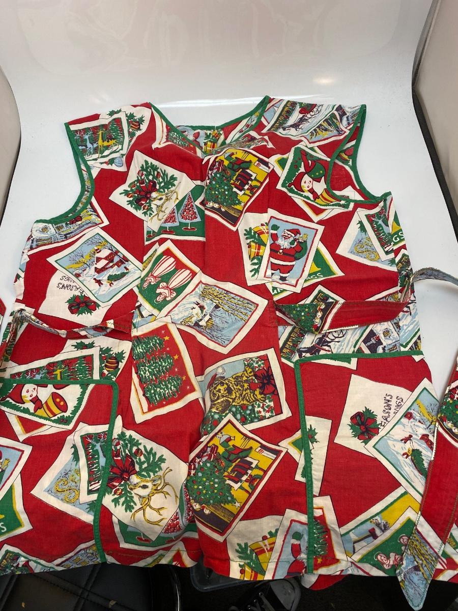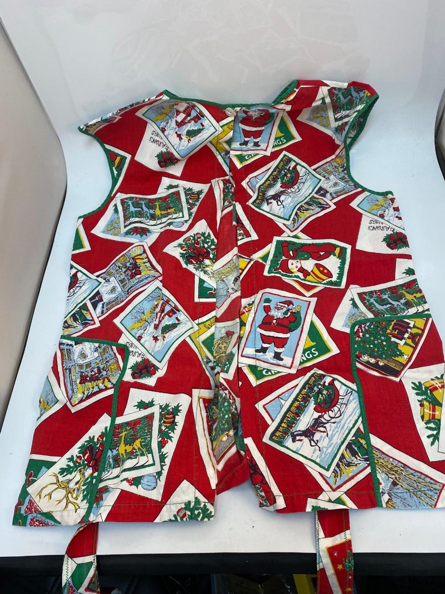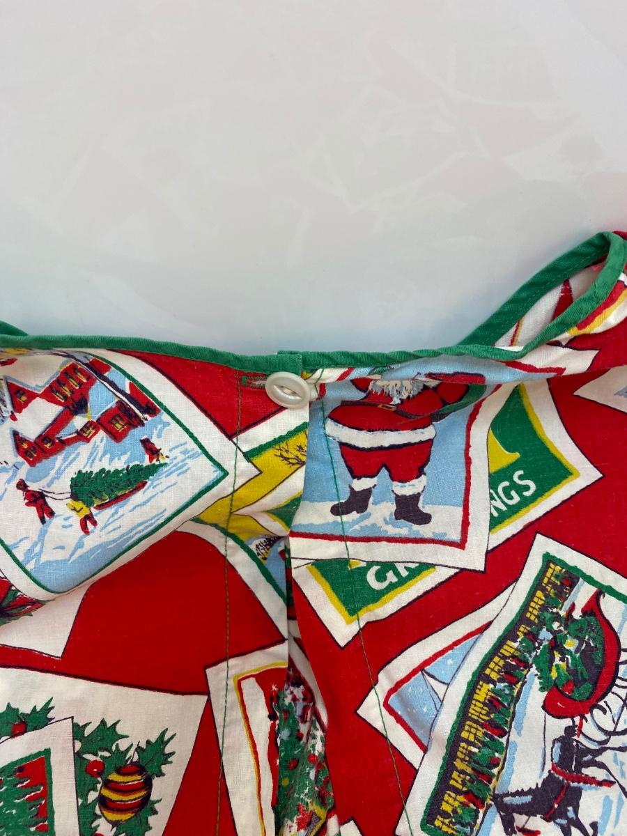 Vintage Christmas Holiday Smock Apron Button Neck Tie Waist