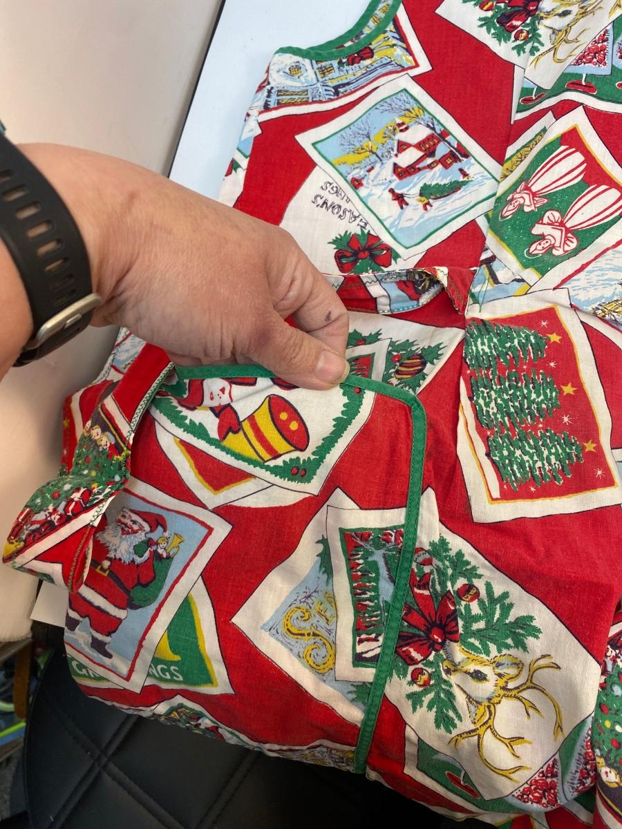 Vintage Christmas Holiday Smock Apron Button Neck & Tie Waist. In good vintage condition. Looks to be a size medium.