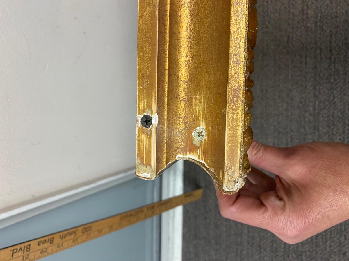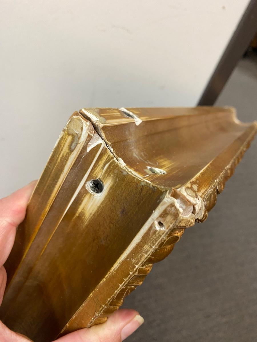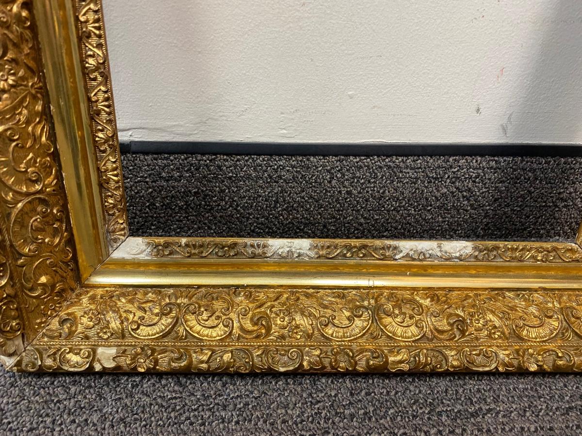 Vintage Gold Painted Ornate Picture Art Frame No Glass. Fair condition. Needs some patching and repainting. Screwed together at corners. Great for project repurpose.