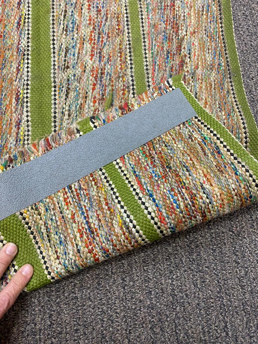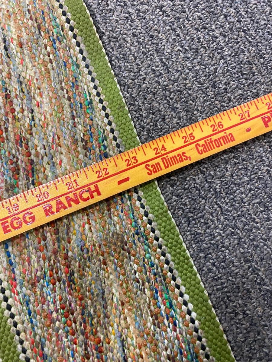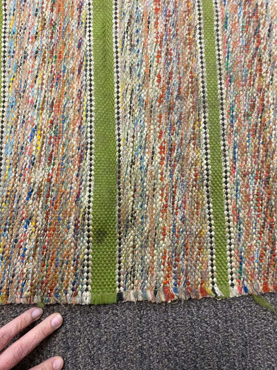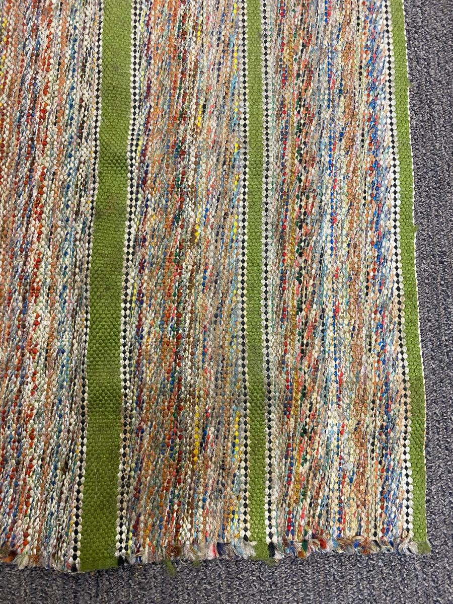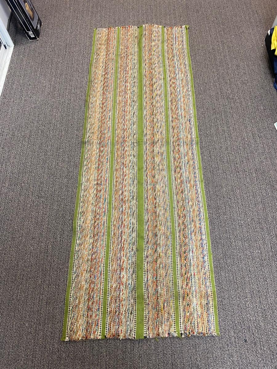 Vintage Retro Multicolored Green Striped Hallway Runner Throw Rug. Almost 6' length. Has skid tape at ends. Does have spots but should be able to go through the wash.