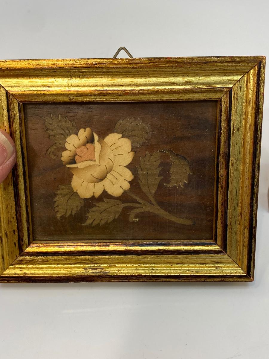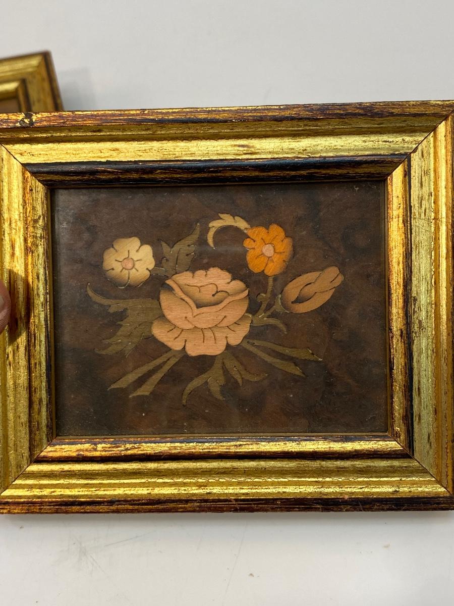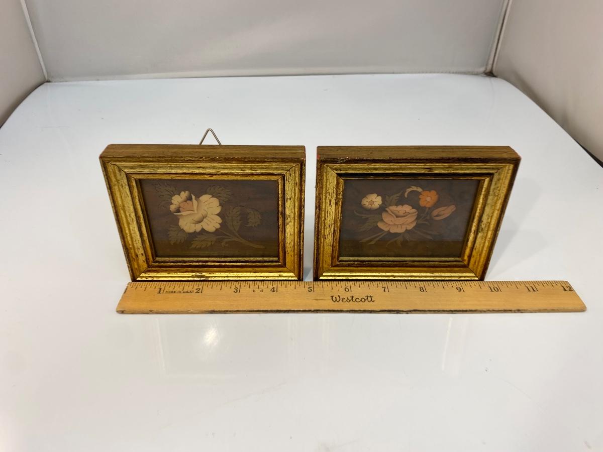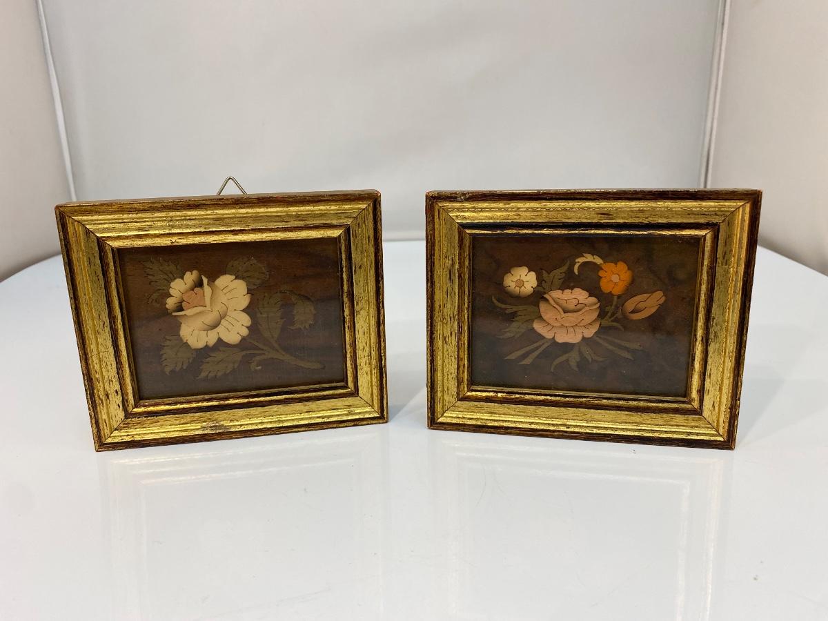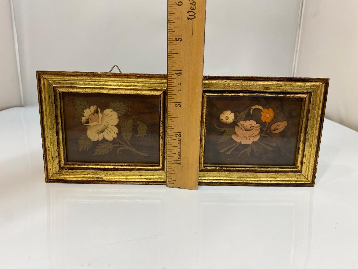 Pair of Vintage Wood Inlaid Floral Art in Gold Frames. In good condition. Matching style of wood art just different images. About 5"x4" size.