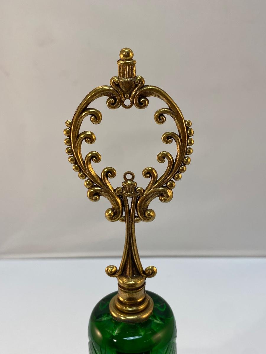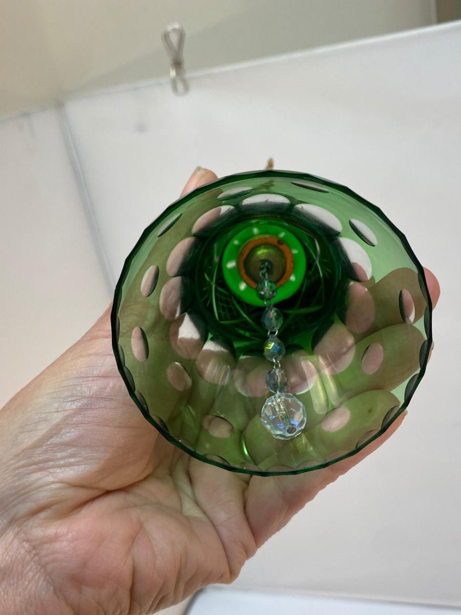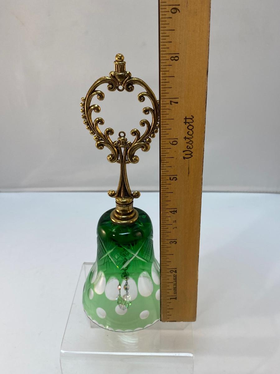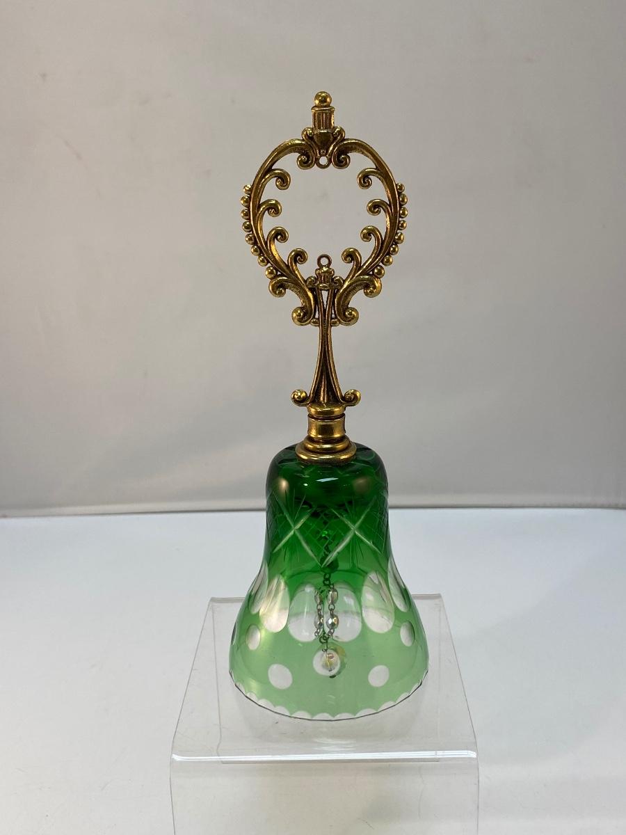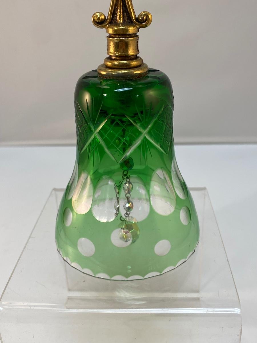 Vintage Green Cut to Clear Bohemia Style Glass Bell with Brass Tone Metal Top