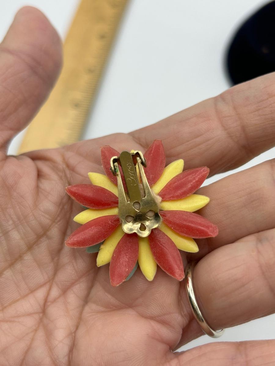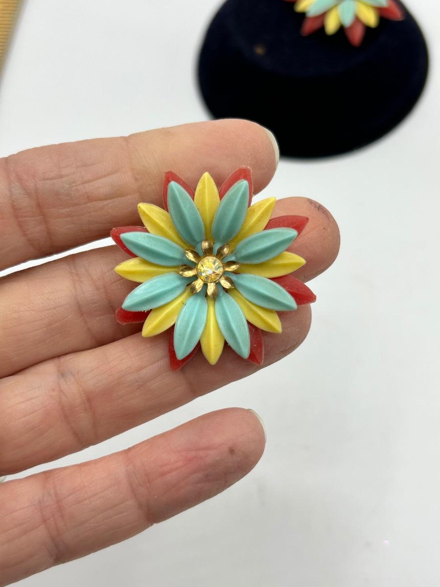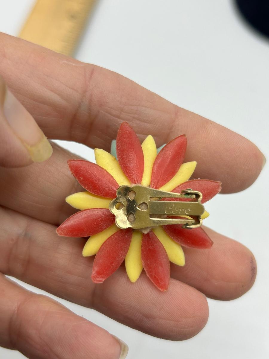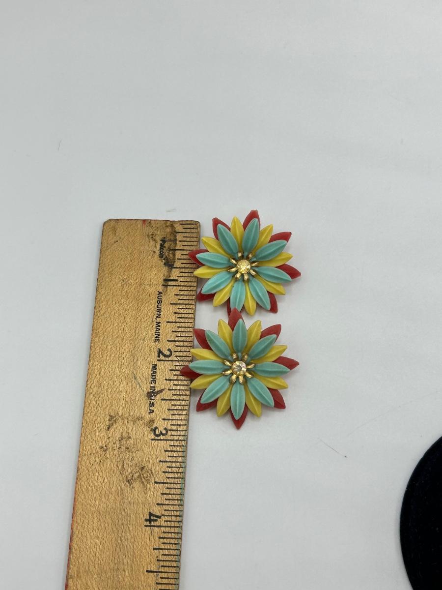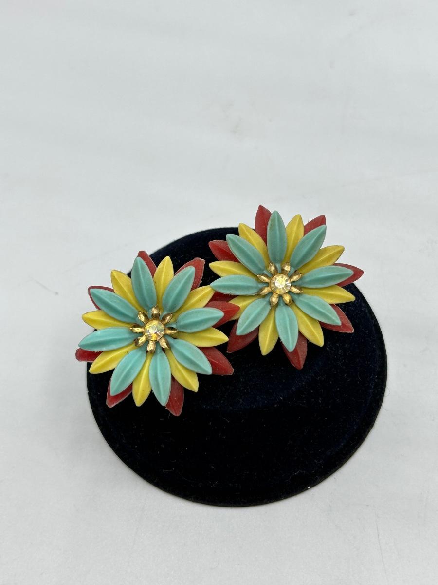 Vintage Coro Tricolor Vinyl Soft Plastic Flower Shaped Clip Style Fashion Earrings